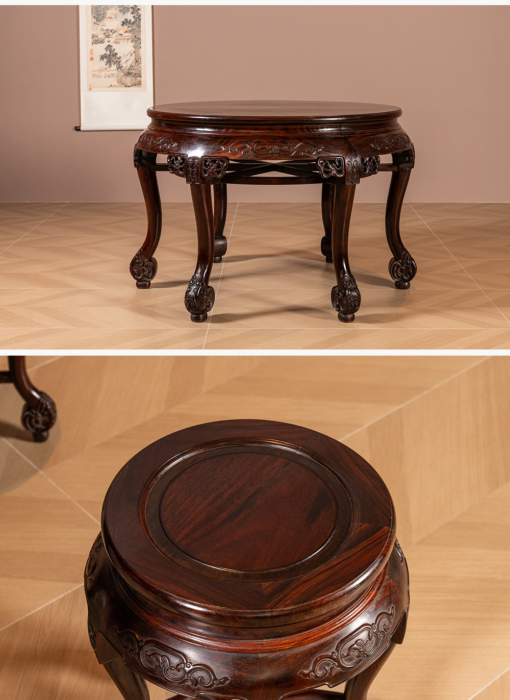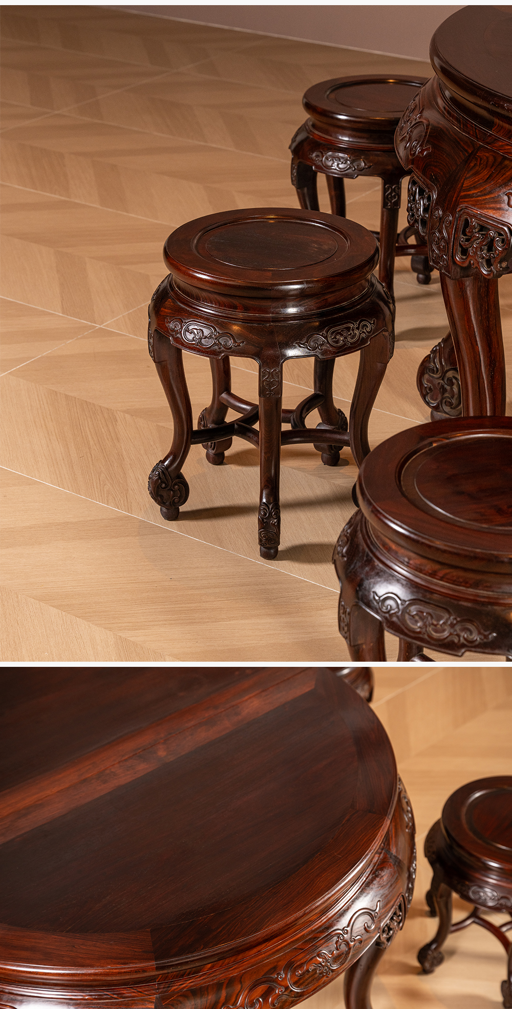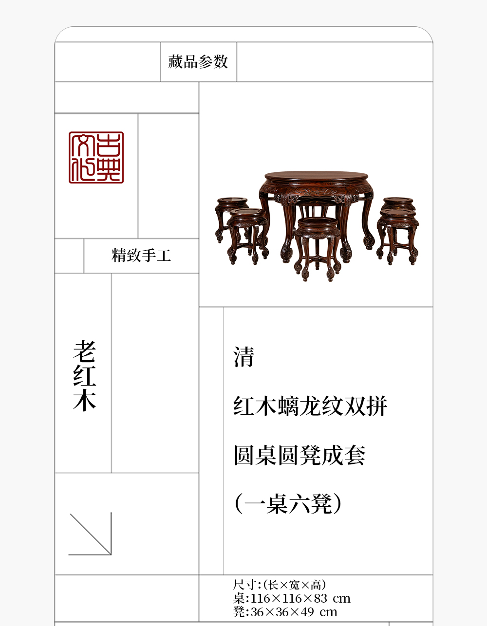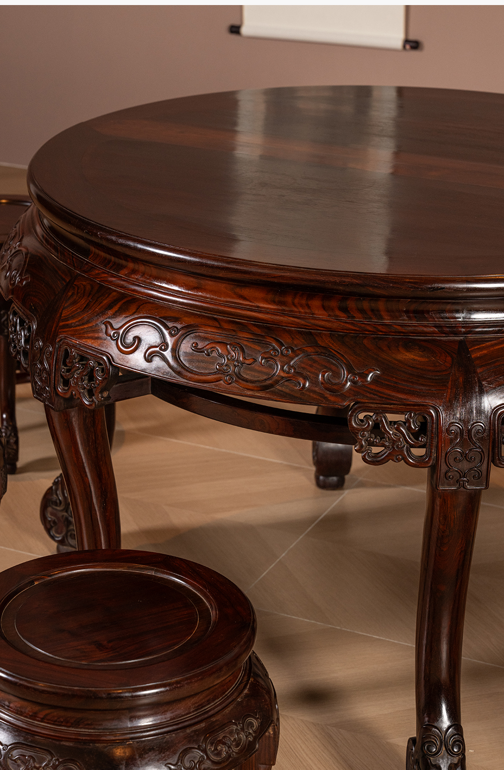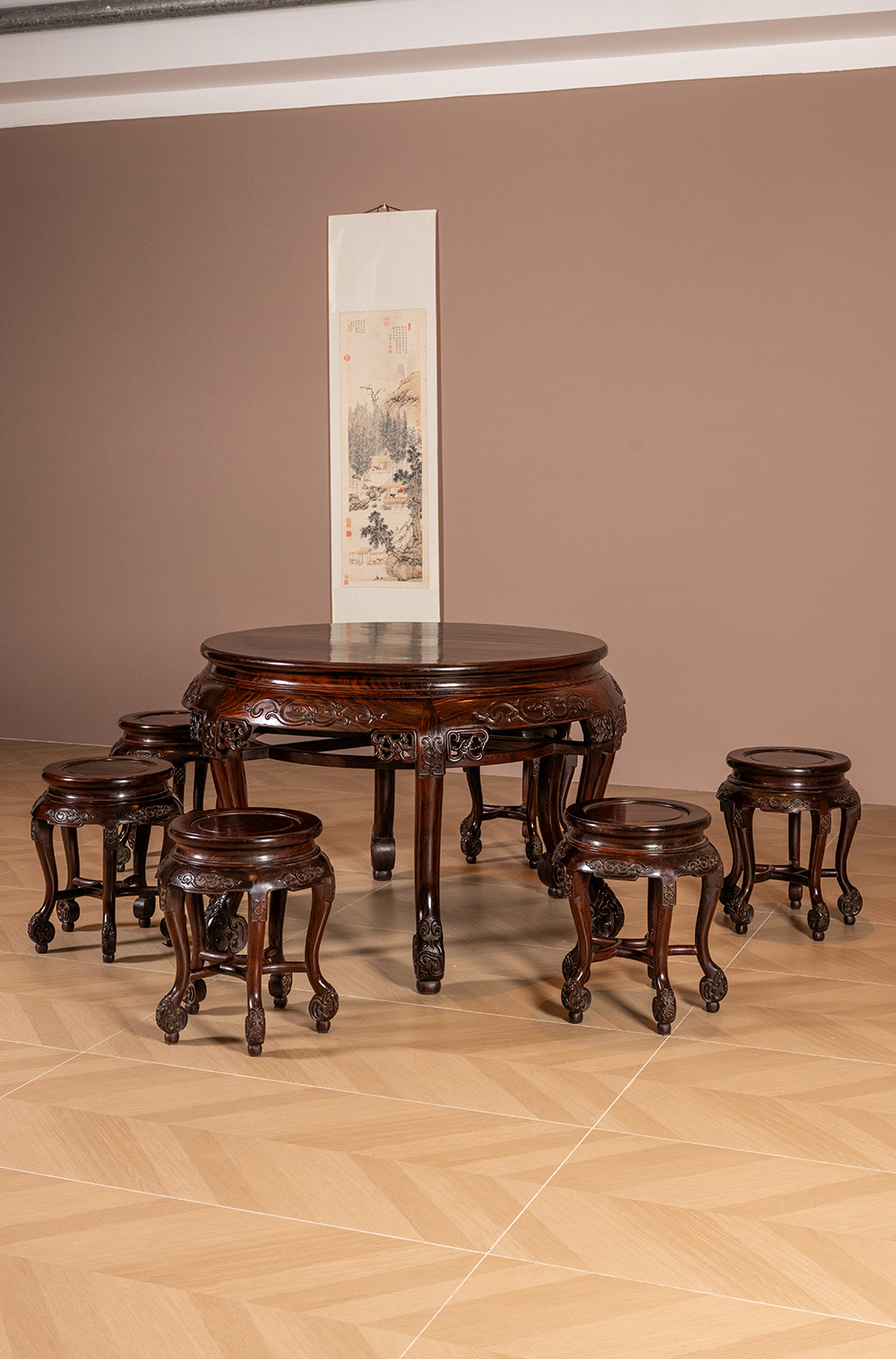 清 红木螭龙纹双拼圆桌圆凳成套(一桌六凳)