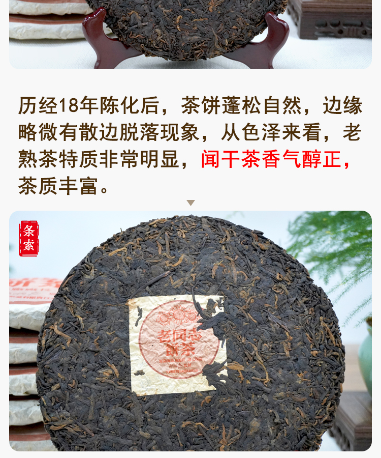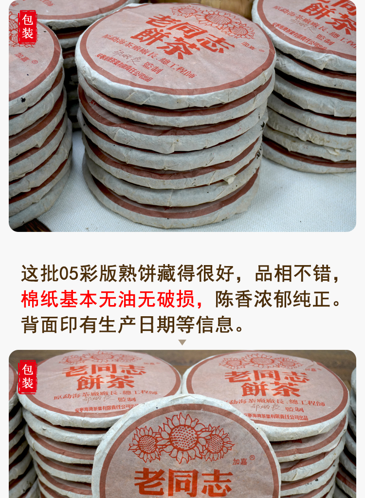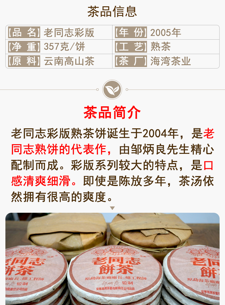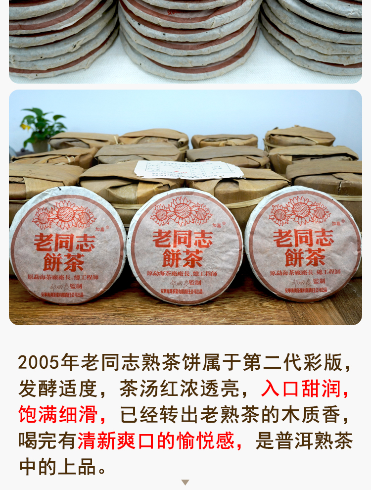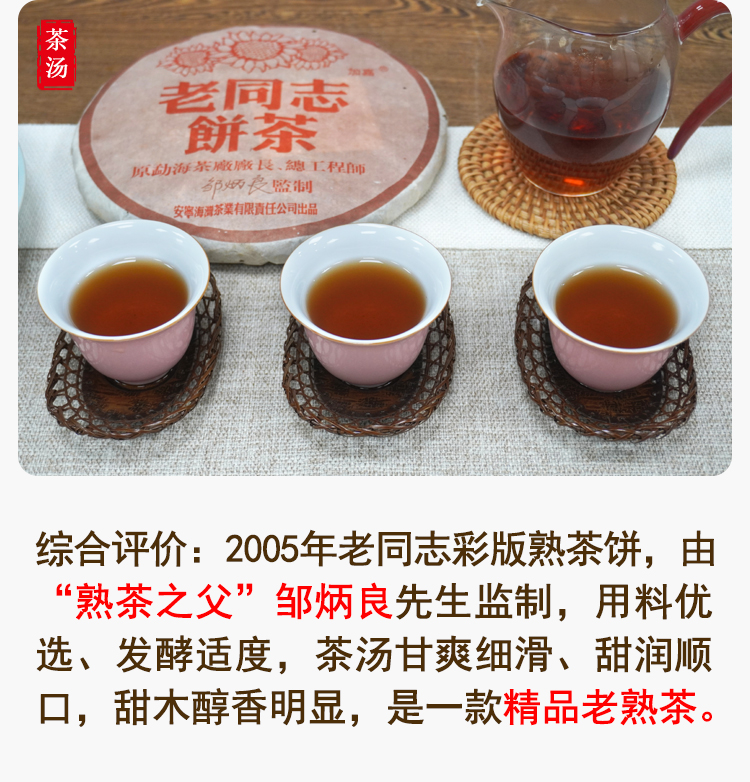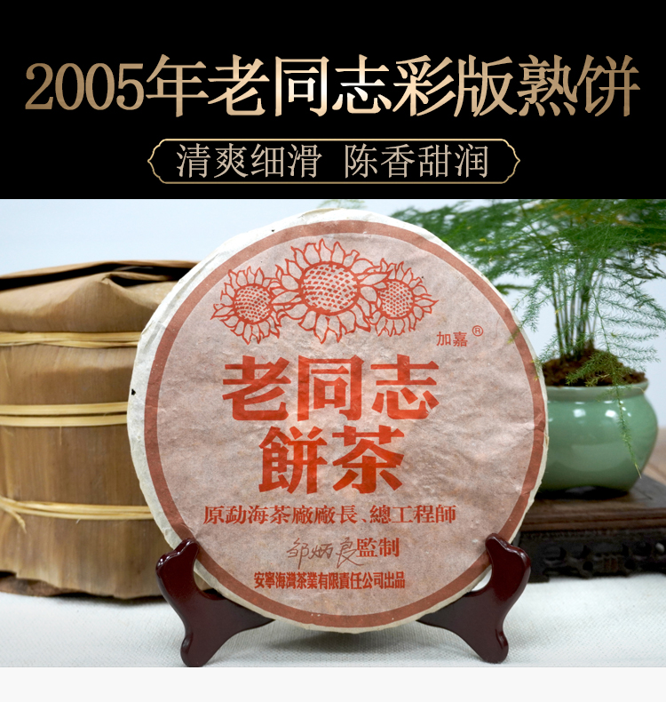 2005年老同志彩版普洱茶熟茶饼 稠糯细滑甜润 经典老同志老熟茶标杆 干仓真品茶香好品相