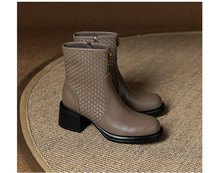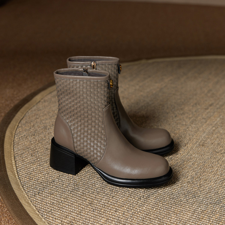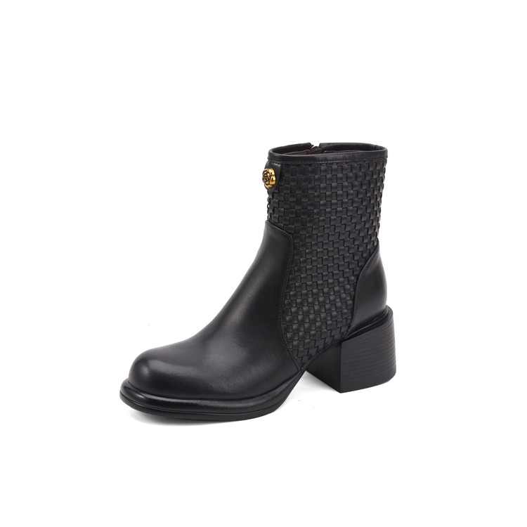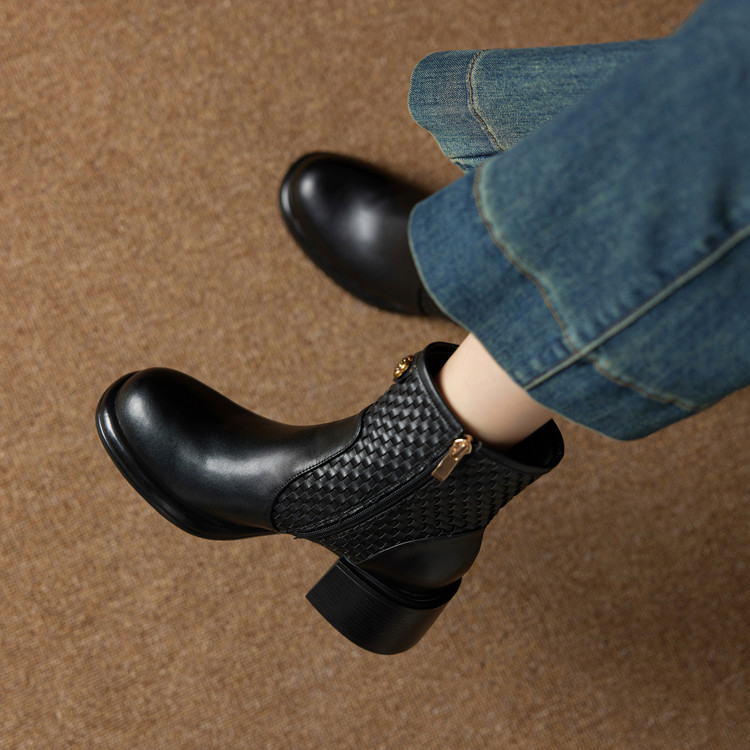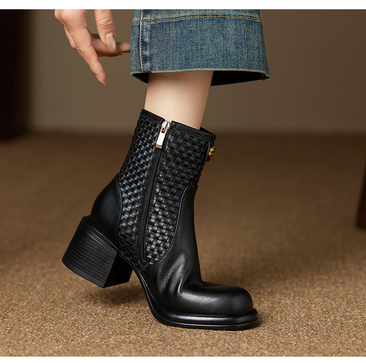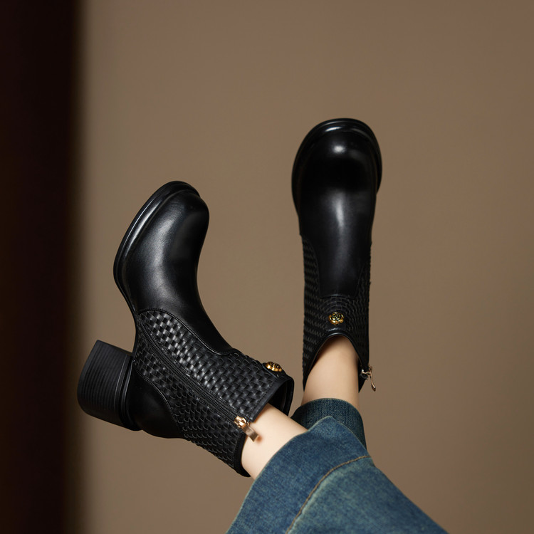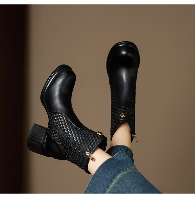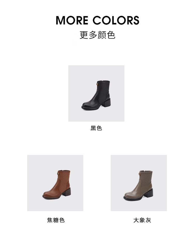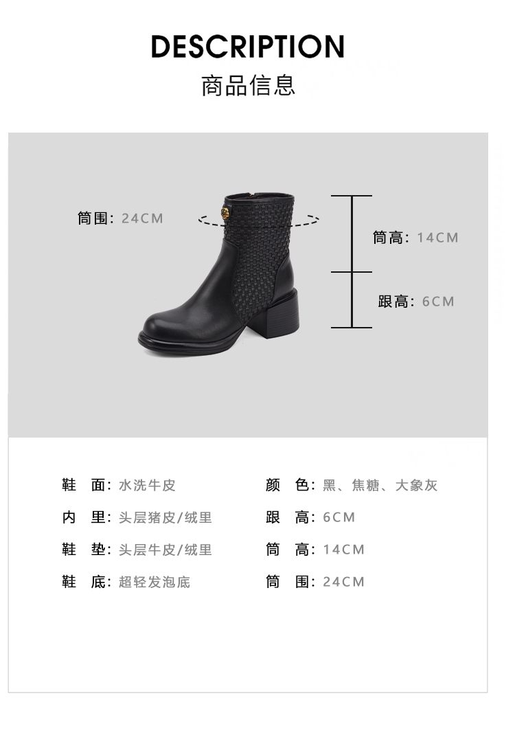 【预售5天】6cm圆头粗跟短靴女新款百搭高跟鞋编织时装切尔西靴MLD&AC1795