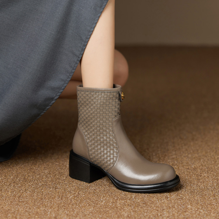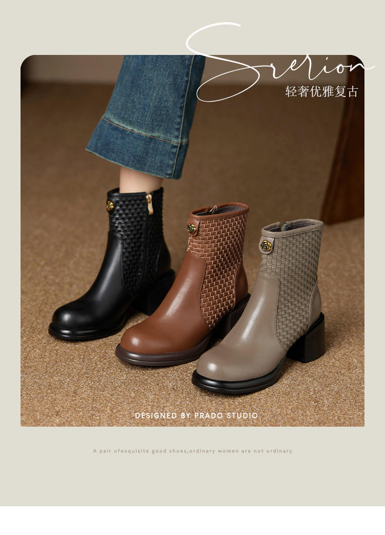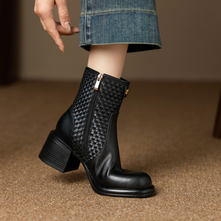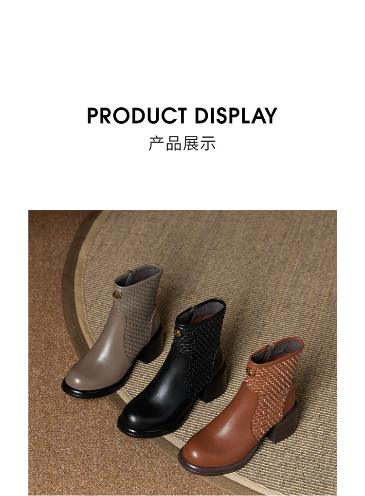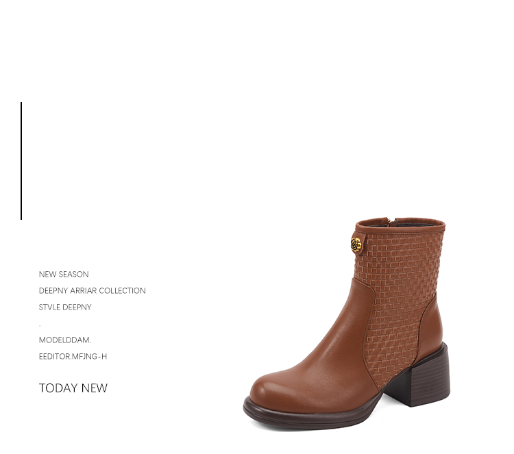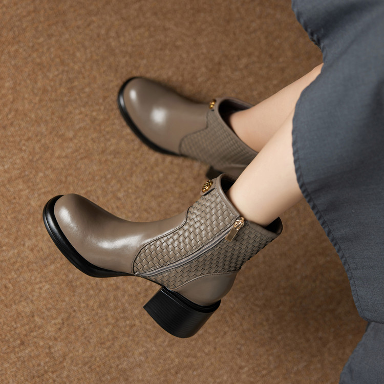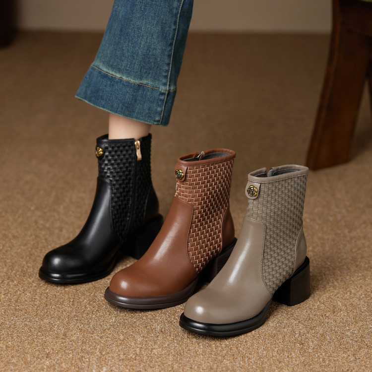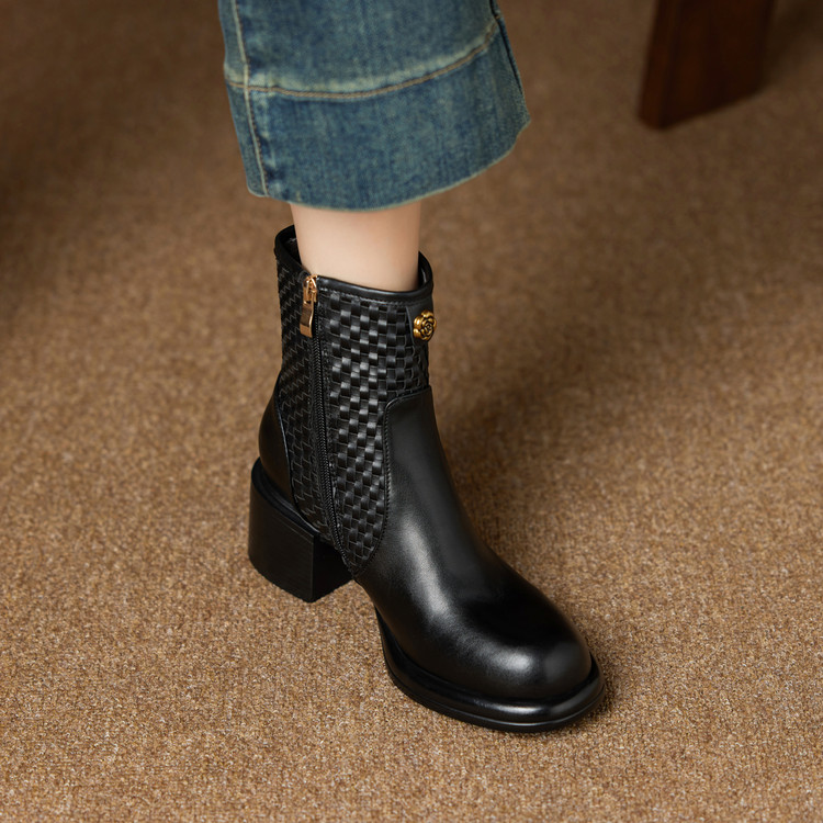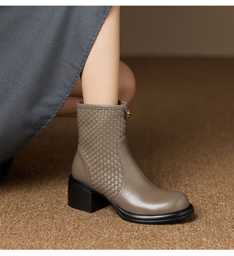【预售5天】6cm圆头粗跟短靴女新款百搭高跟鞋编织时装切尔西靴MLD&AC1795