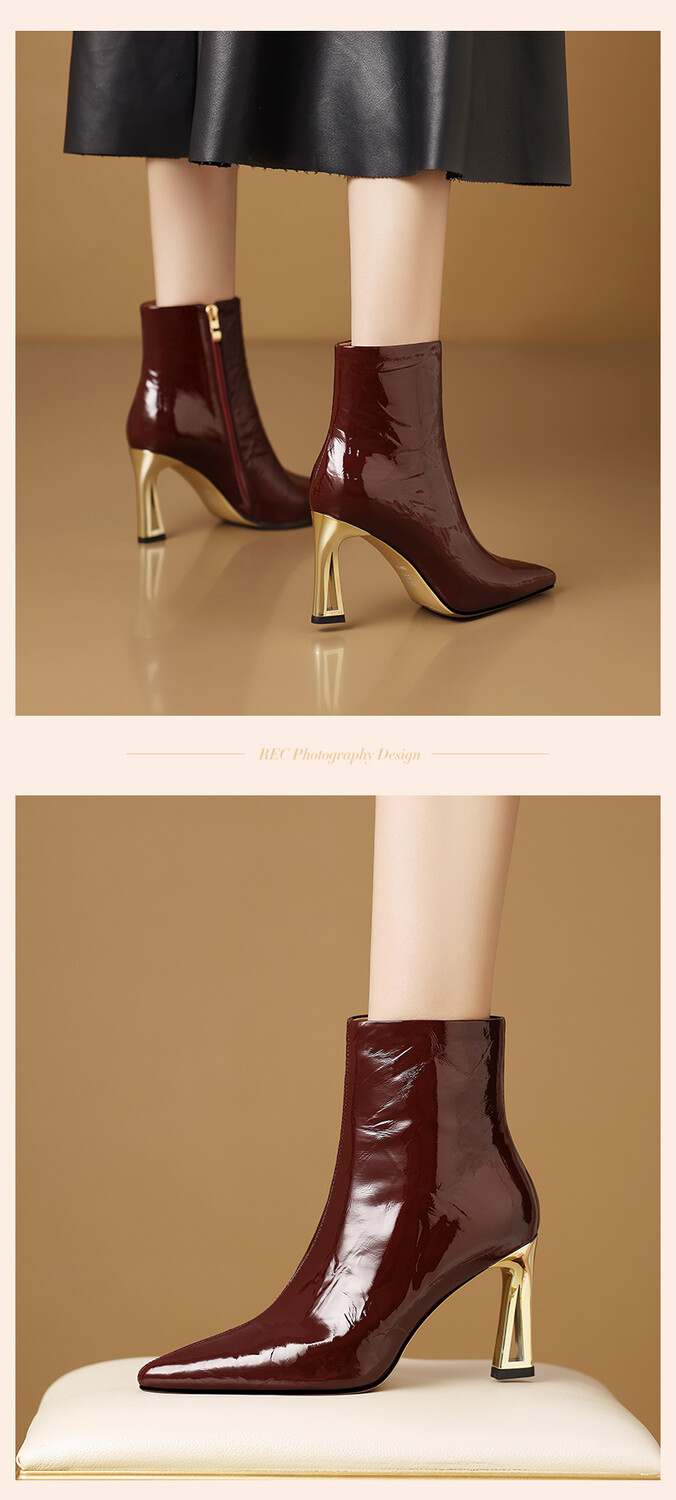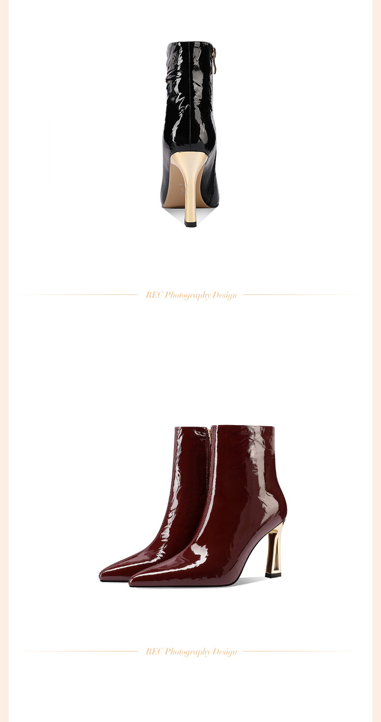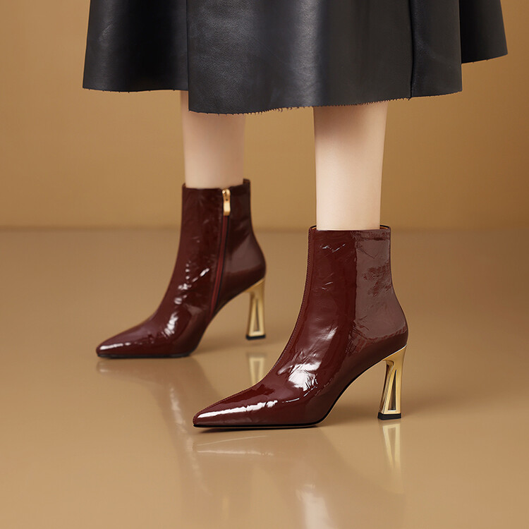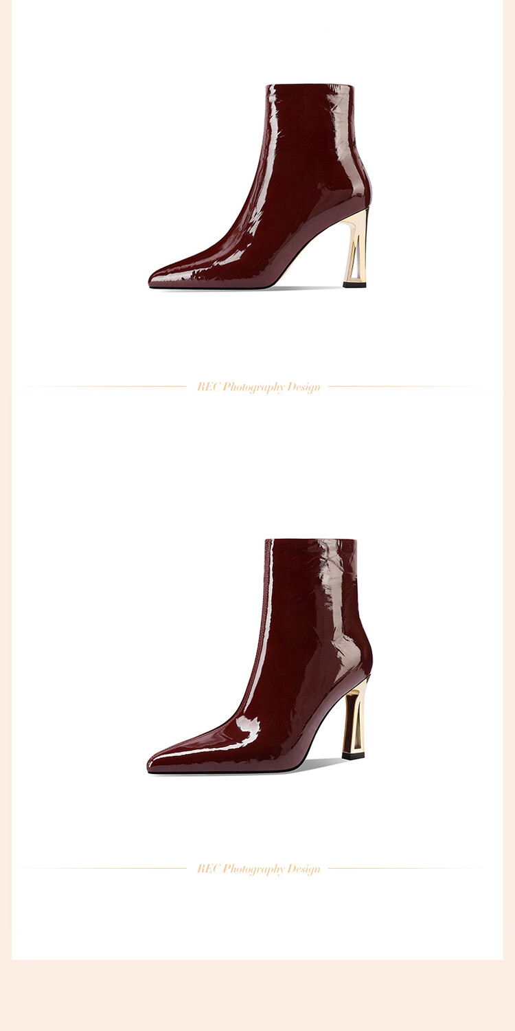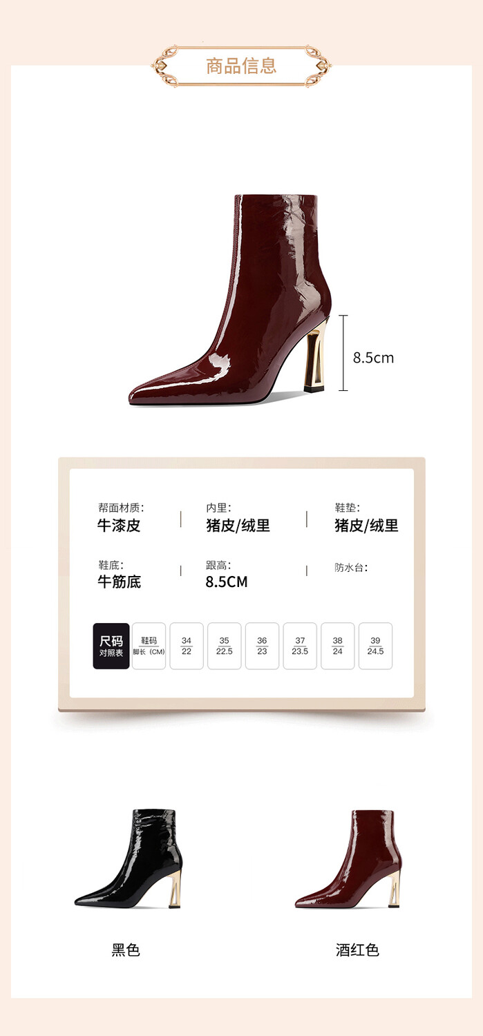 【预售5天】法式尖头高跟短靴女皱漆皮粗跟不累脚显瘦增高侧拉链简约酒红裸靴HY&H3528