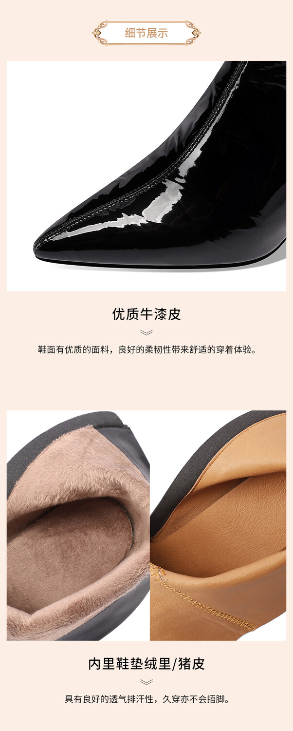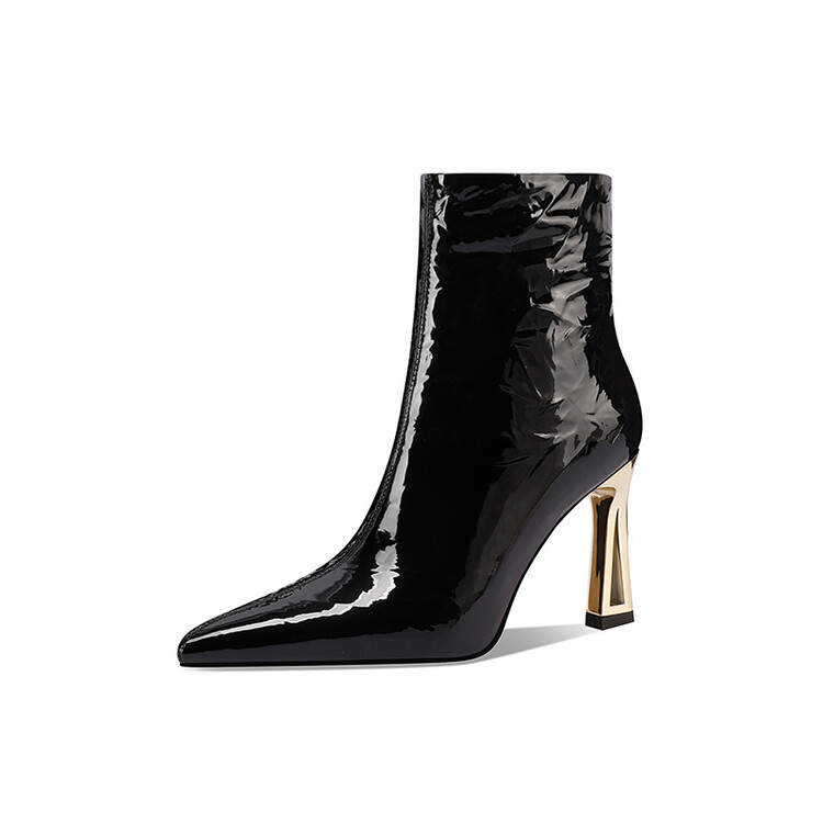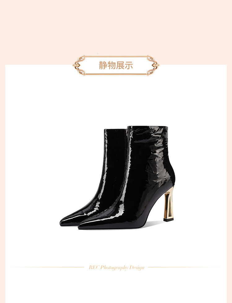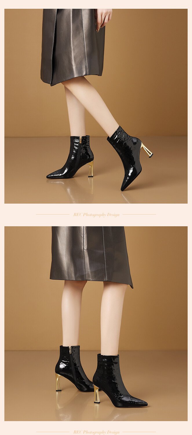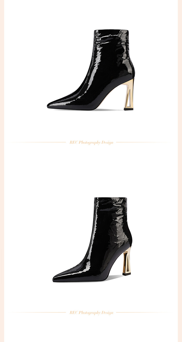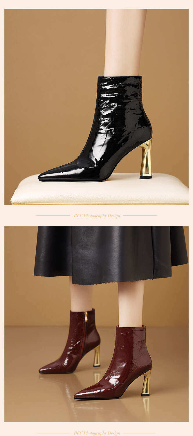 【预售5天】法式尖头高跟短靴女皱漆皮粗跟不累脚显瘦增高侧拉链简约酒红裸靴HY&H3528