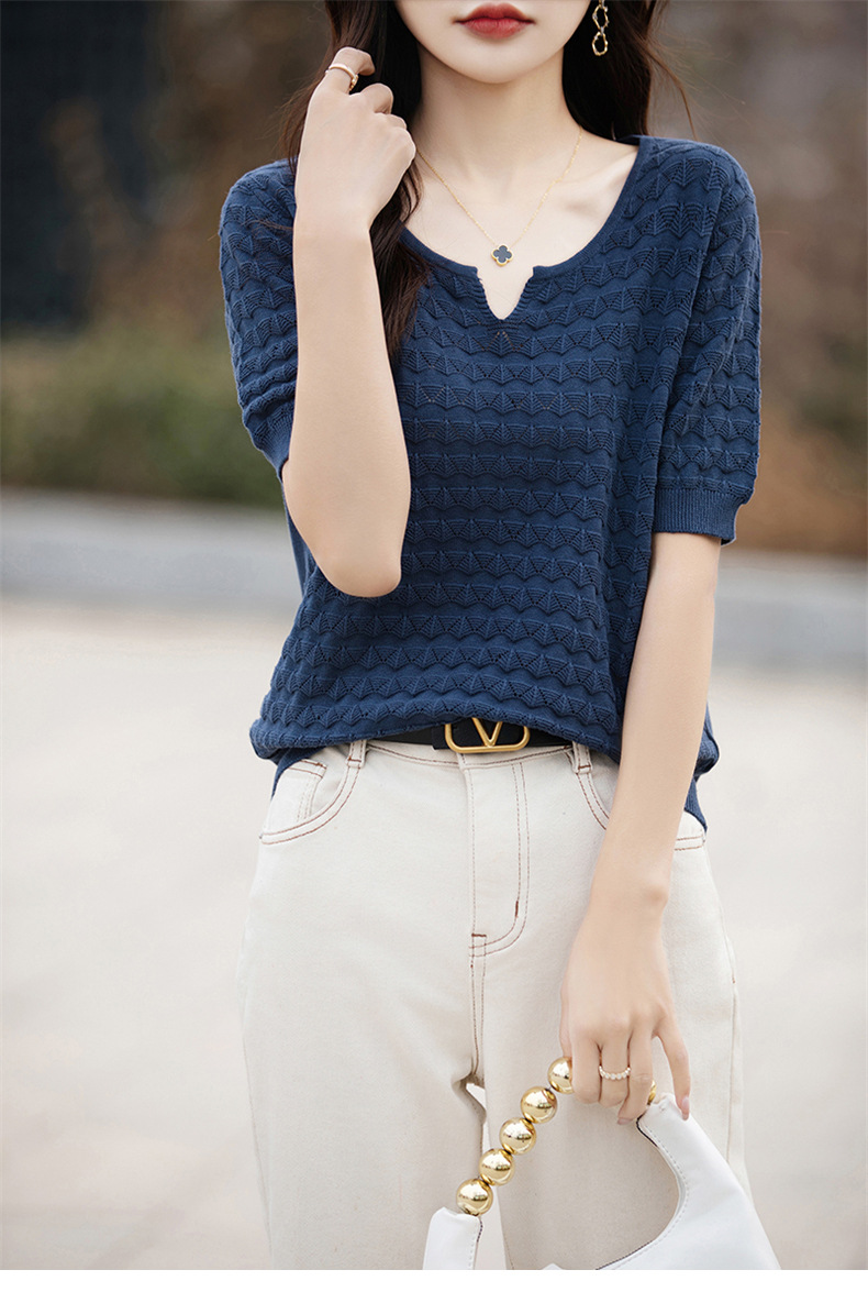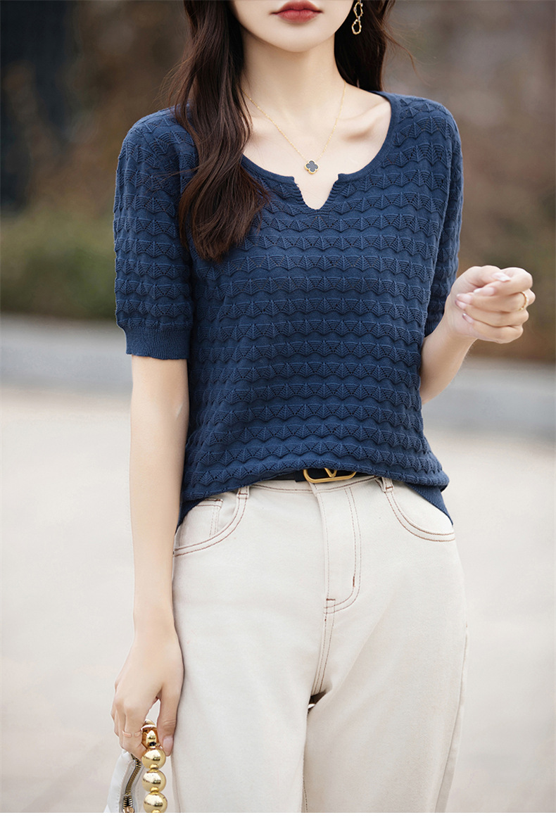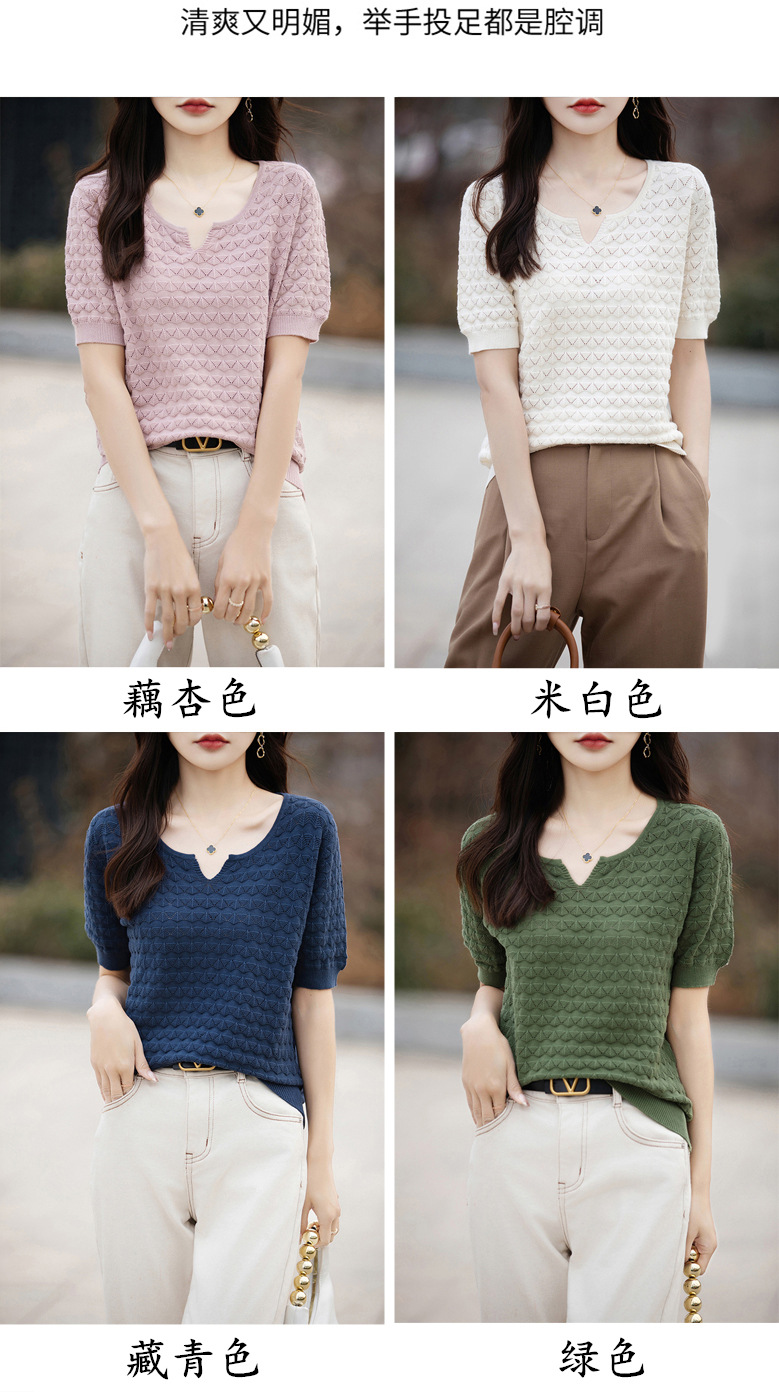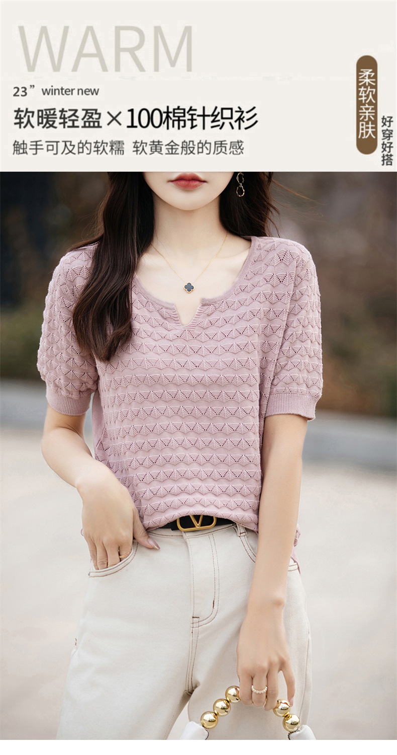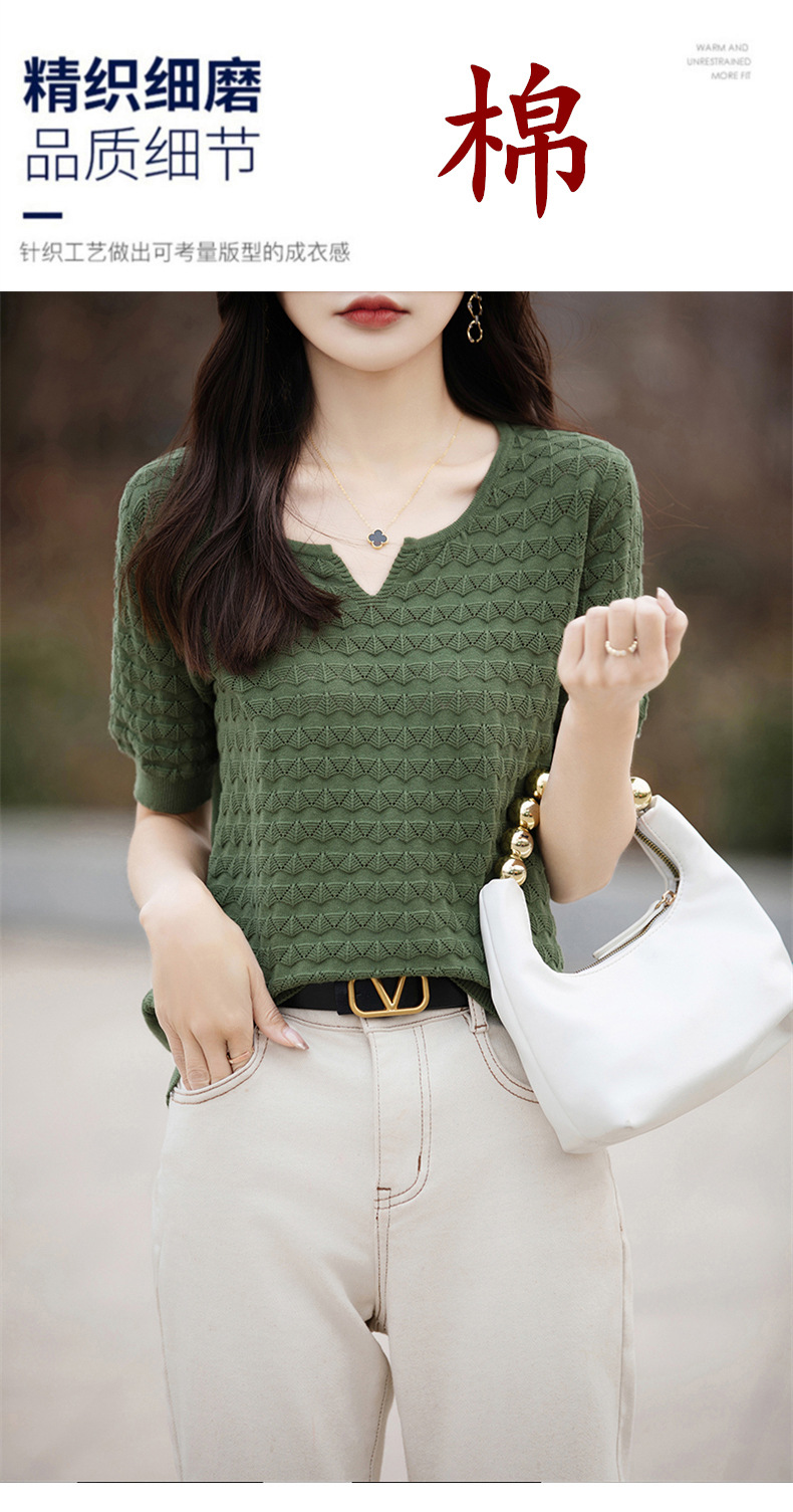 QHJY-JY1064全棉圆领针织衫T恤女2024夏季薄款短袖t恤洋气鸡心领气质棉短袖女