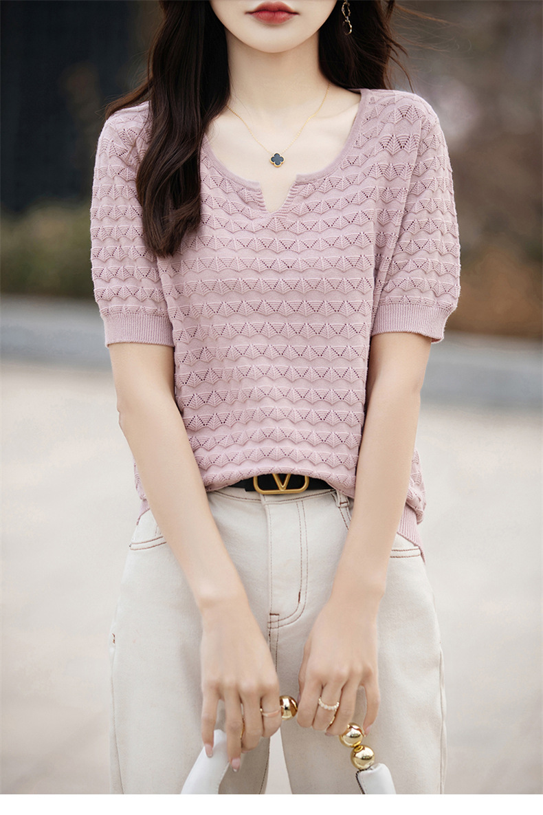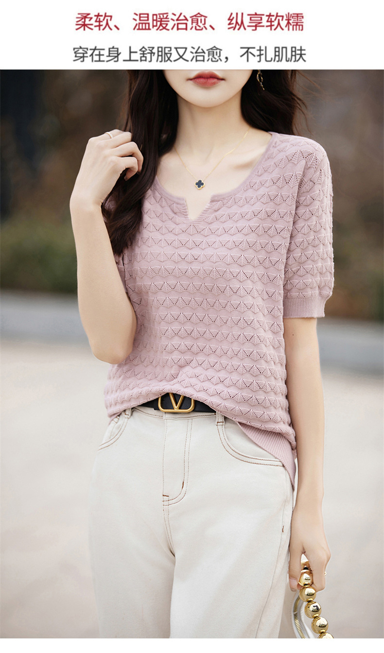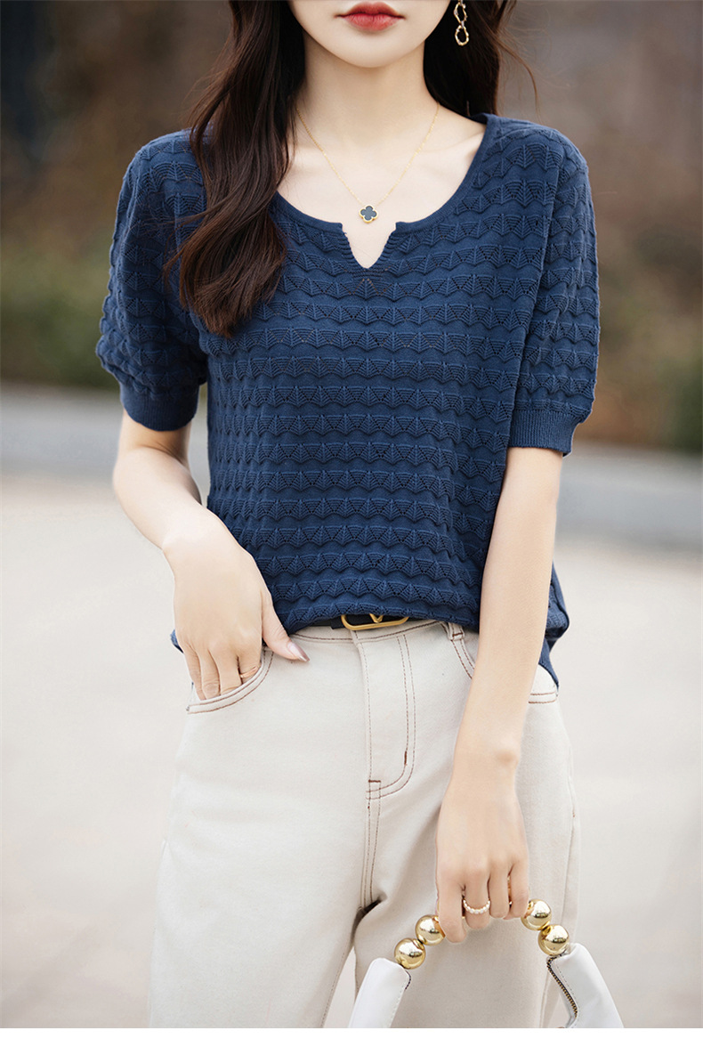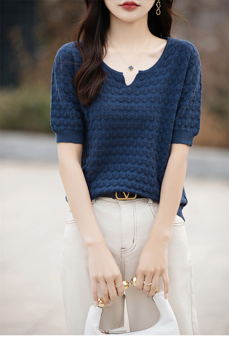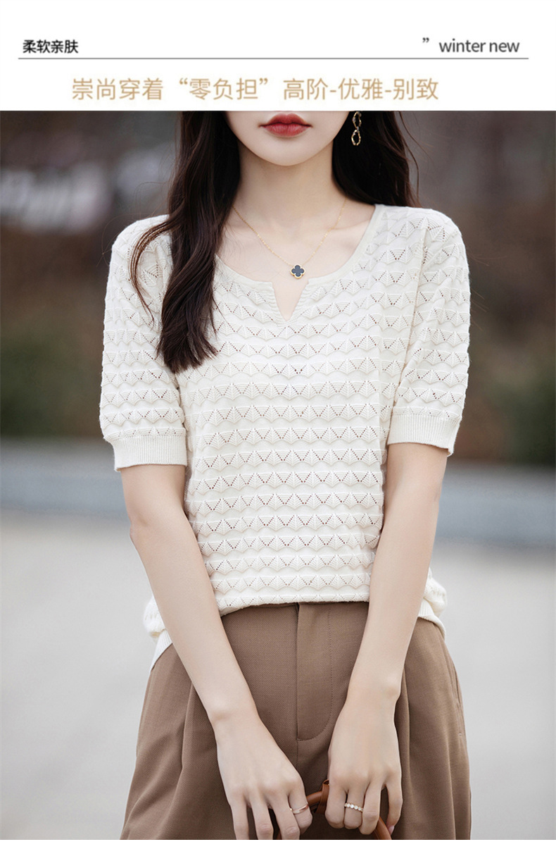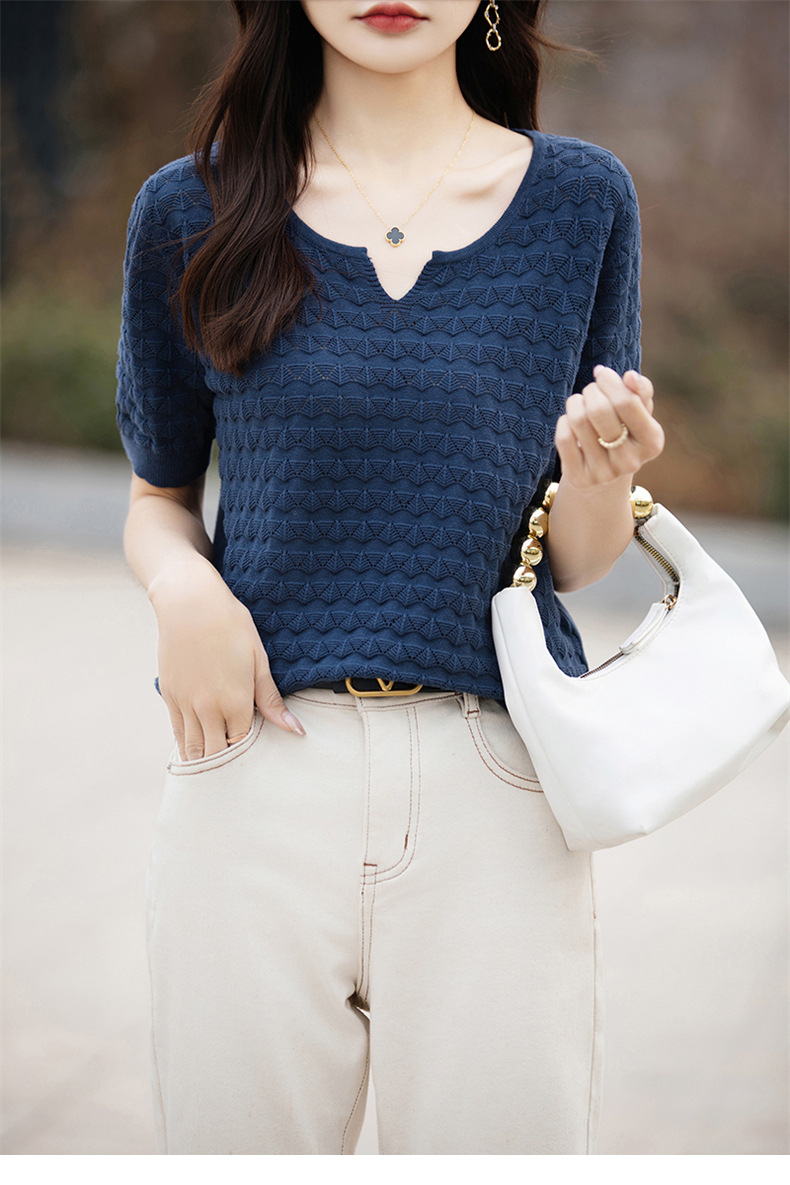 QHJY-JY1064全棉圆领针织衫T恤女2024夏季薄款短袖t恤洋气鸡心领气质棉短袖女