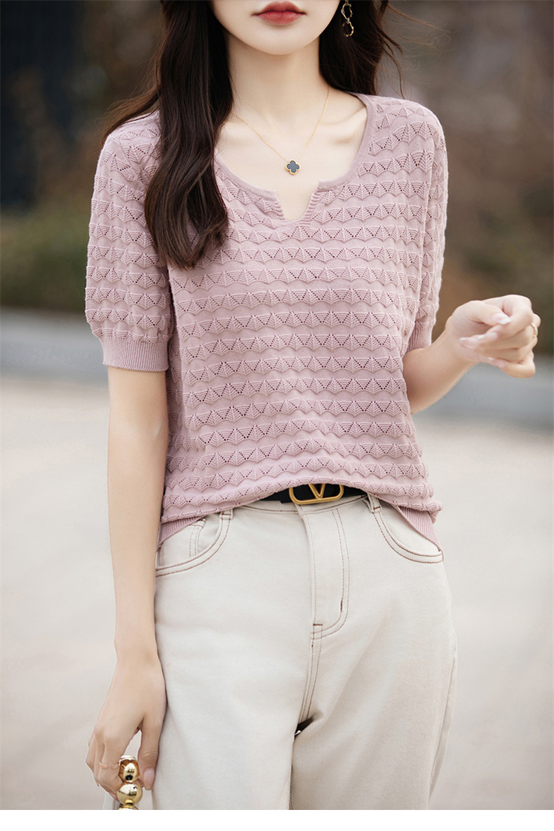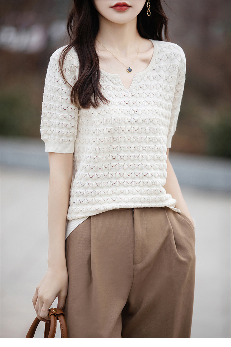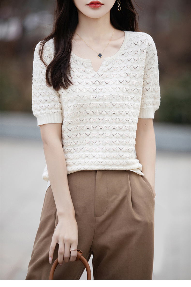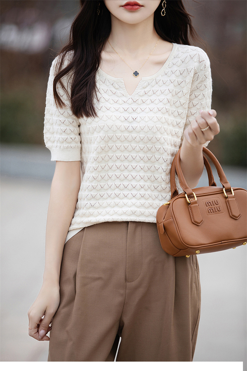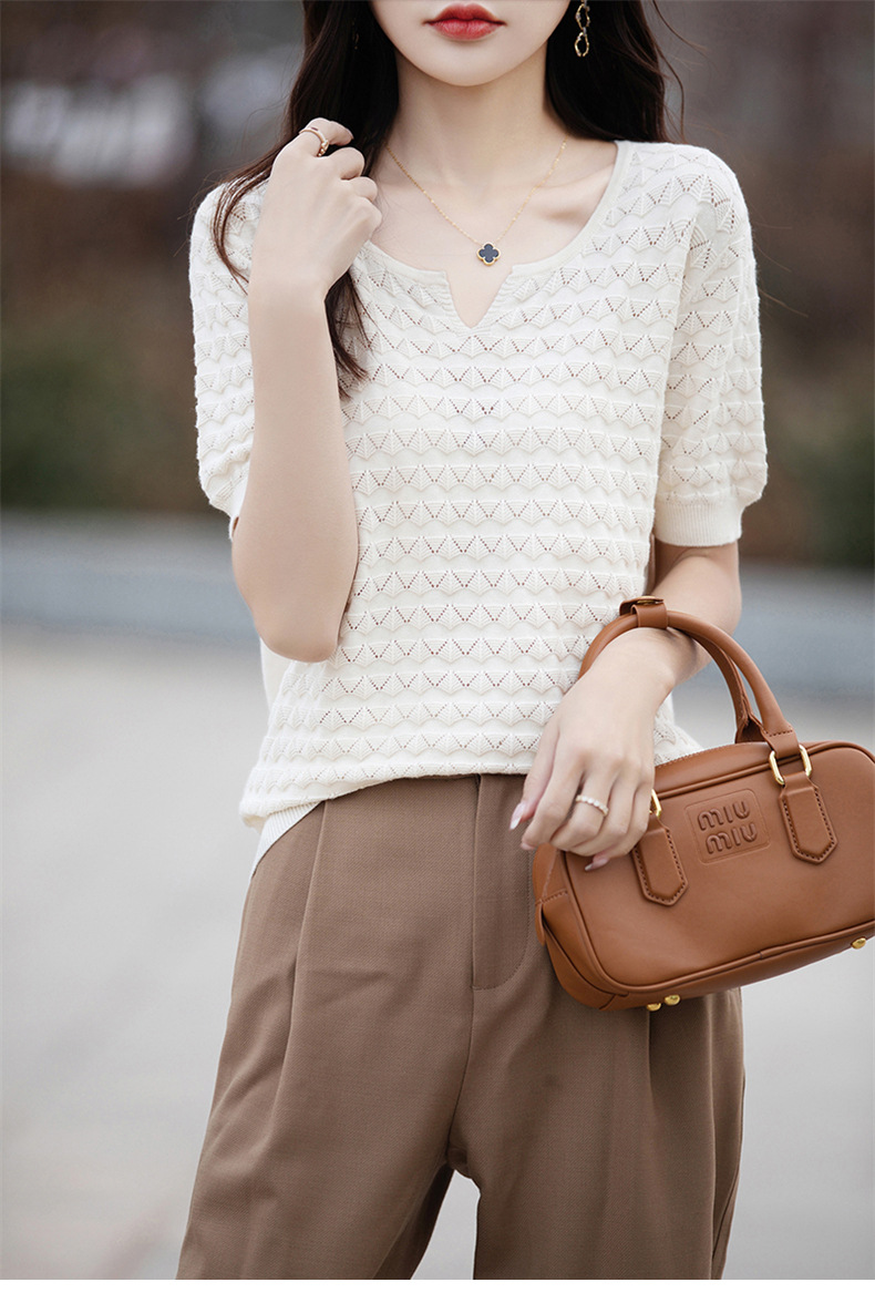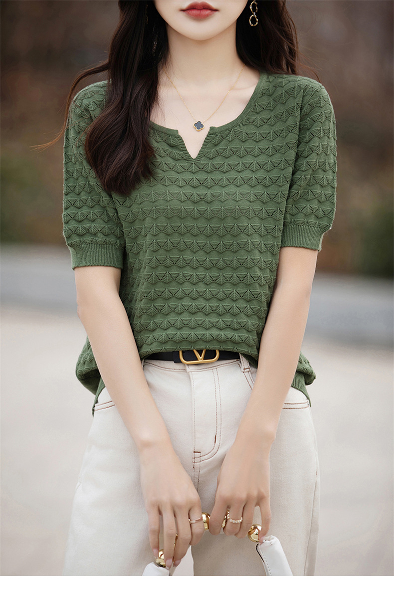 QHJY-JY1064全棉圆领针织衫T恤女2024夏季薄款短袖t恤洋气鸡心领气质棉短袖女