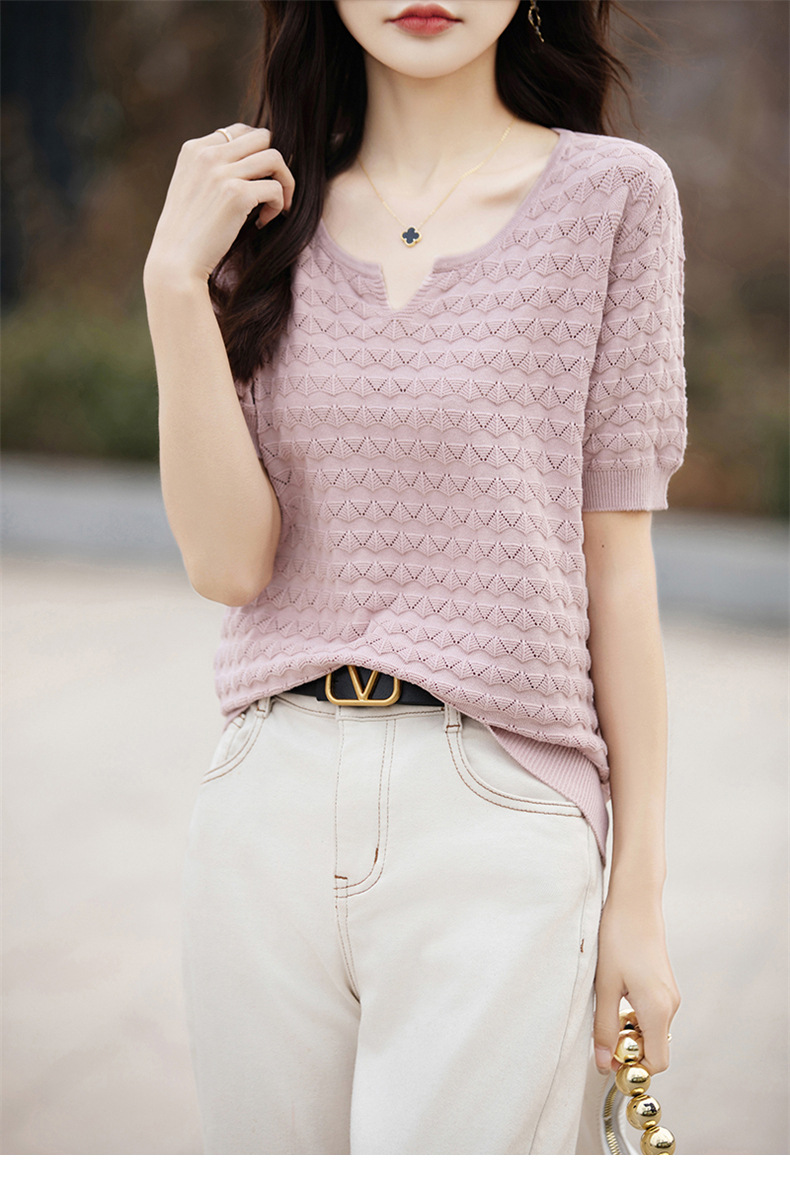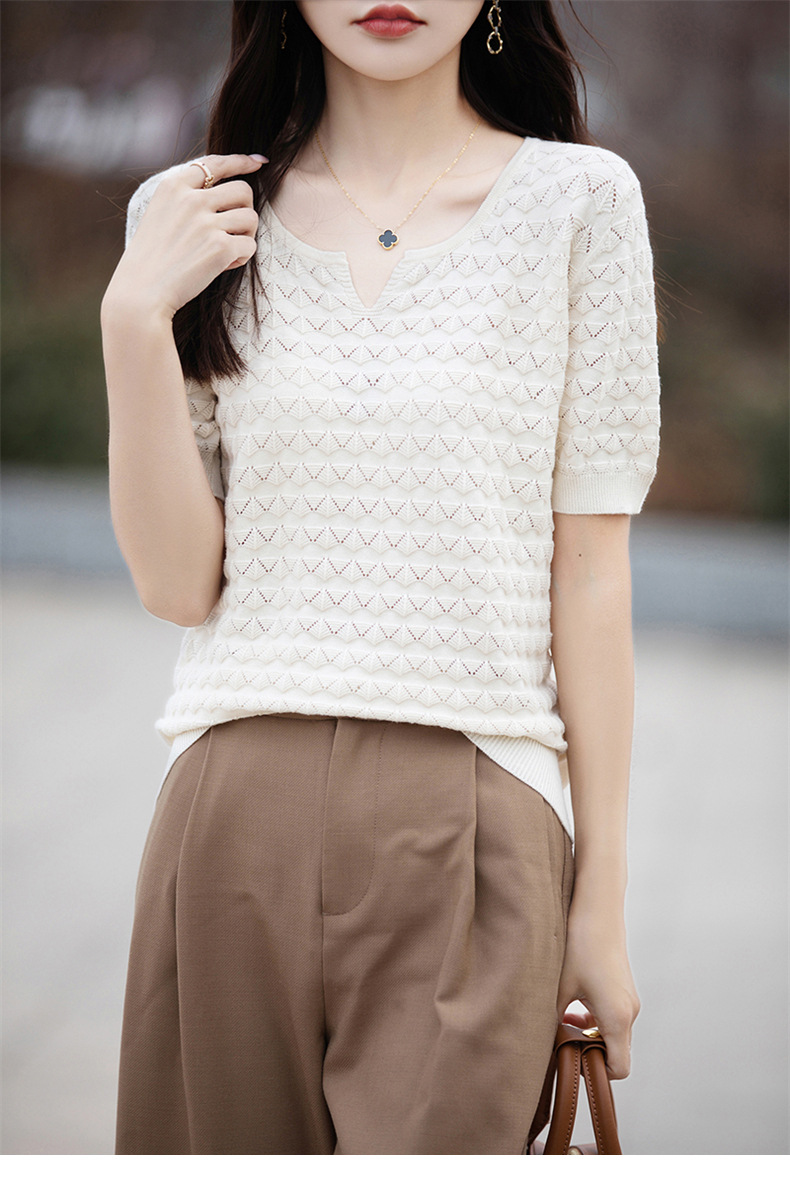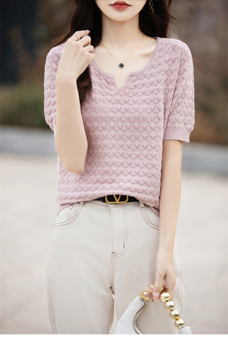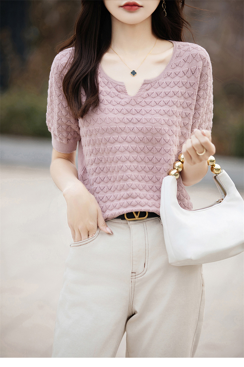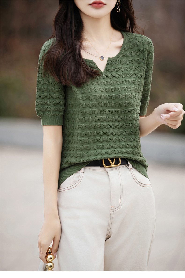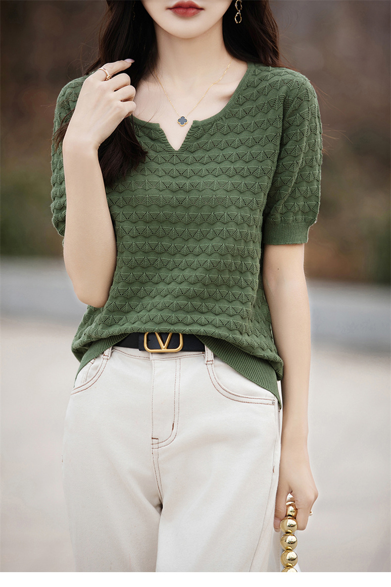 QHJY-JY1064全棉圆领针织衫T恤女2024夏季薄款短袖t恤洋气鸡心领气质棉短袖女