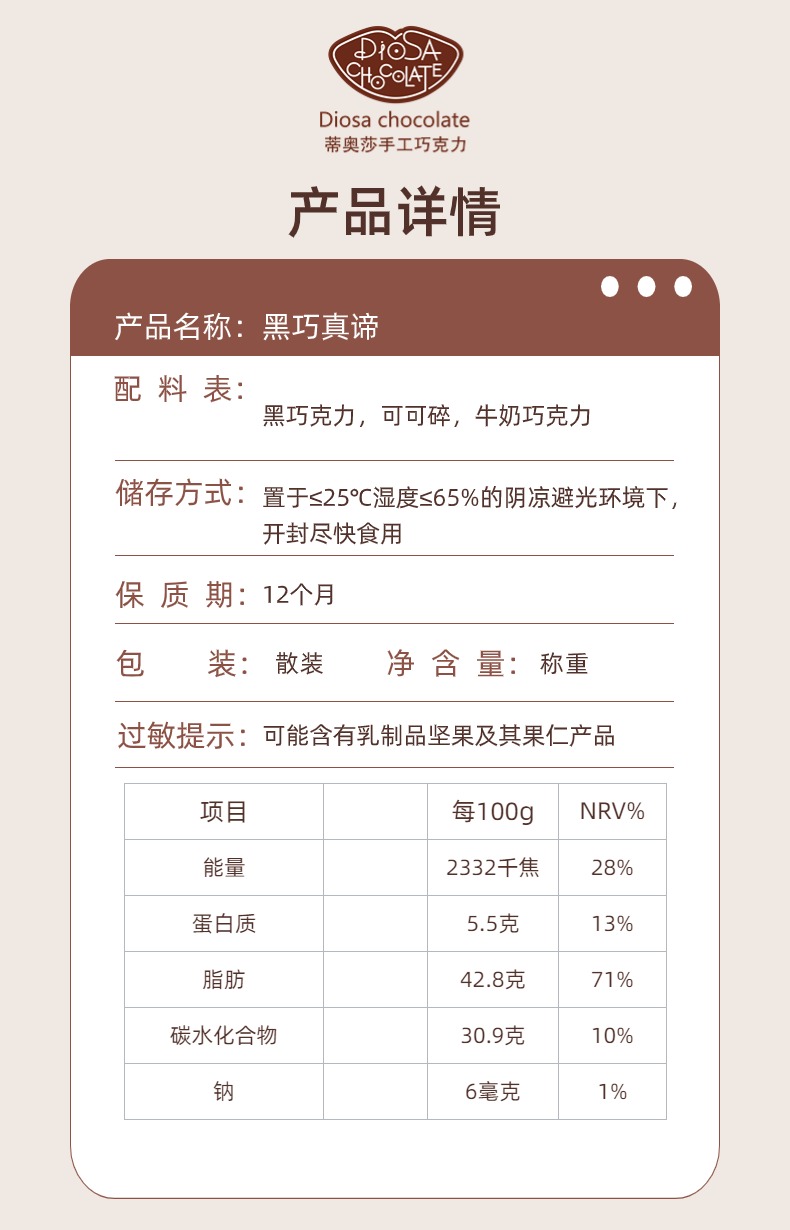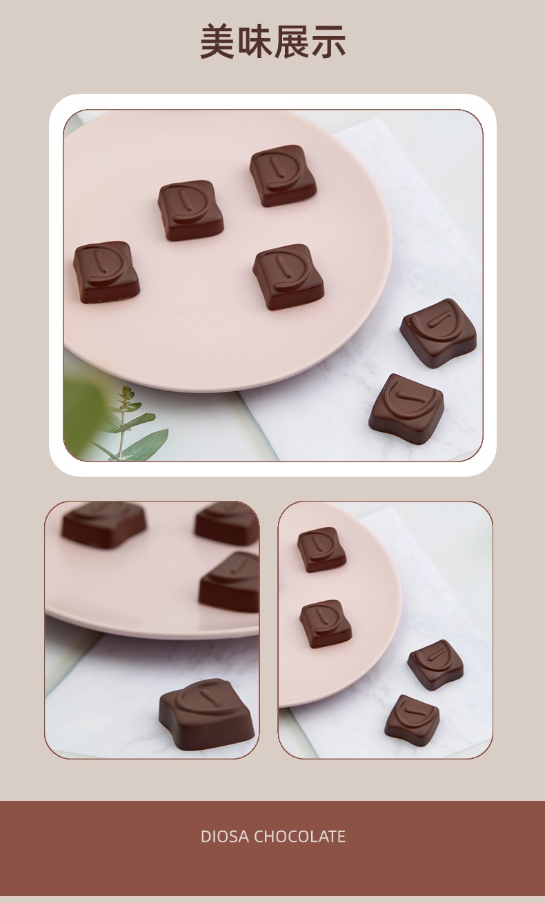 DIOSA(蒂奥莎)巧克力在西班牙语中是“女神”的意思。DIOSA品牌一直致力于纯脂手工巧克力的研发和推广,全部原料来自比利时,意大利,西班牙等欧洲传统巧克力王国,运用比利时传统工艺纯手工制作。
