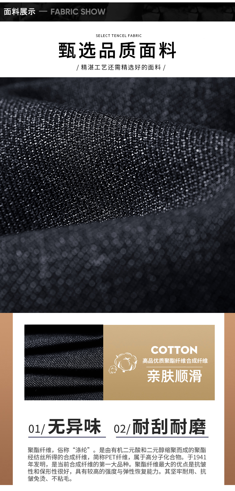 面料:88.2%聚酯纤维9.3%粘纤2.5 %氨纶(其他配料除外)