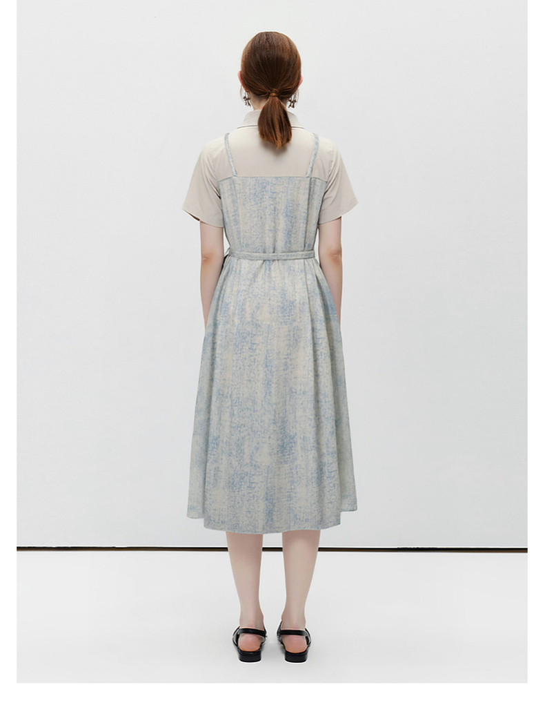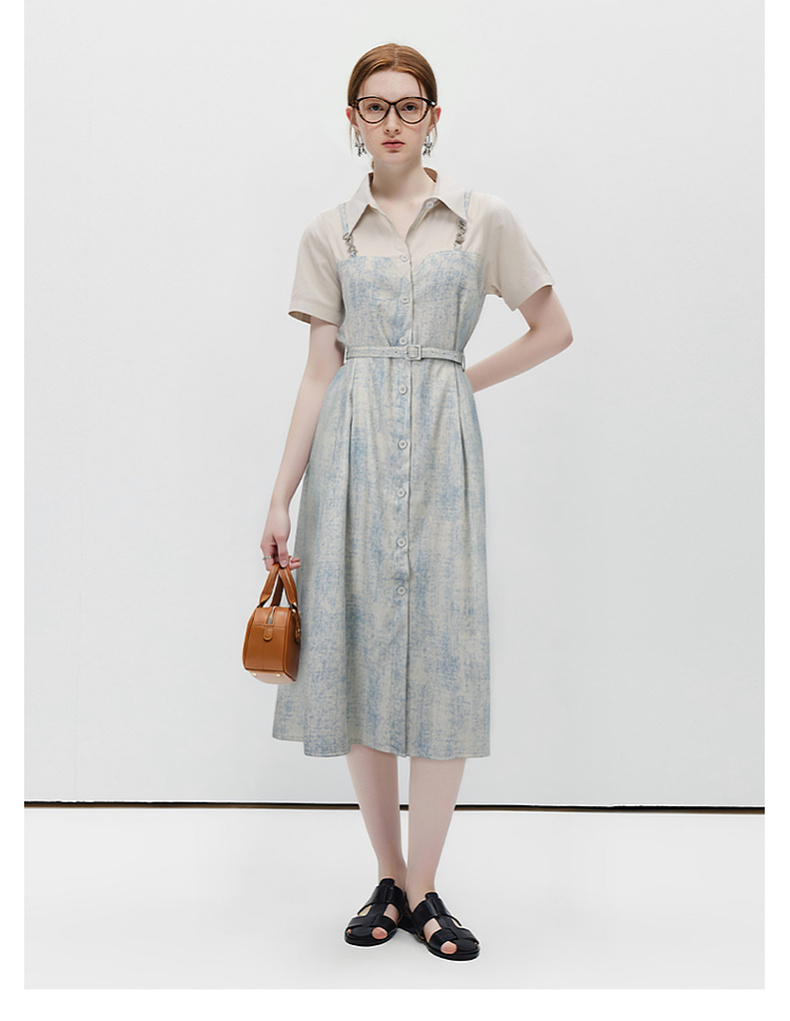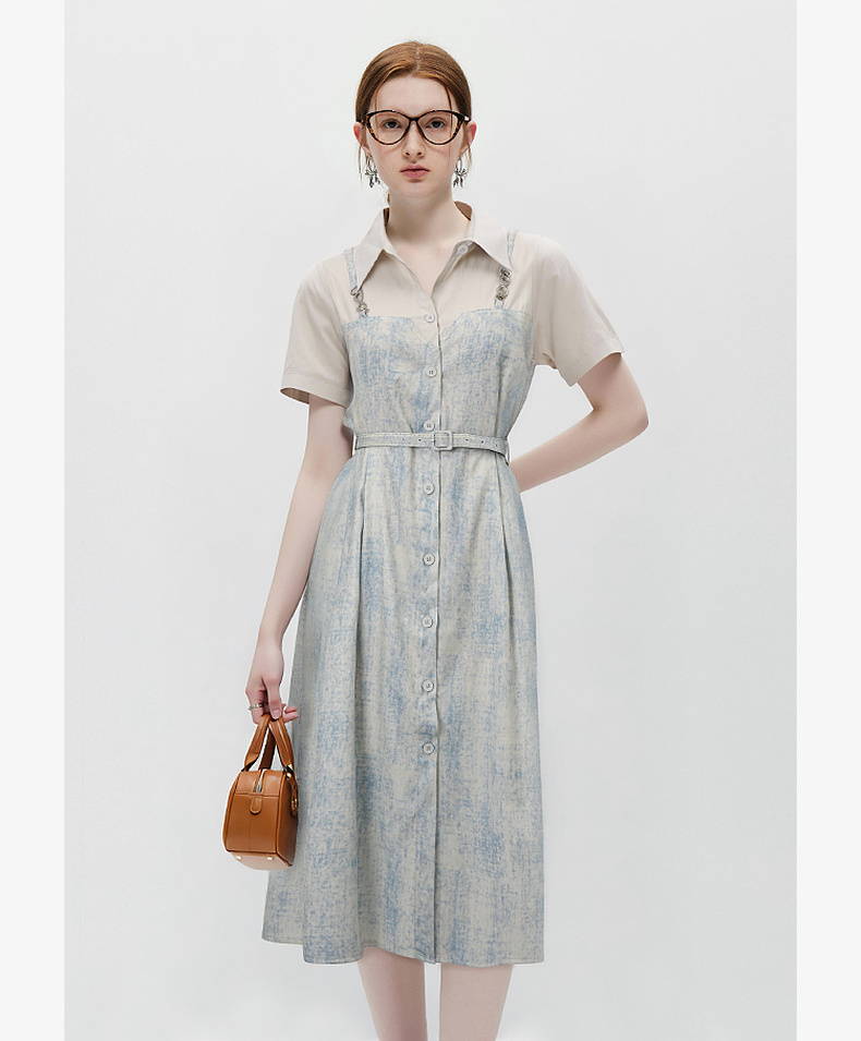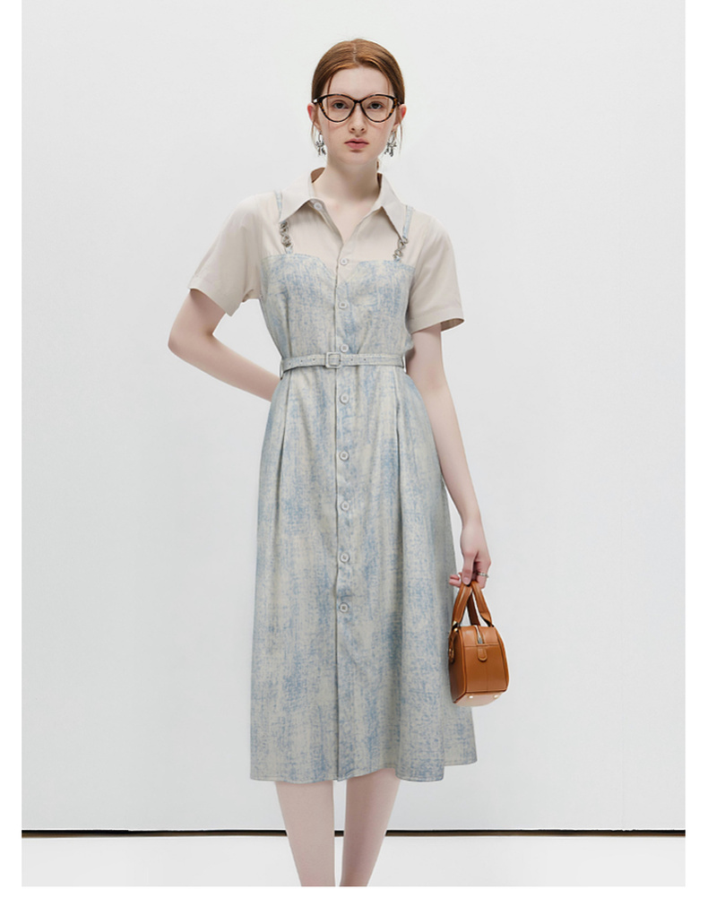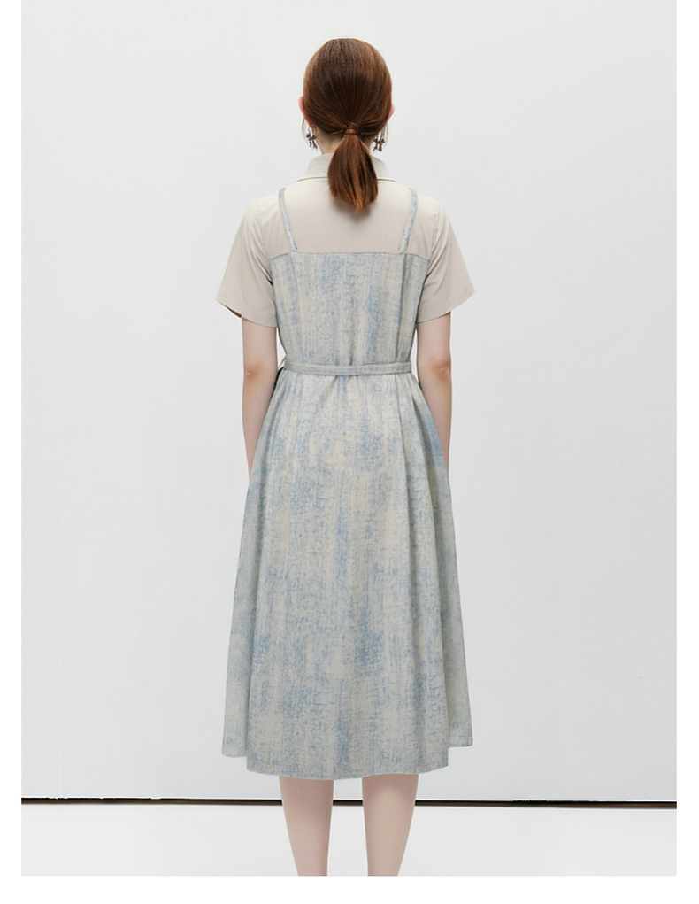会员福利【官网700+高品质】拉夏贝尔/La Chapelle翻领拼接假两件短袖连衣裙女小众设计感时尚长裙2025新款