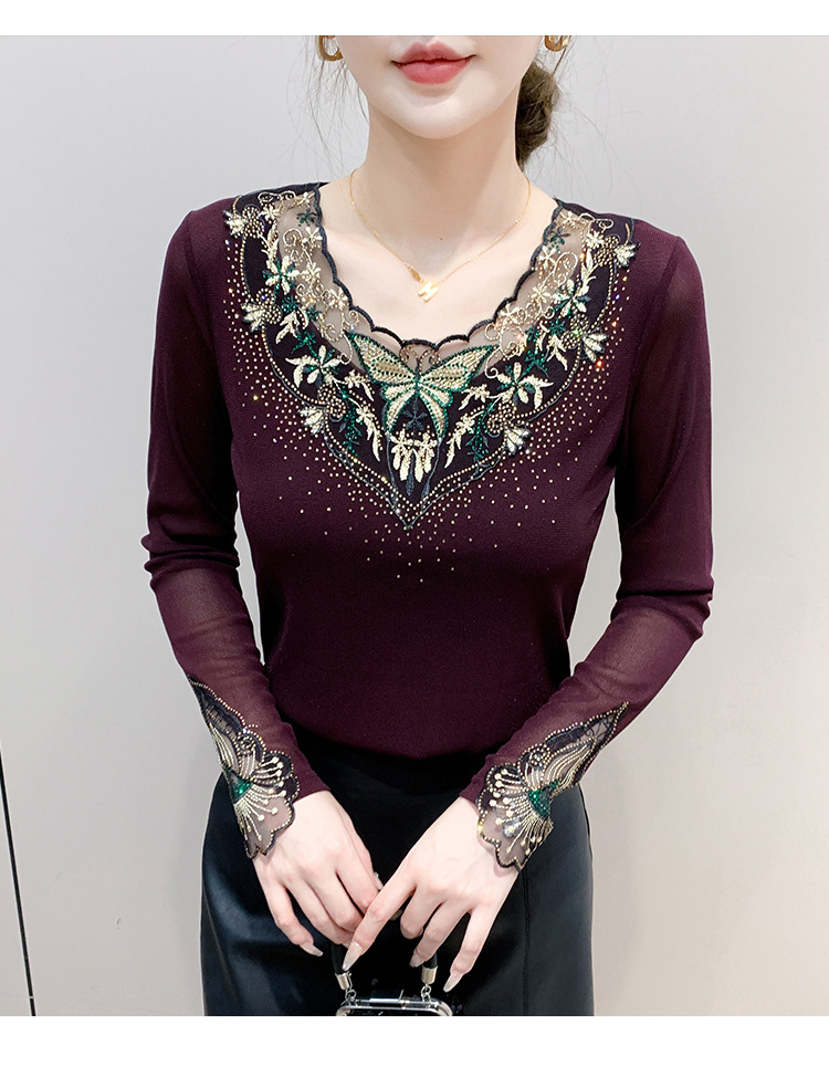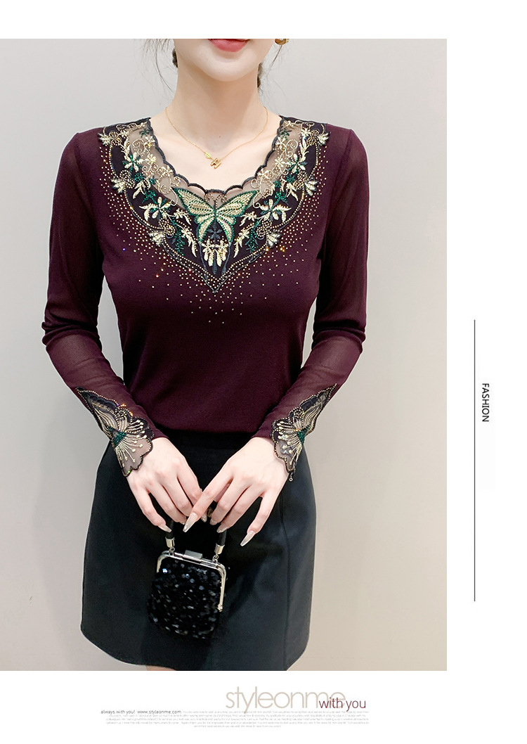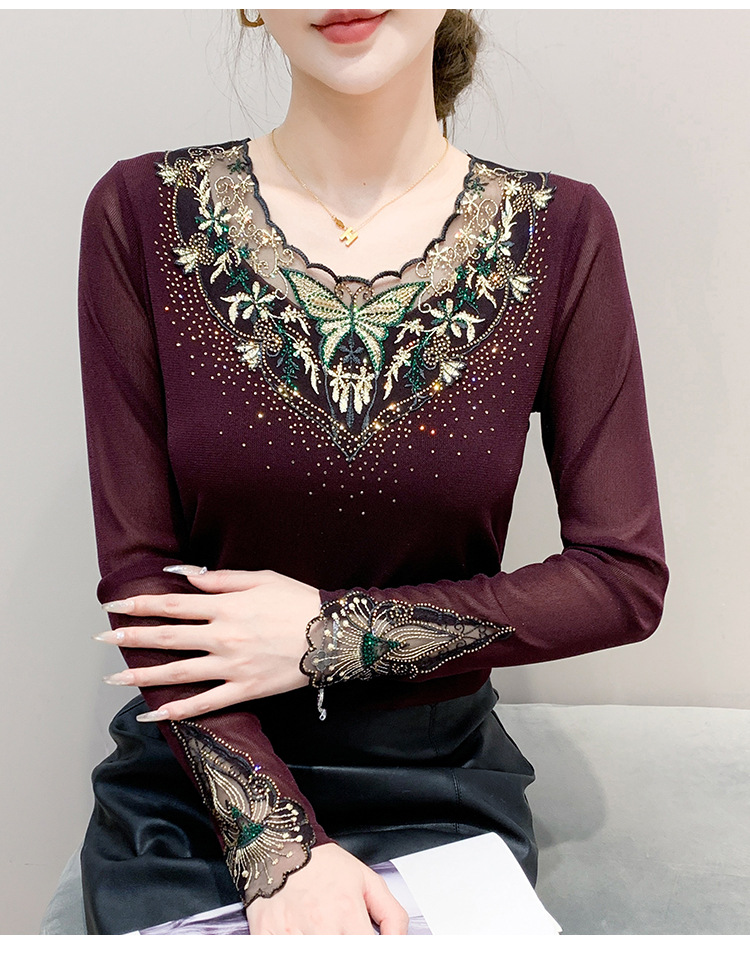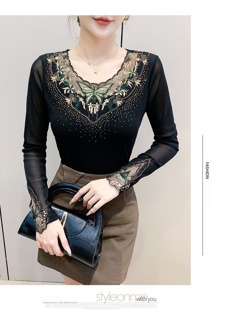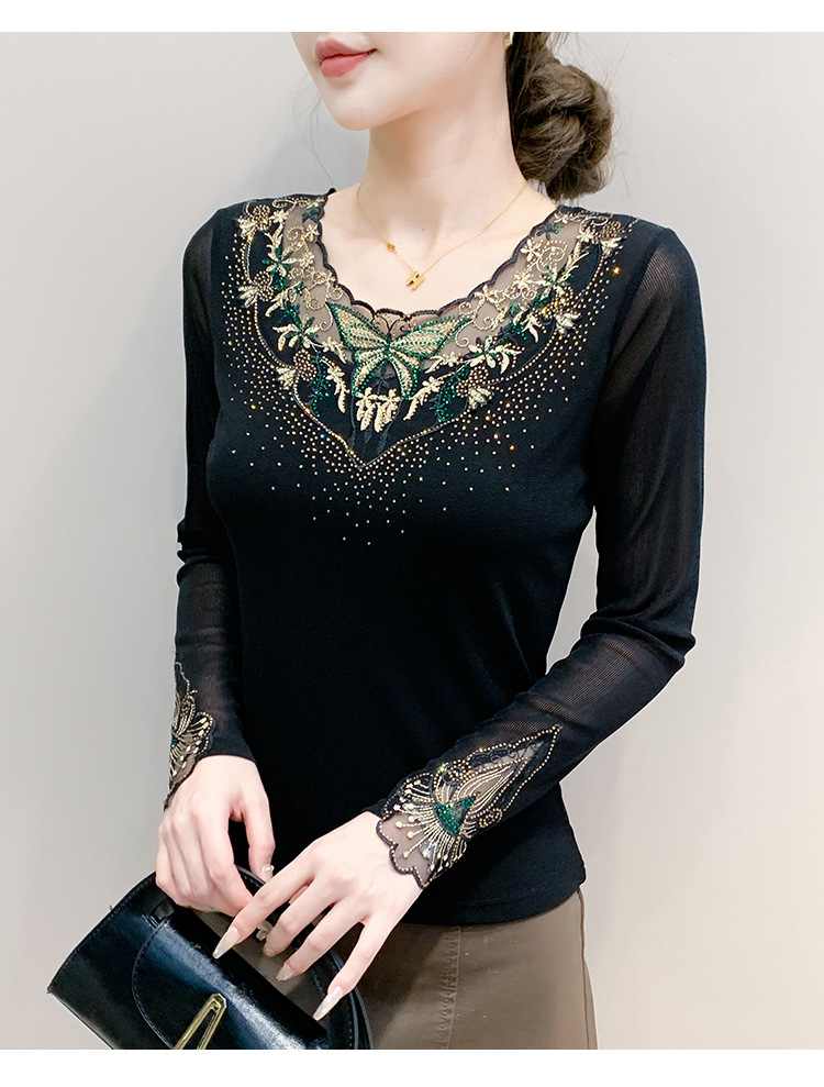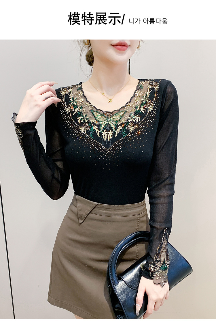 KQL462H7275 2025秋季新款v领长袖上衣优雅花边拼接烫钻洋气网纱收腰气质t恤