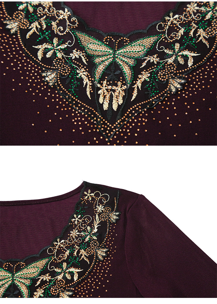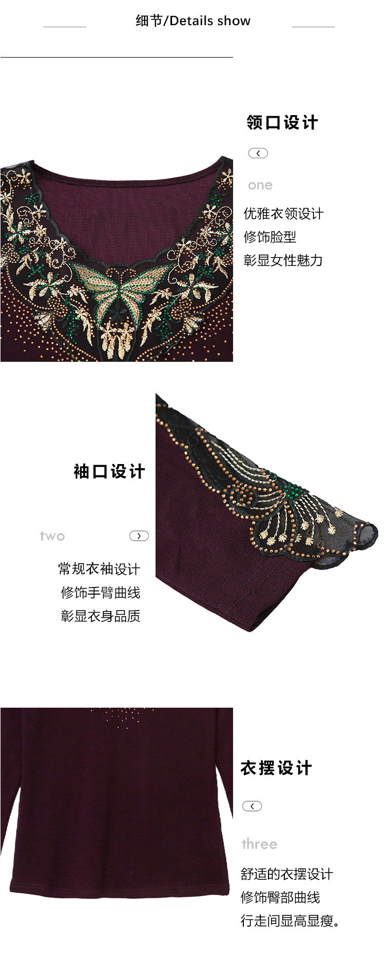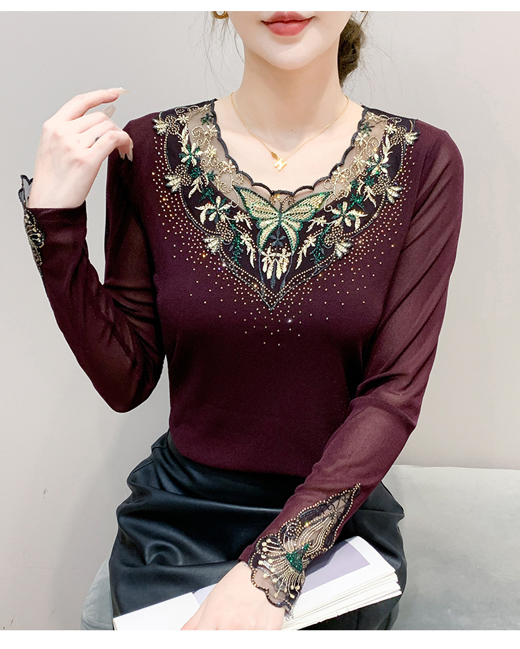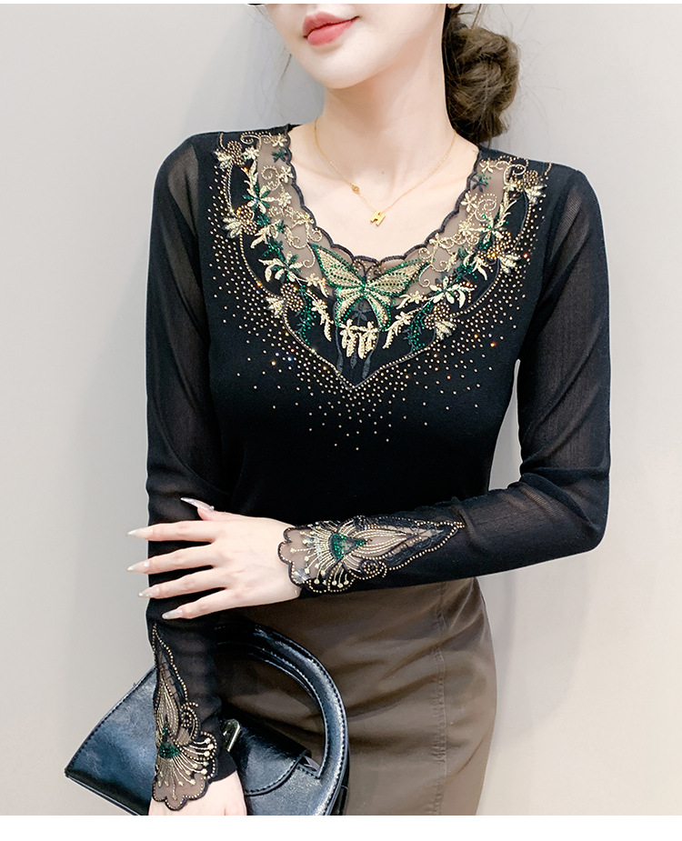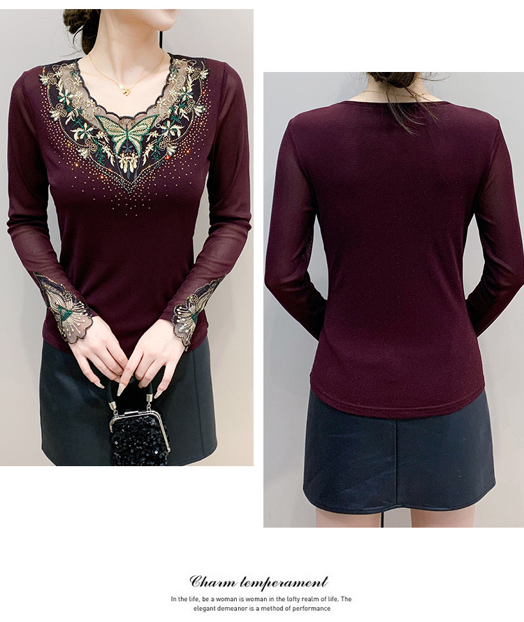 KQL462H7275 2025秋季新款v领长袖上衣优雅花边拼接烫钻洋气网纱收腰气质t恤