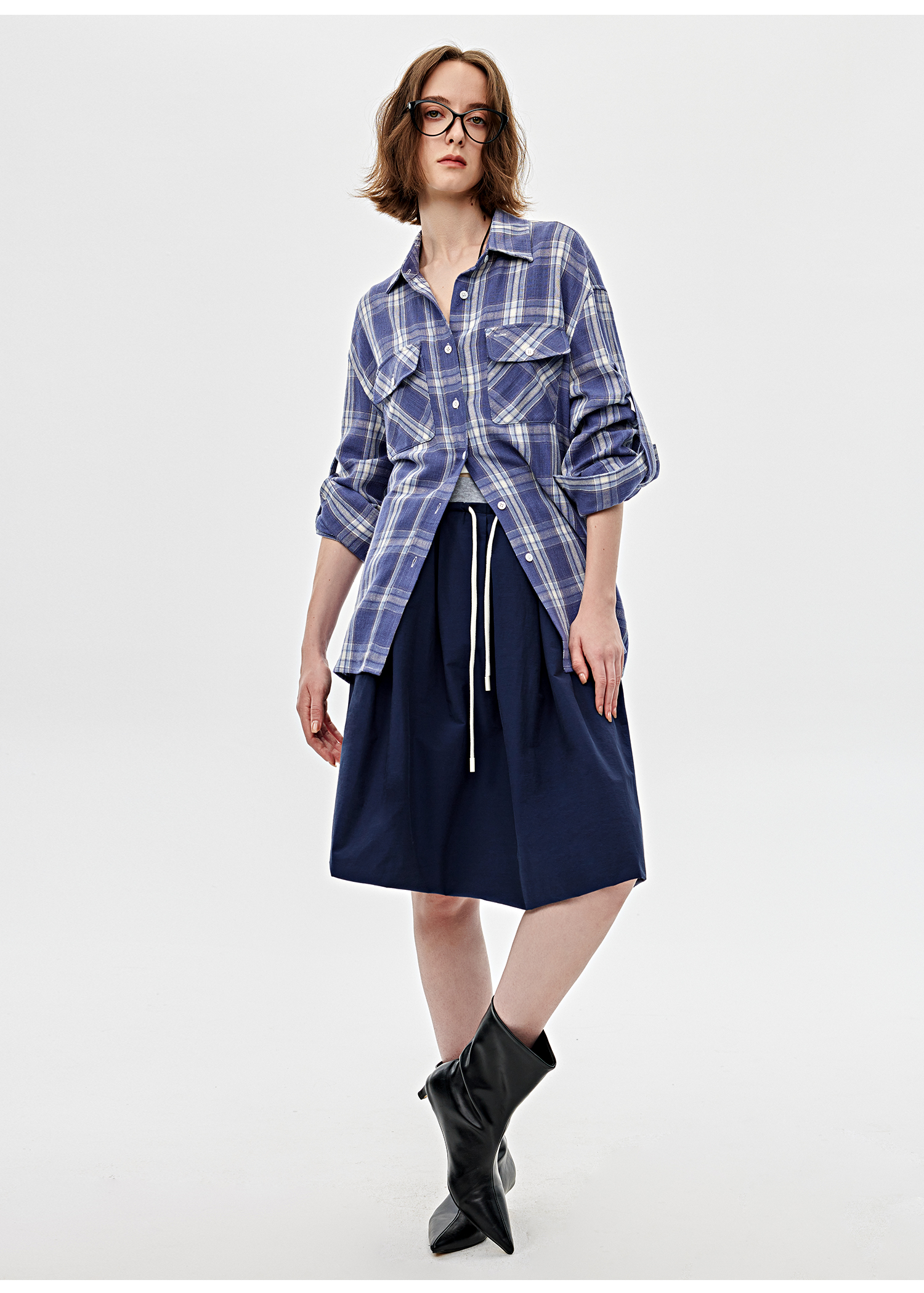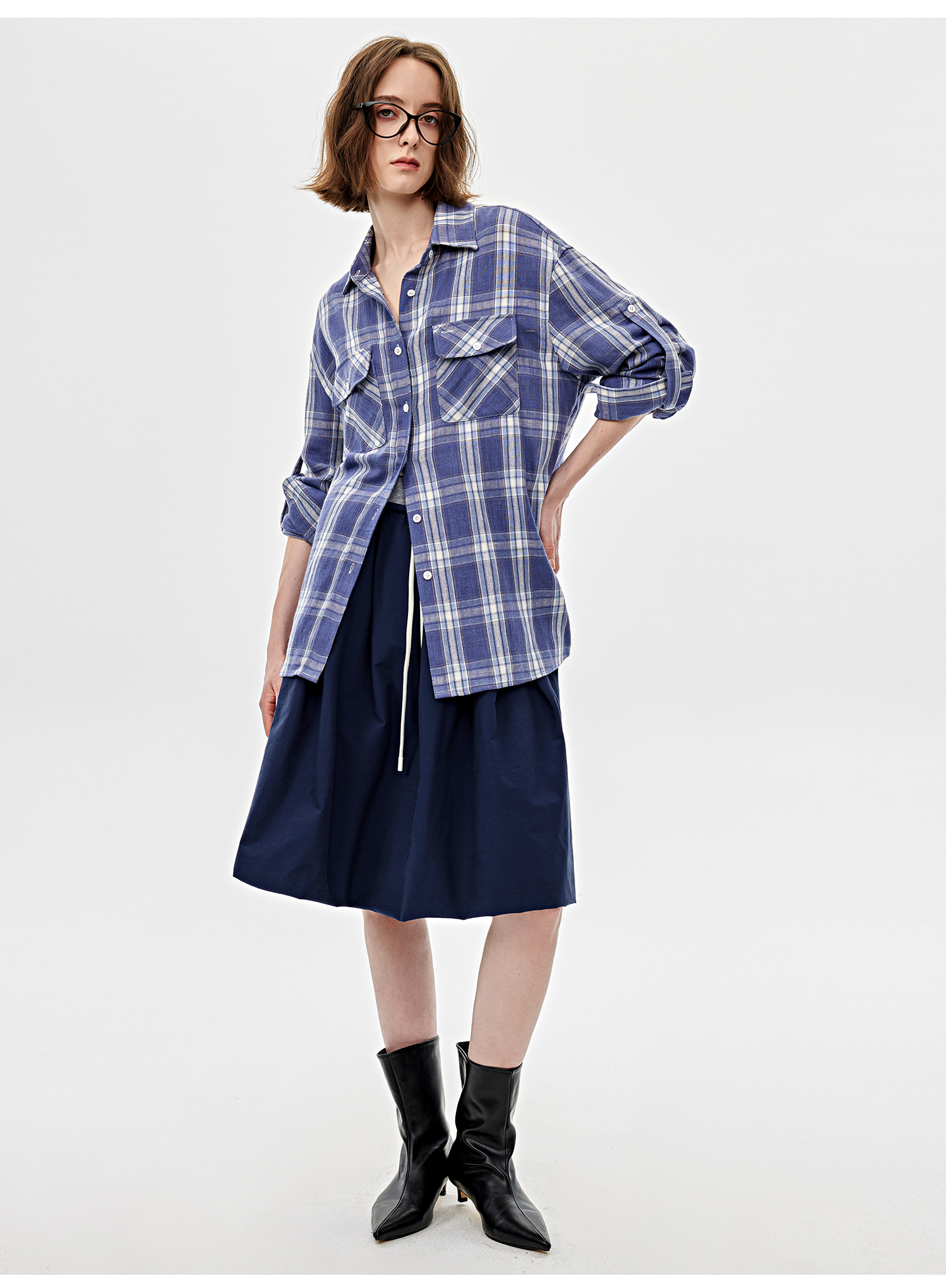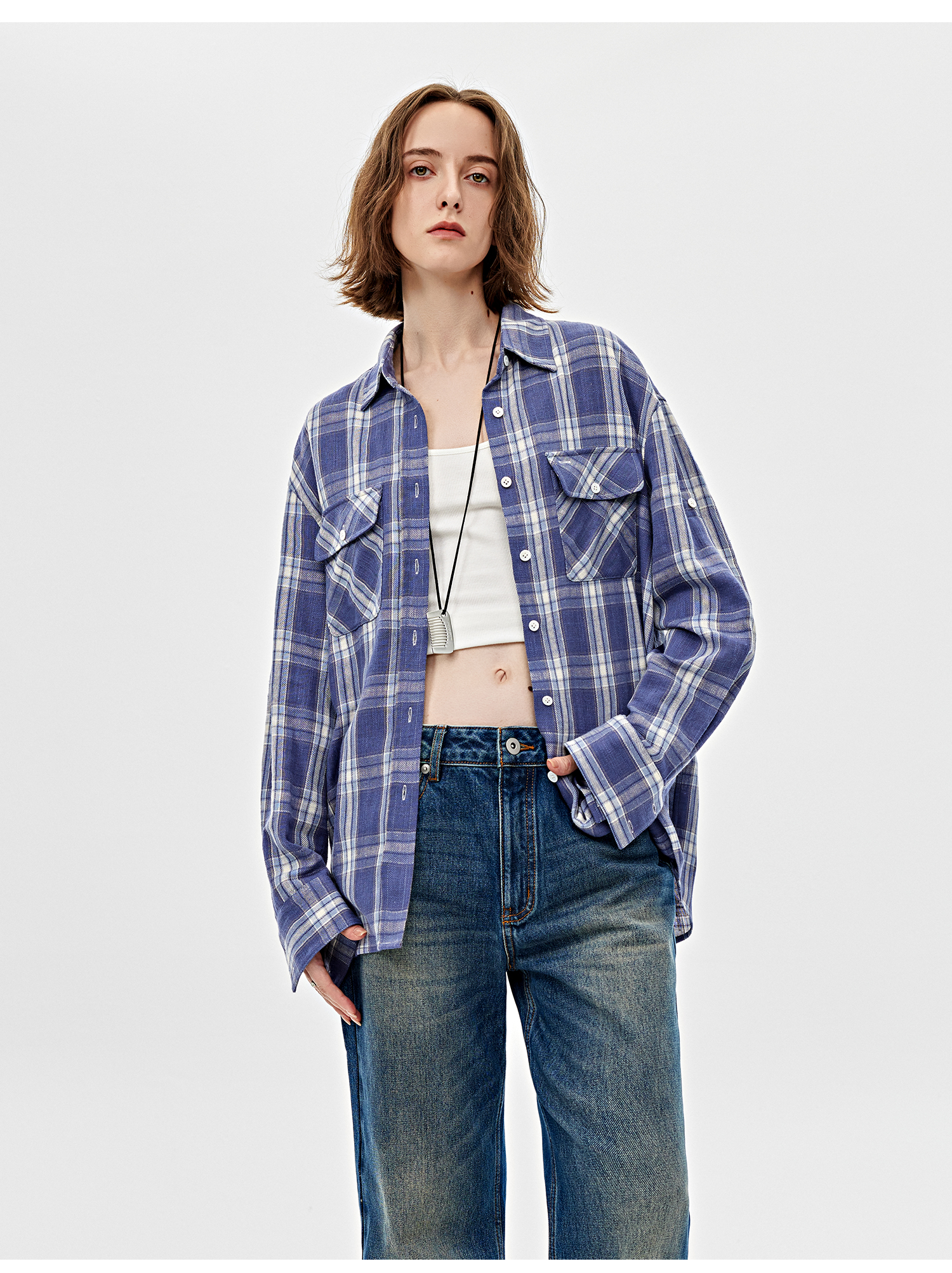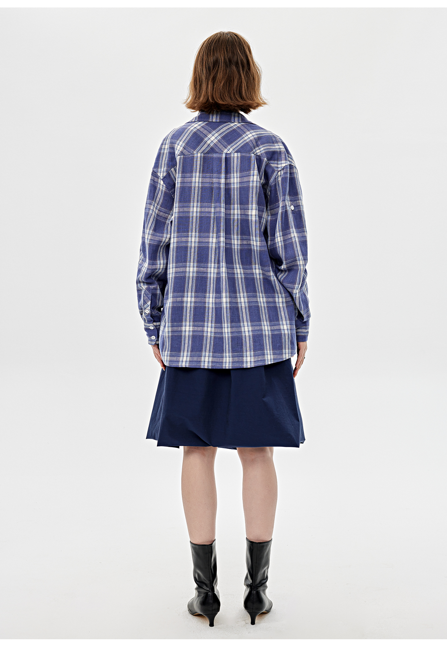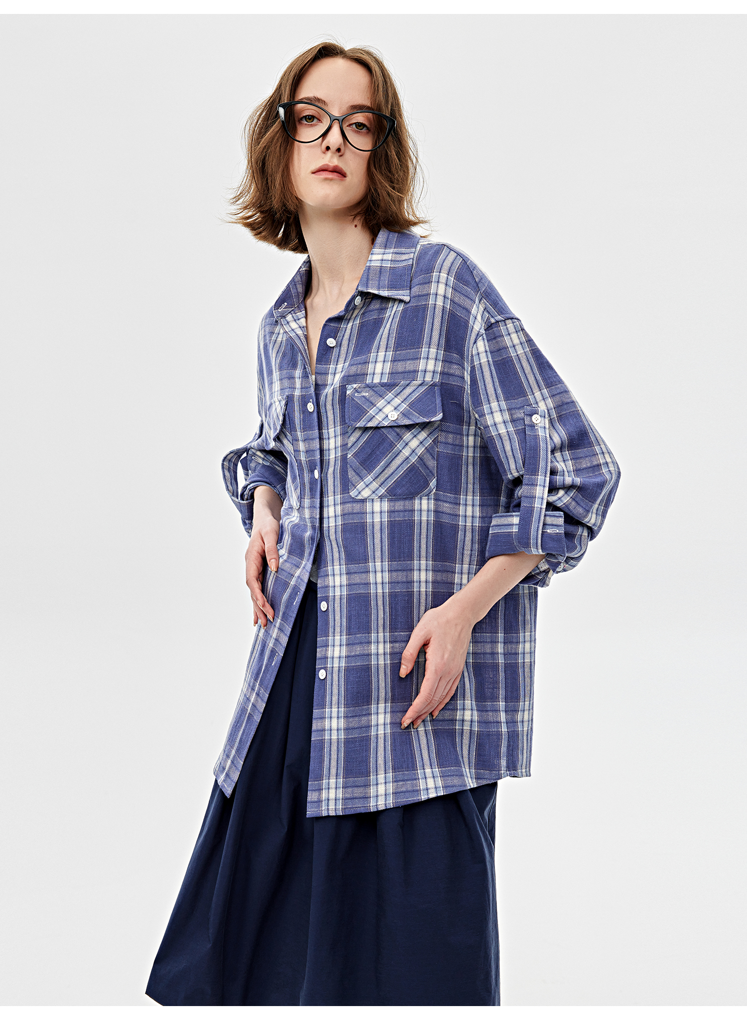 C+IMPRESS西嘉|全棉仿麻蓝色格子衬衫女2025春季新款长袖上衣衬衣CS2501029