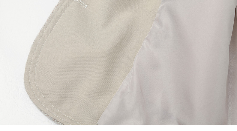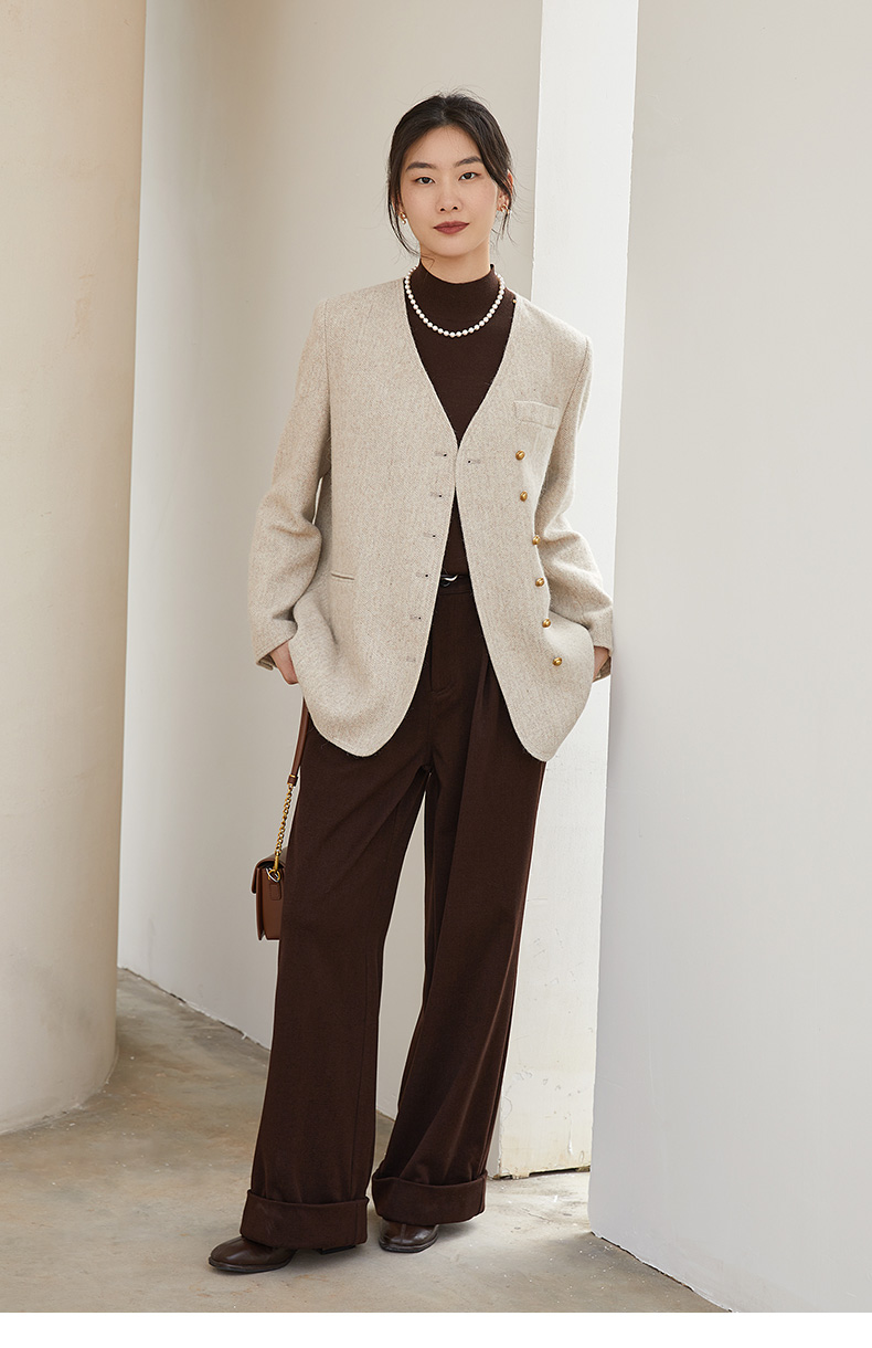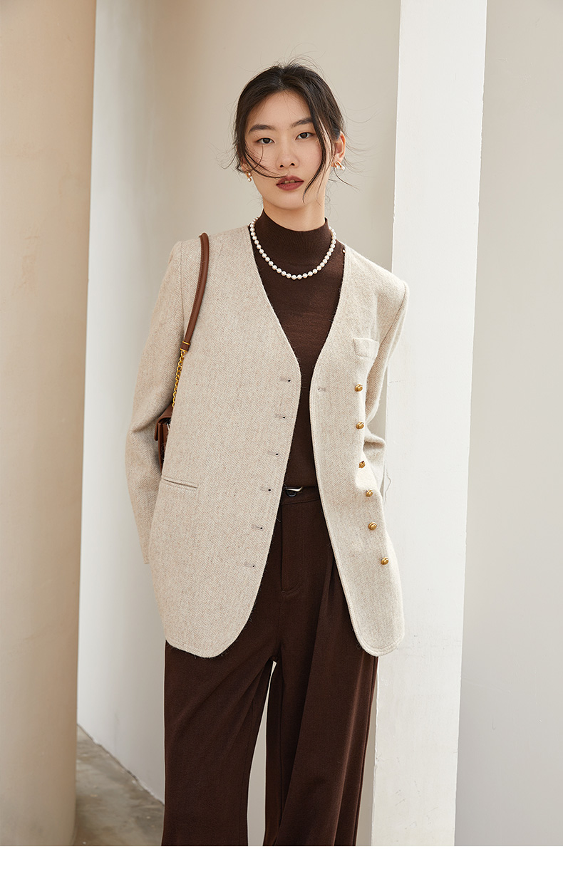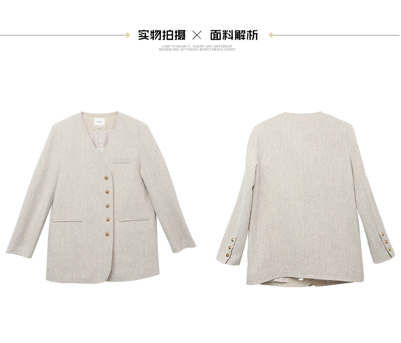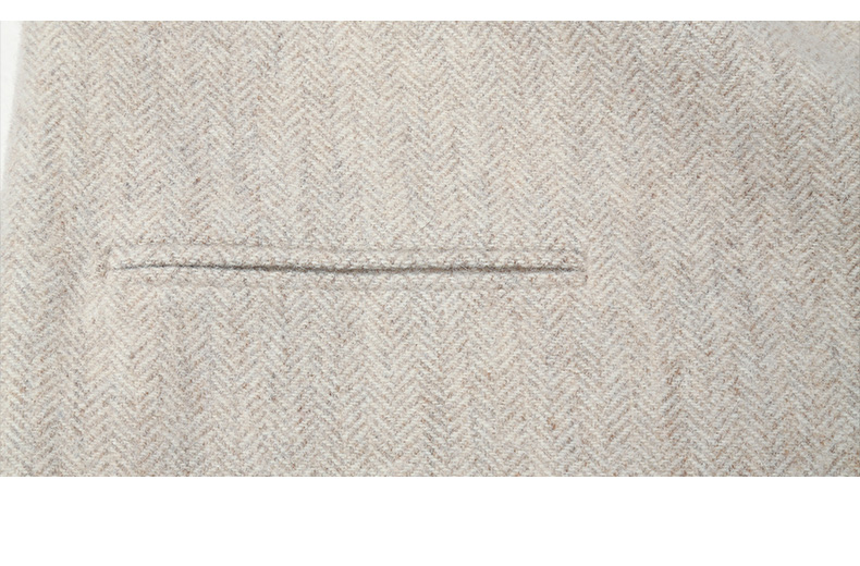米白色人字纹毛呢西装外套 复古风斜门襟单排扣大口袋上衣 春秋季高级感显瘦百搭女式中长款呢子西服