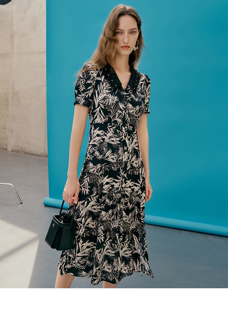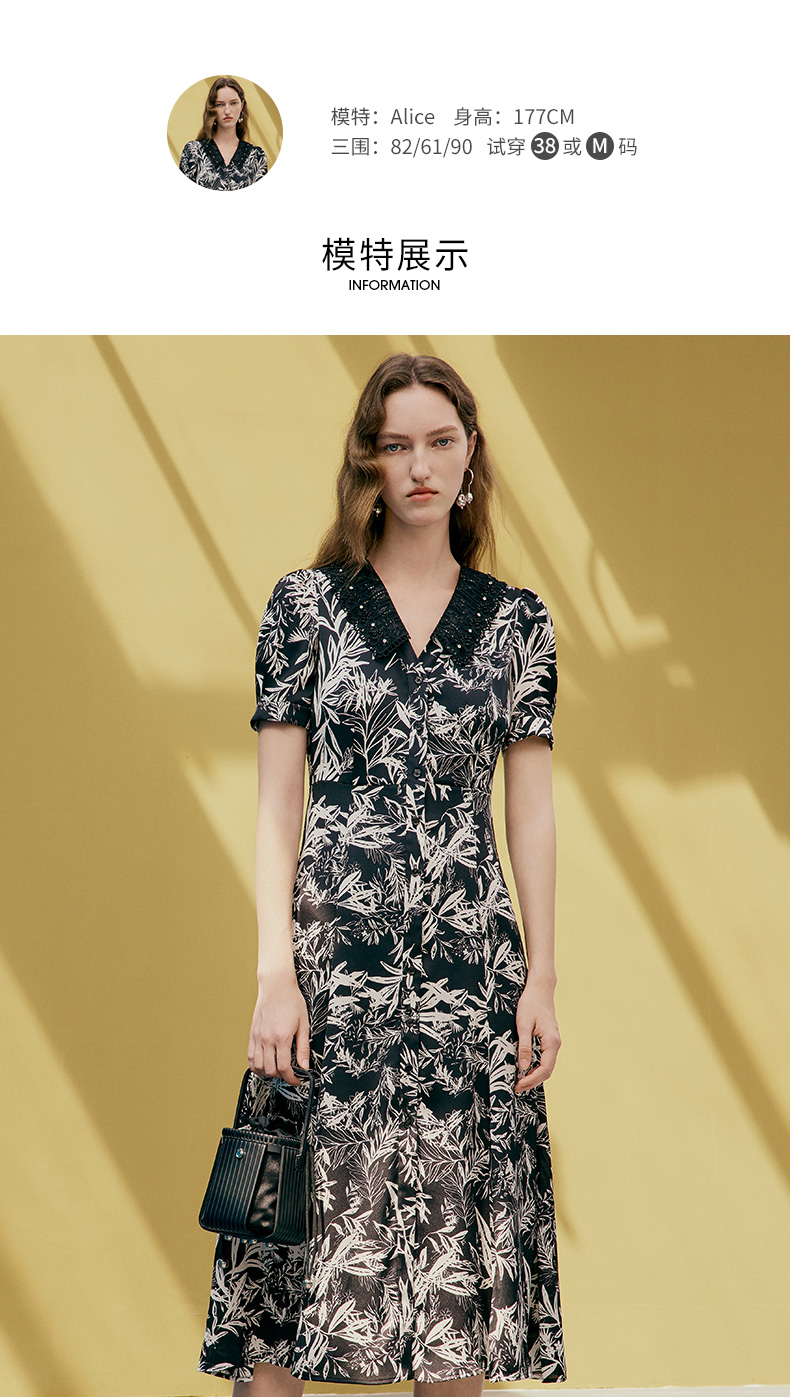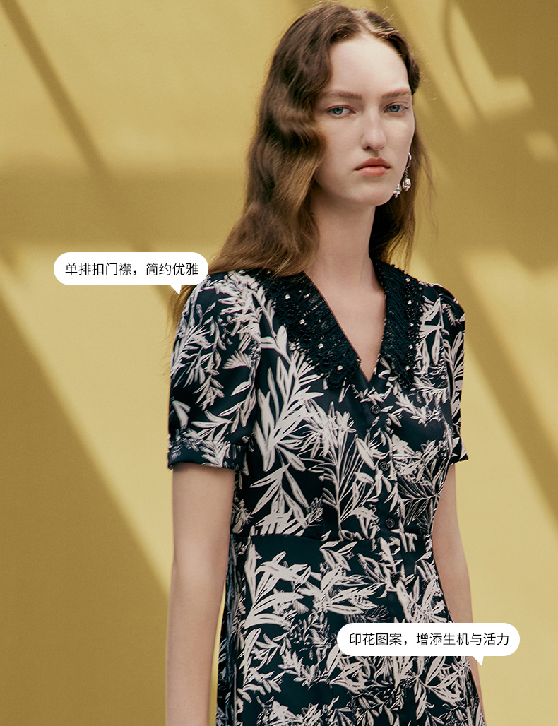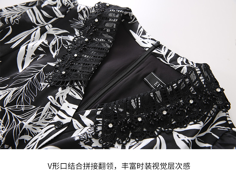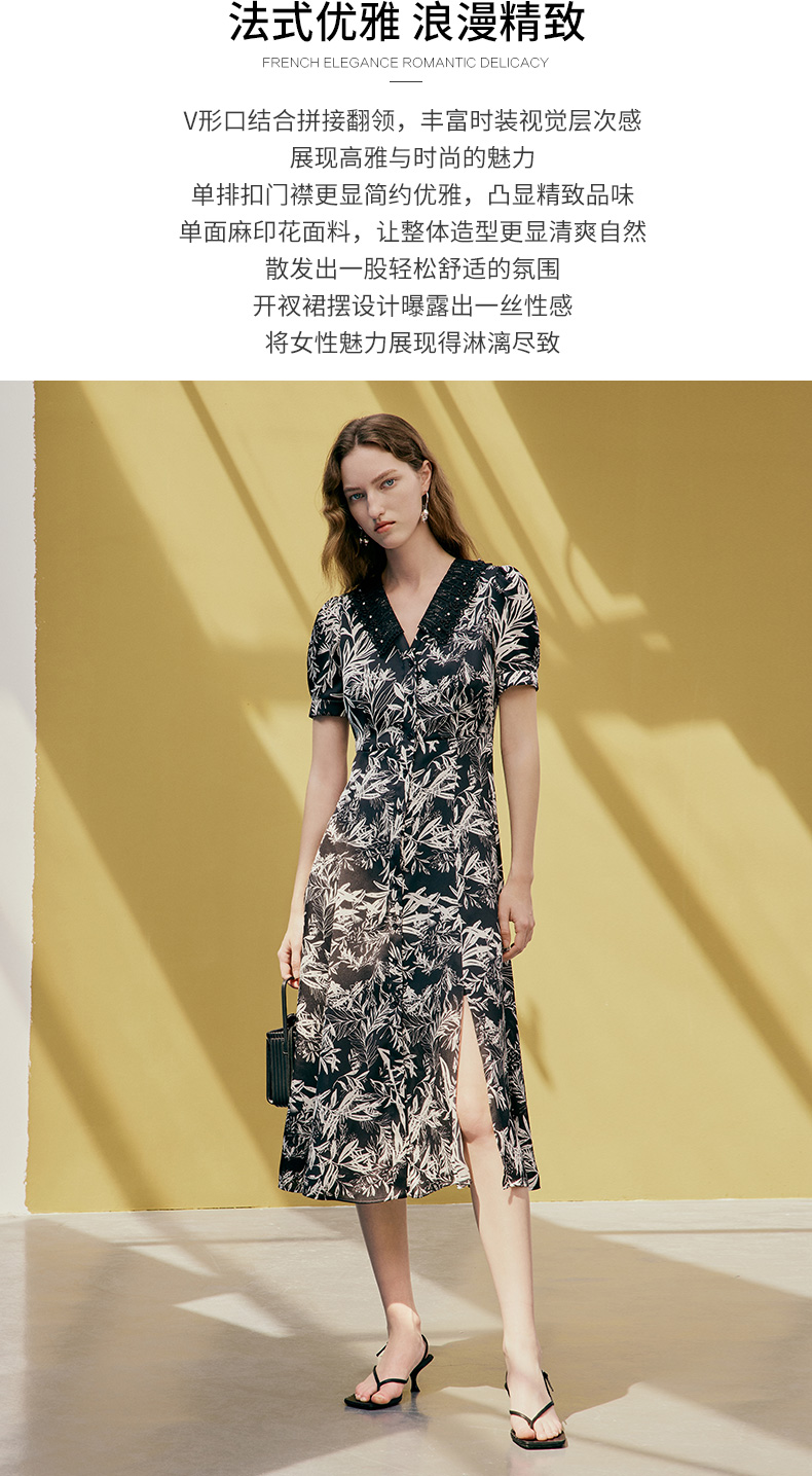 EITIE爱特爱夏款新品V领显瘦高腰舒适印花复古裙摆开叉连衣裙7407119