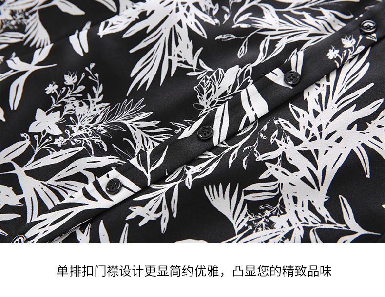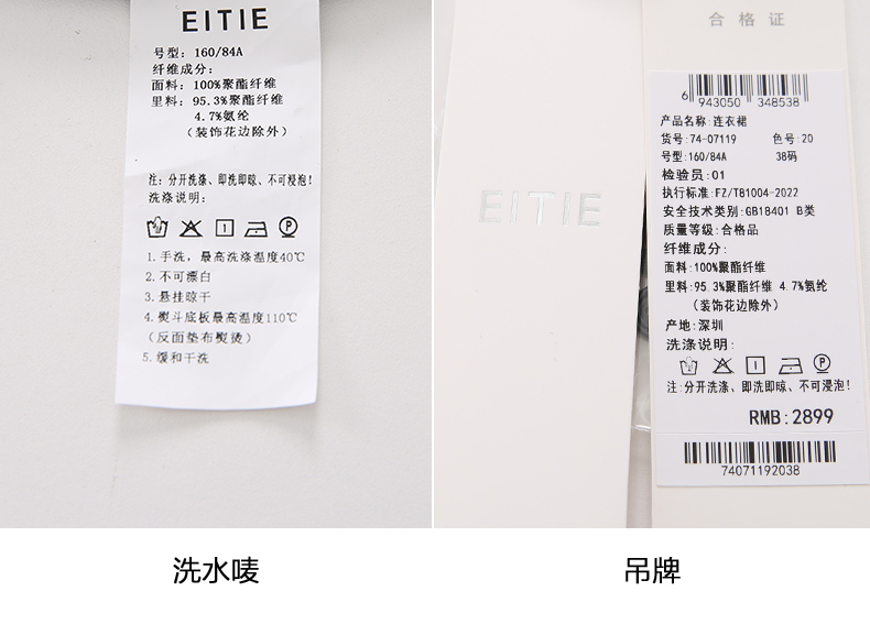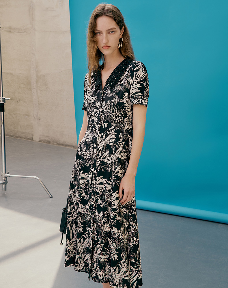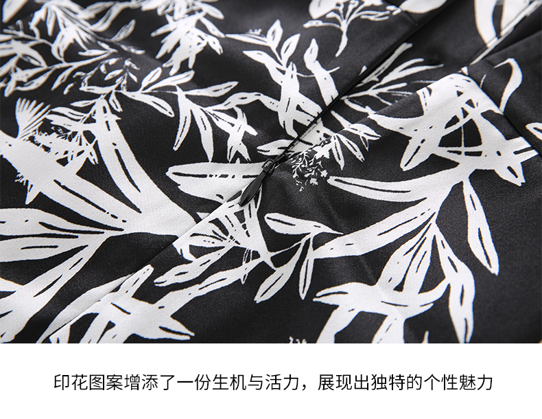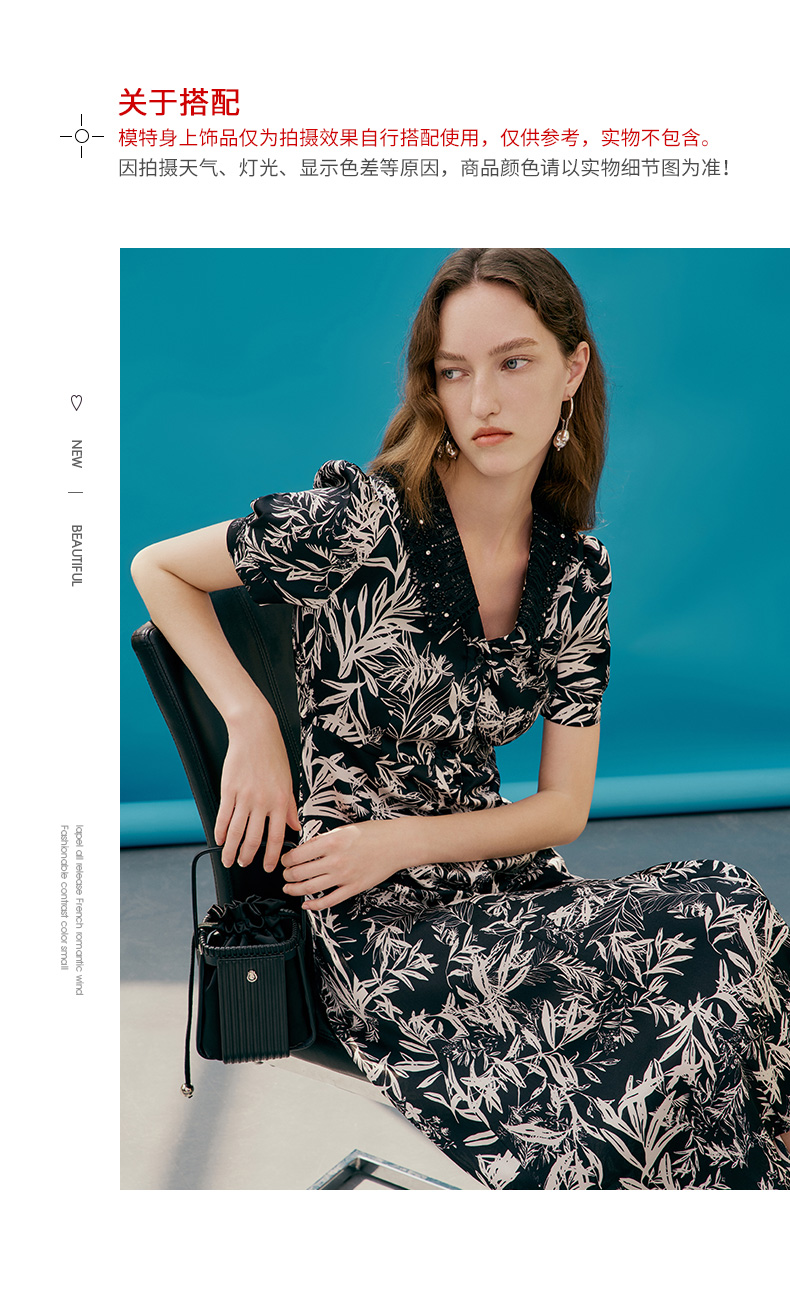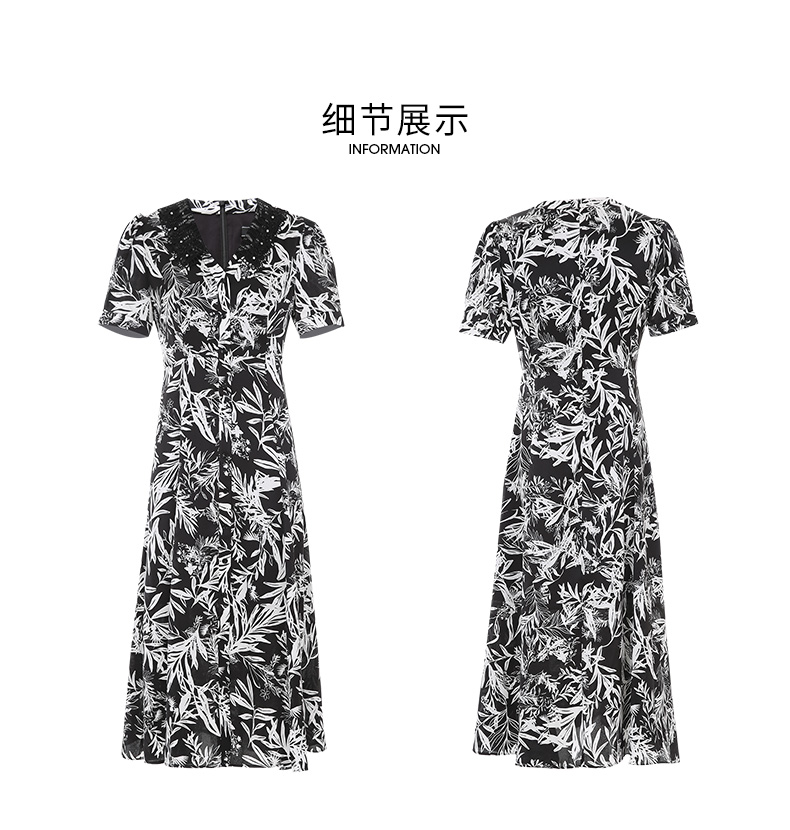 EITIE爱特爱夏款新品V领显瘦高腰舒适印花复古裙摆开叉连衣裙7407119