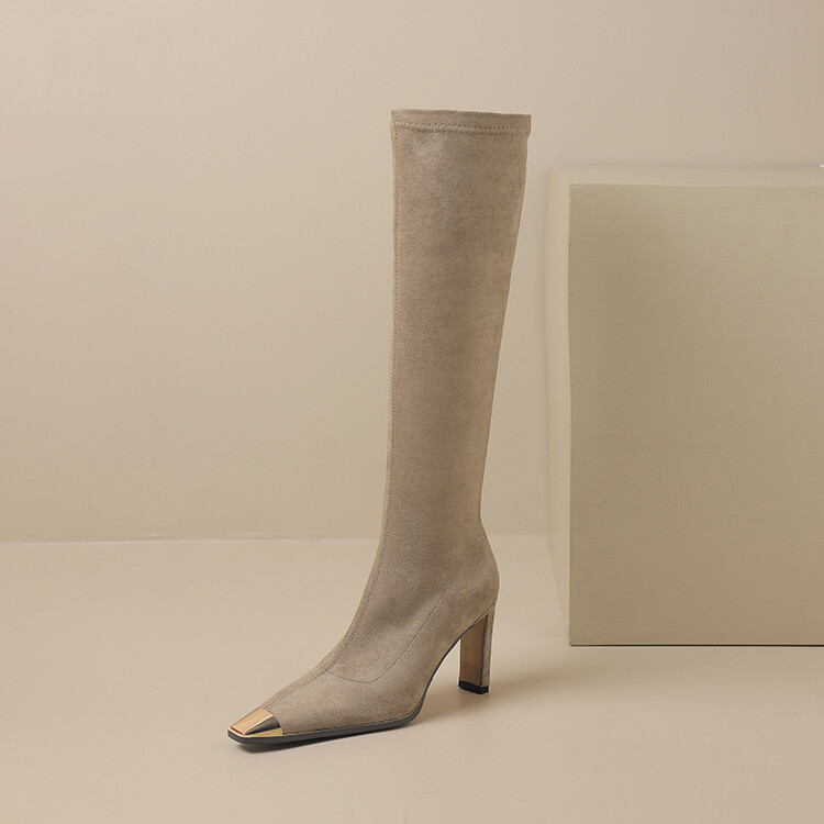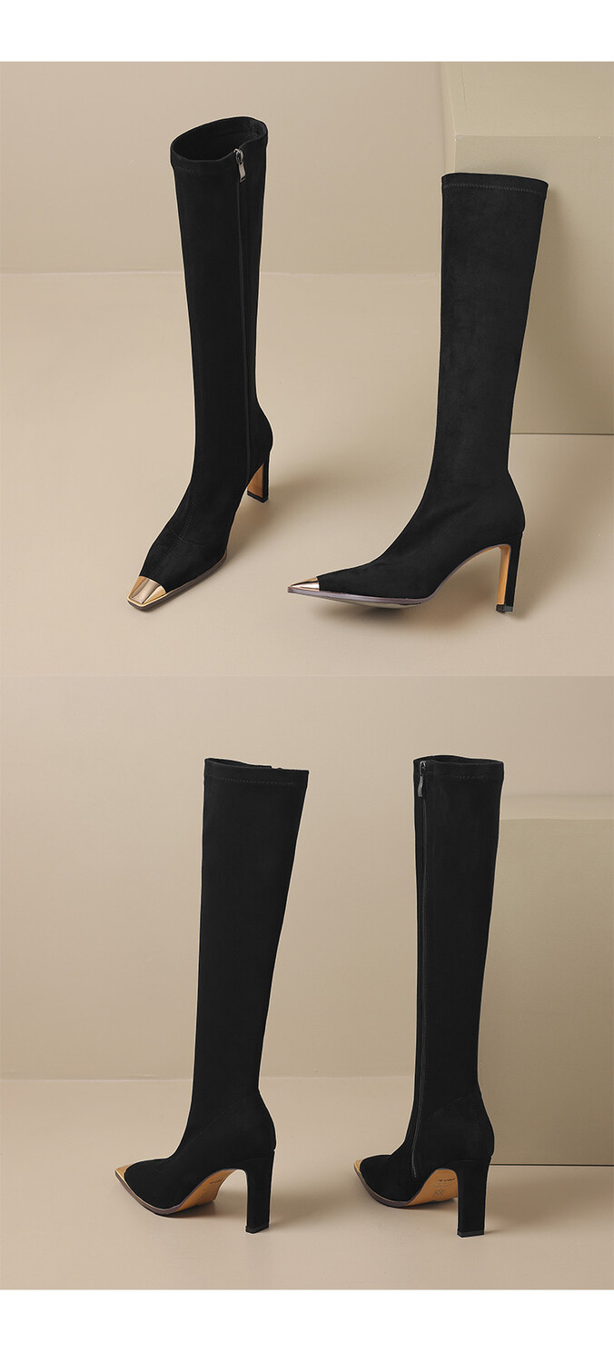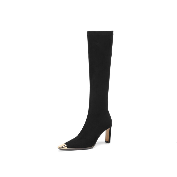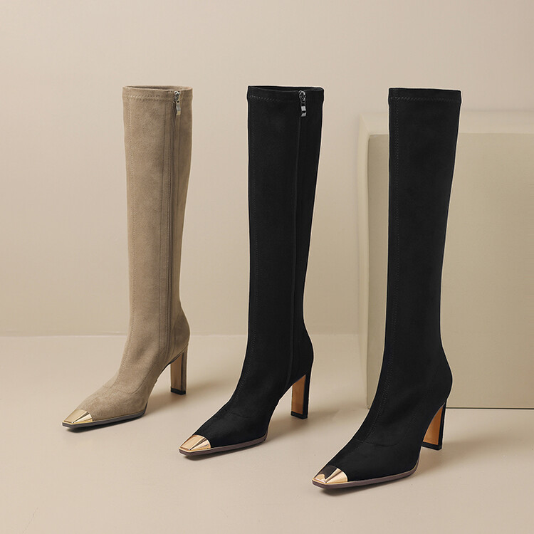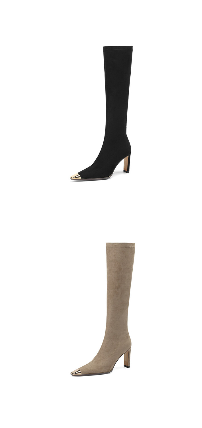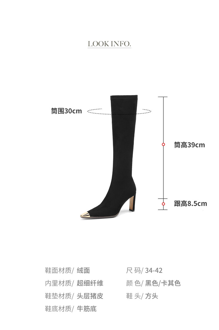 【预售7天】新款金属方头粗跟显瘦弹力靴加绒高跟不过膝高筒长靴女HTK&F1503-2