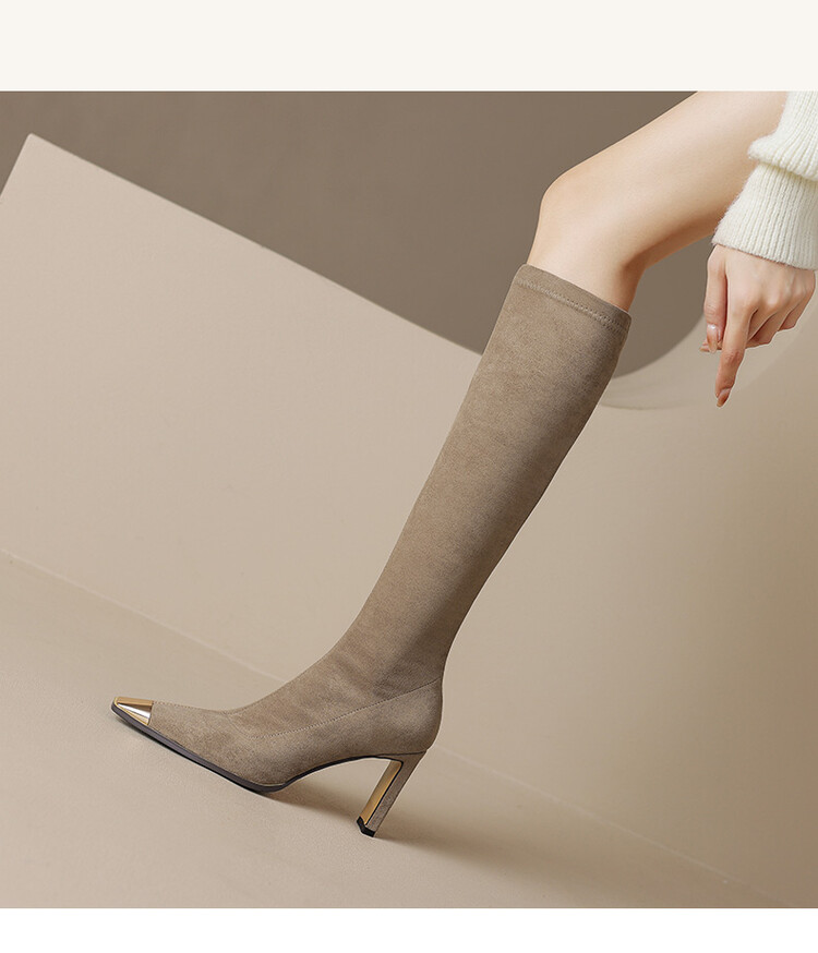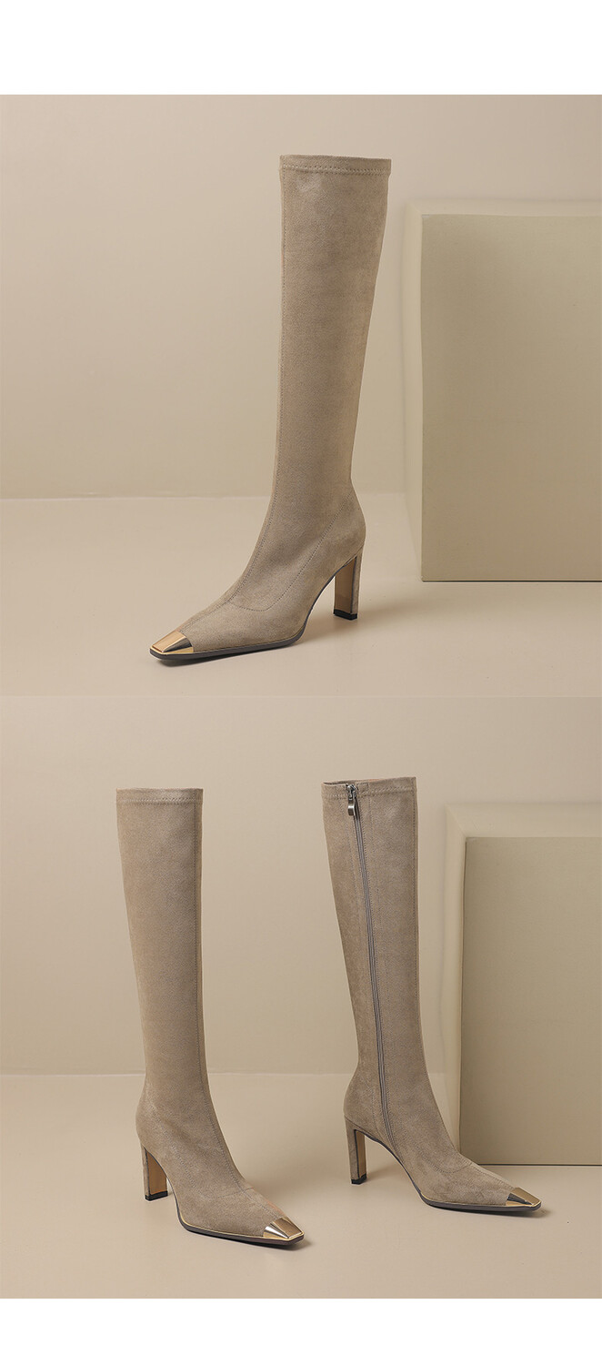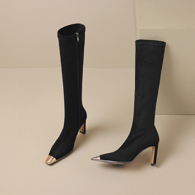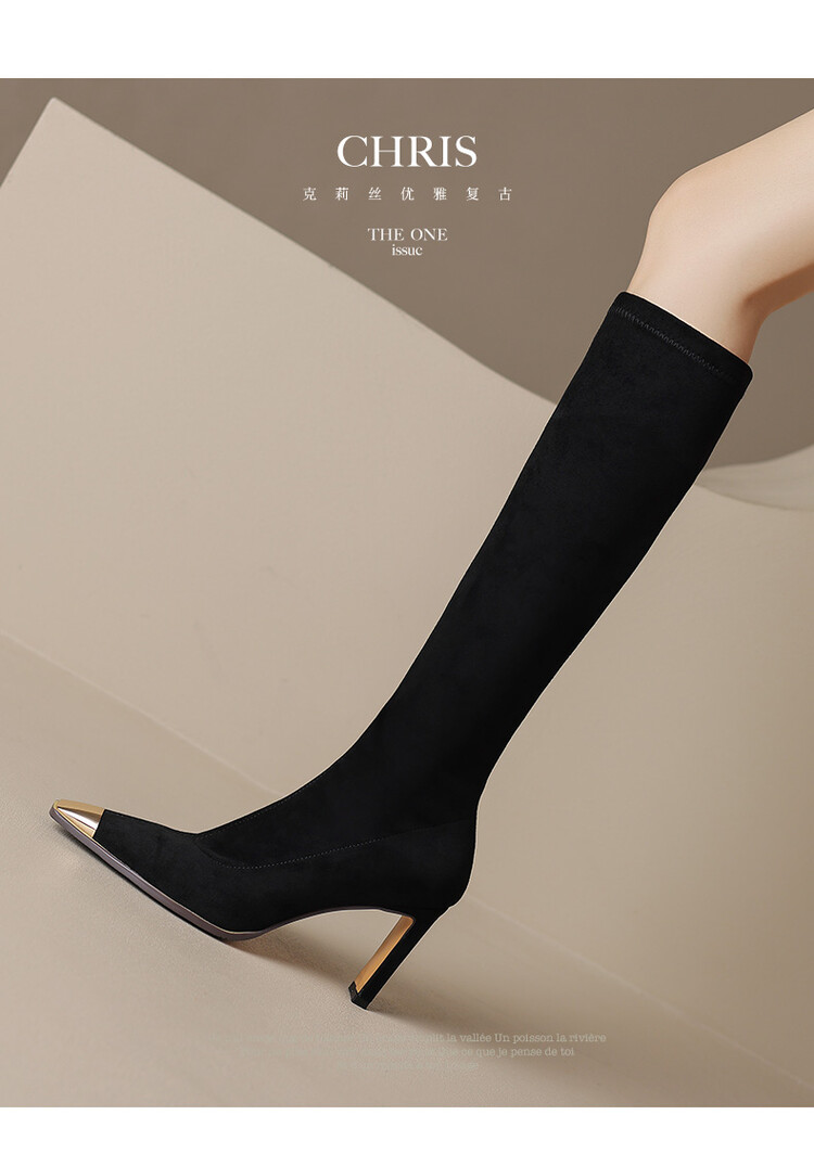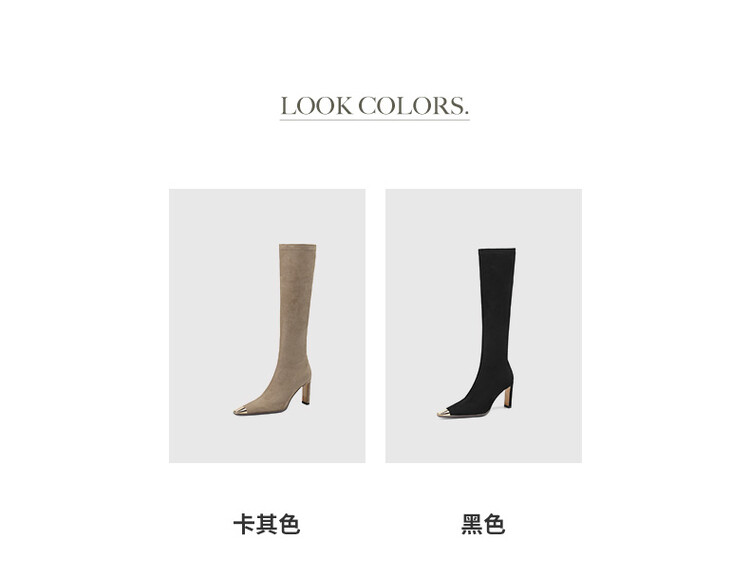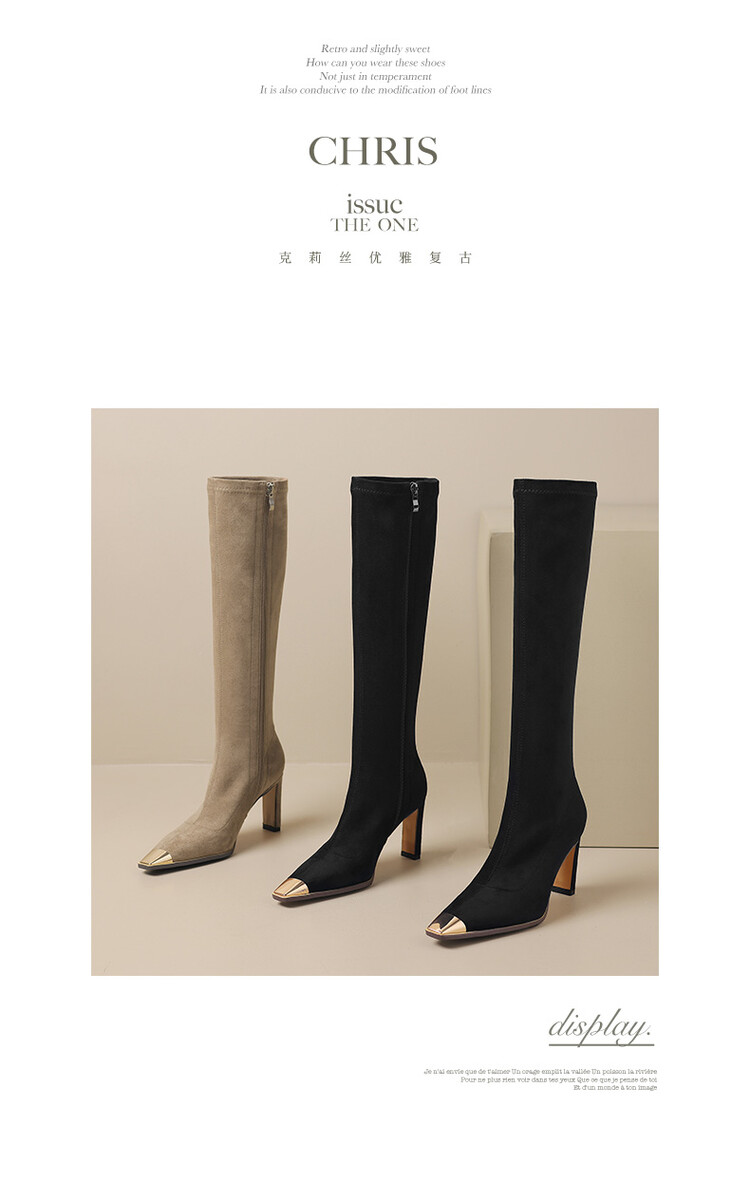 【预售7天】新款金属方头粗跟显瘦弹力靴加绒高跟不过膝高筒长靴女HTK&F1503-2
