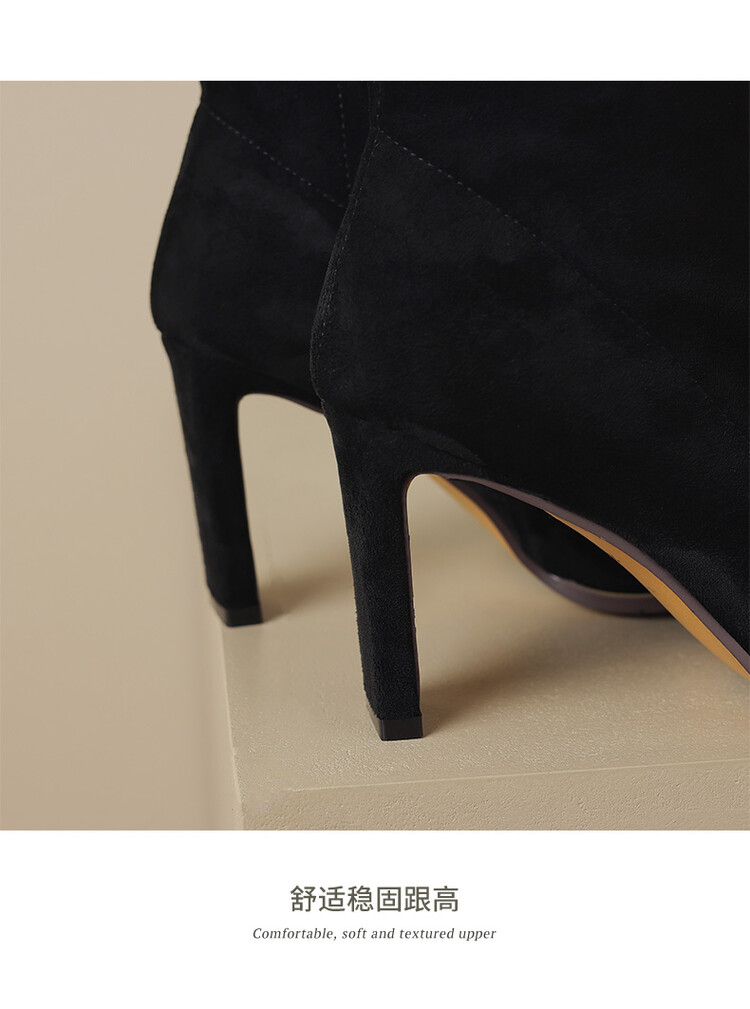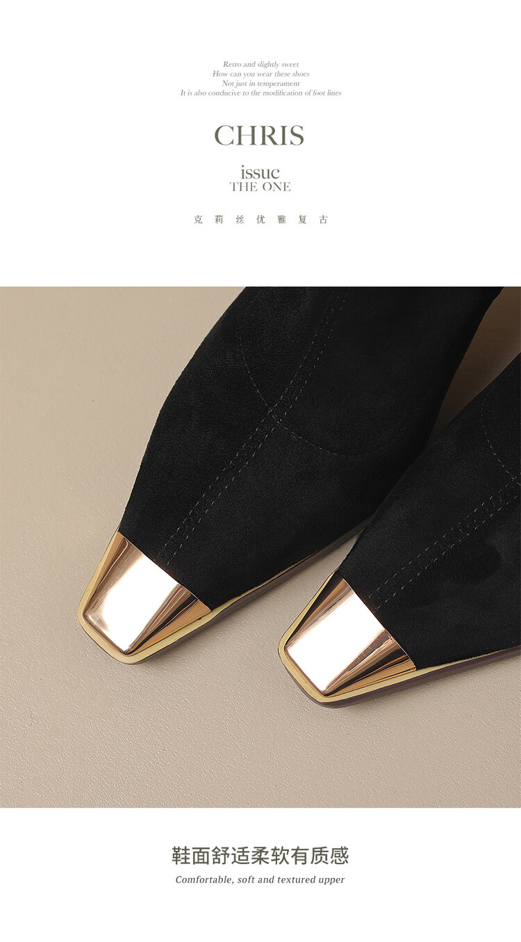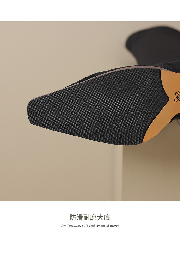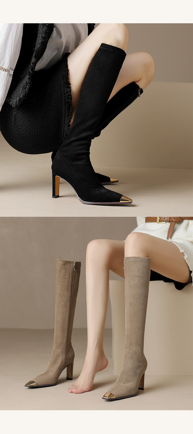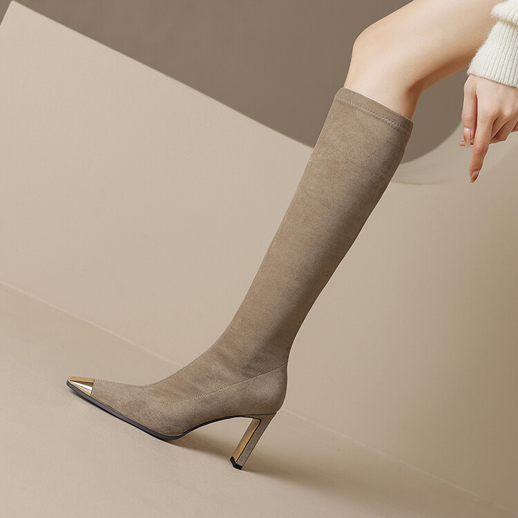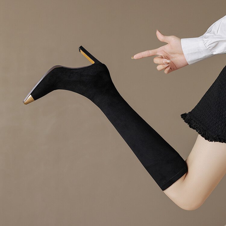 【预售7天】新款金属方头粗跟显瘦弹力靴加绒高跟不过膝高筒长靴女HTK&F1503-2