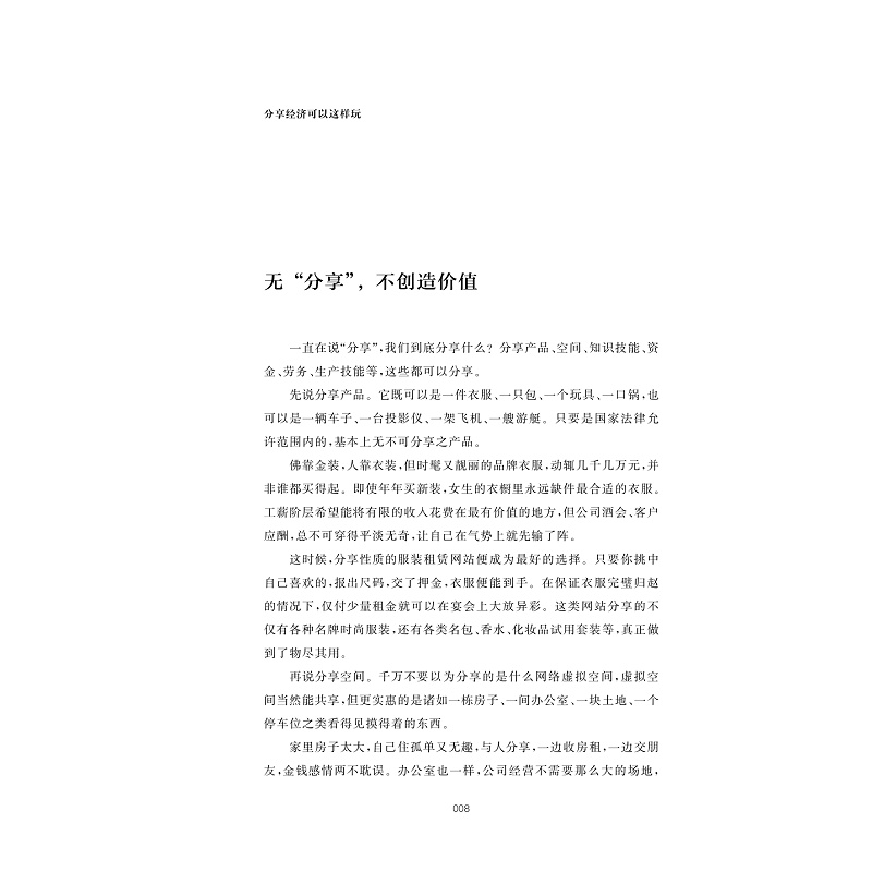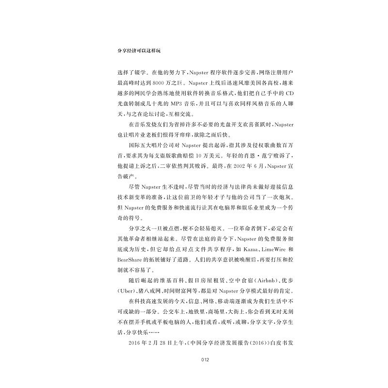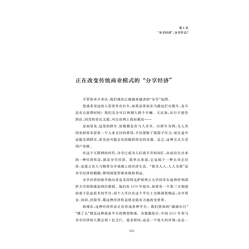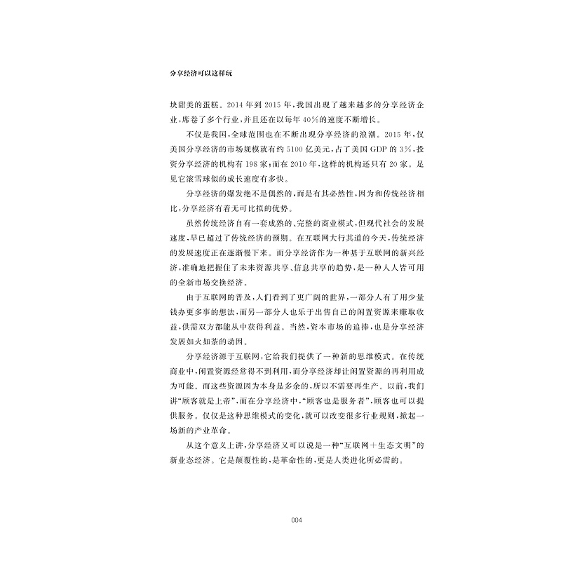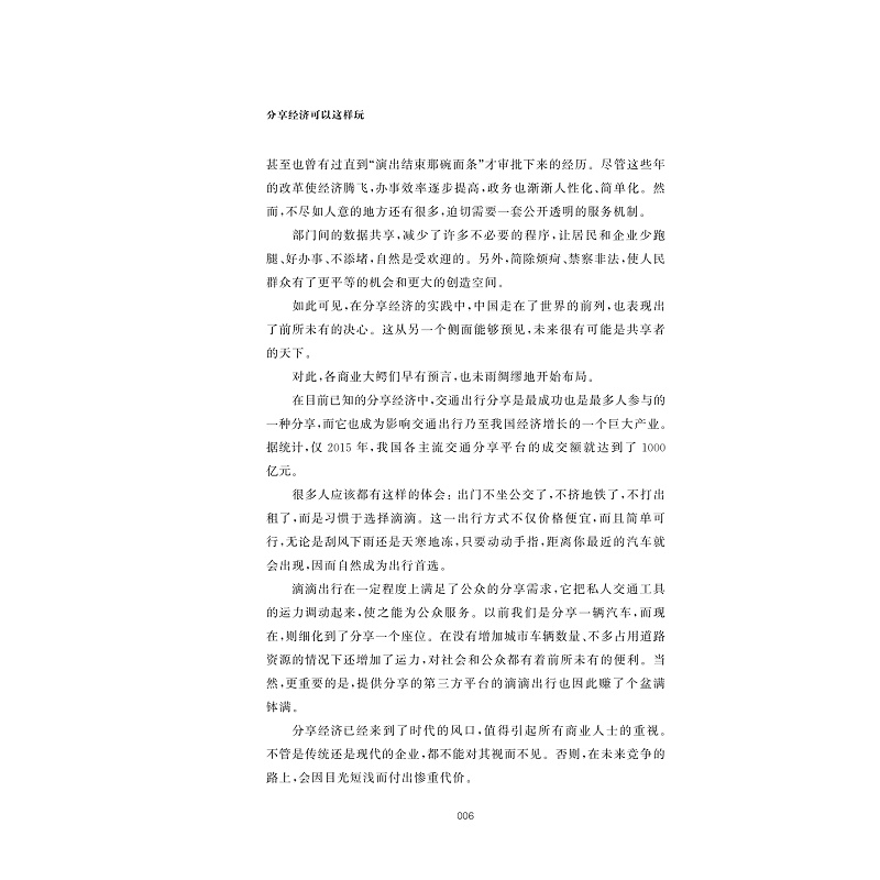 今年两会上,我国总理李克强在政府工作报告中,特别提出分享经济模式,分享经济很快成为我国新经济中的热门词汇,为广大网民和企业从业者知晓.共享经济改变着各个行业以及我们的工作、创业、打车、租房、金融、旅游等所有方面。而玩转分享经济是本书作者提出国内企业如何运用共享经济的商业模式,并为国内企业带来怎样的运营变革等分享经济的实战性操作技巧。 该书是《共享经济》一书作者蔡余杰在推出其重磅作品后,提出国内企业如何运用共享经济的商业模式,并为国内企业带来怎样的运营变革等共享经济的实战性操作技巧。