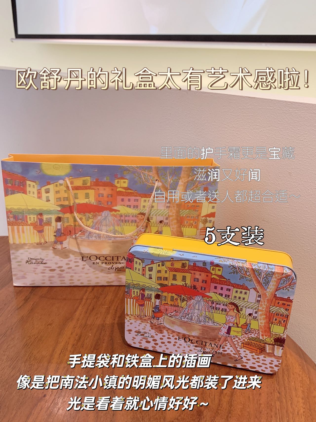 套盒里有5支护手霜,包装是精美礼盒加礼袋,插画充满南法小镇风情,颜值超高。