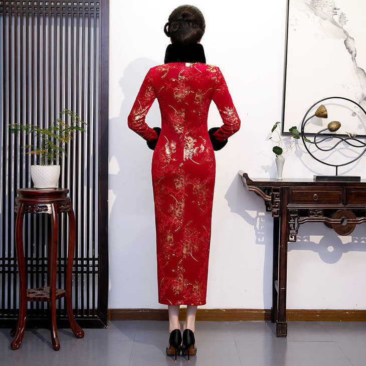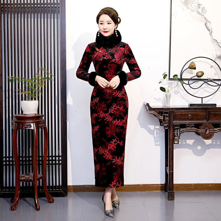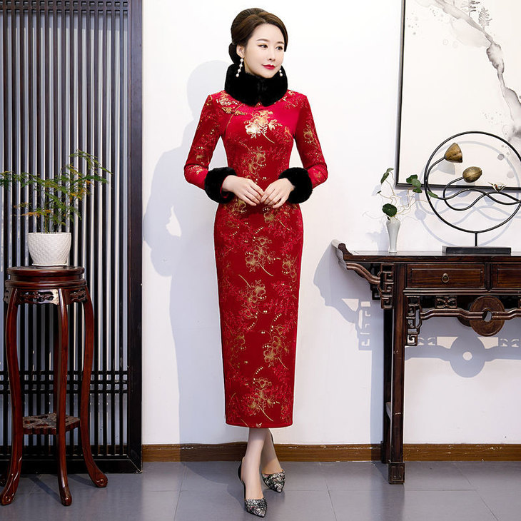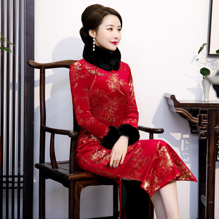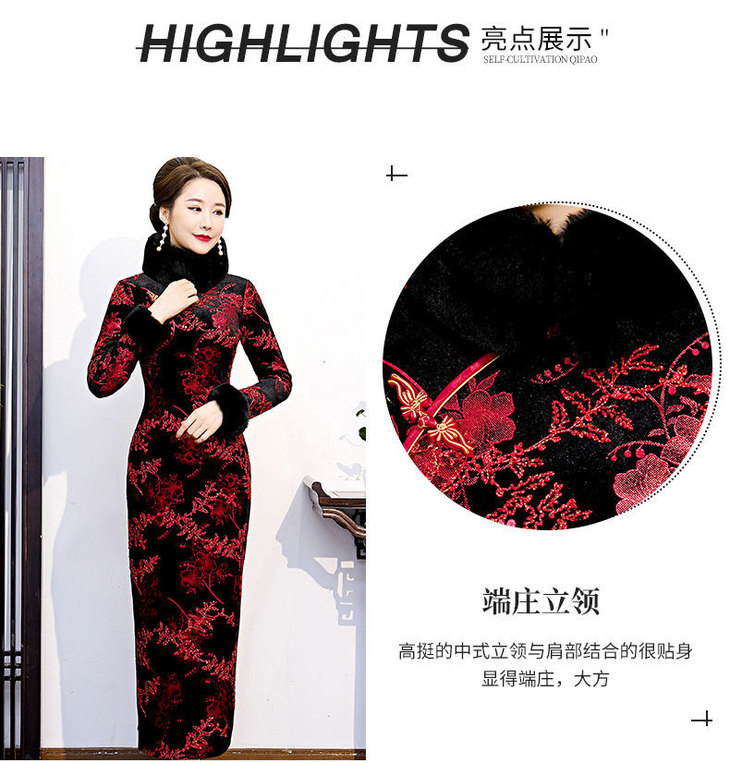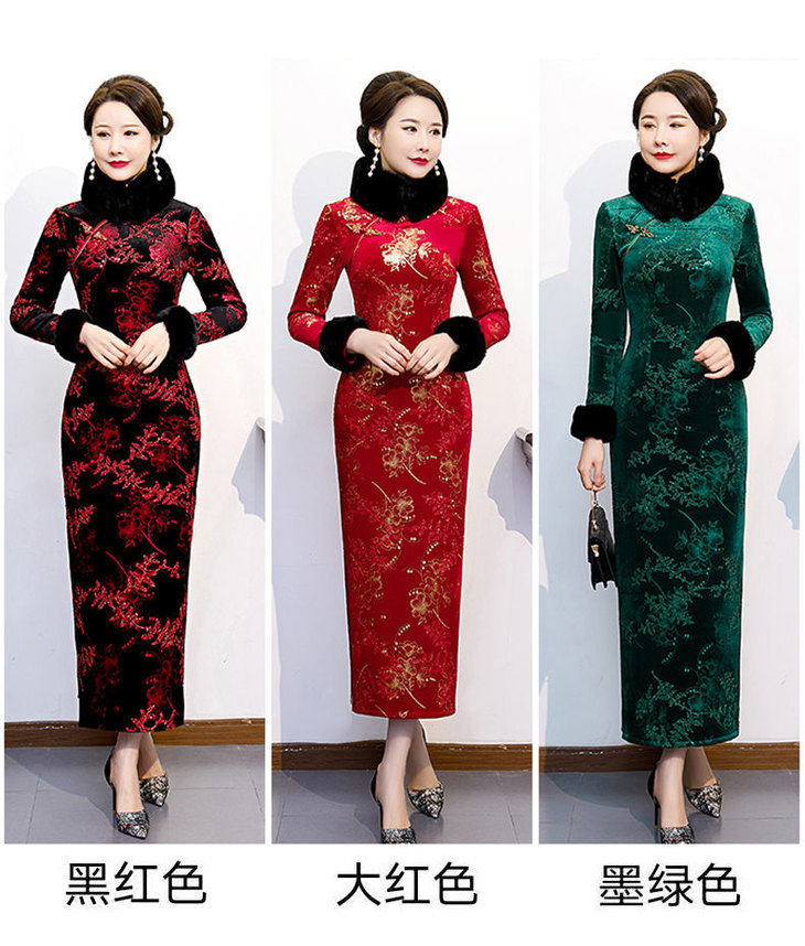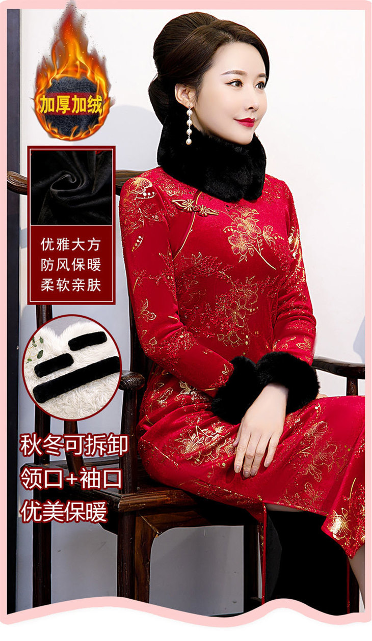 PDD-新款高档婚礼喜婆婆加绒加厚金丝绒长款连衣裙
