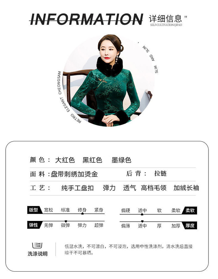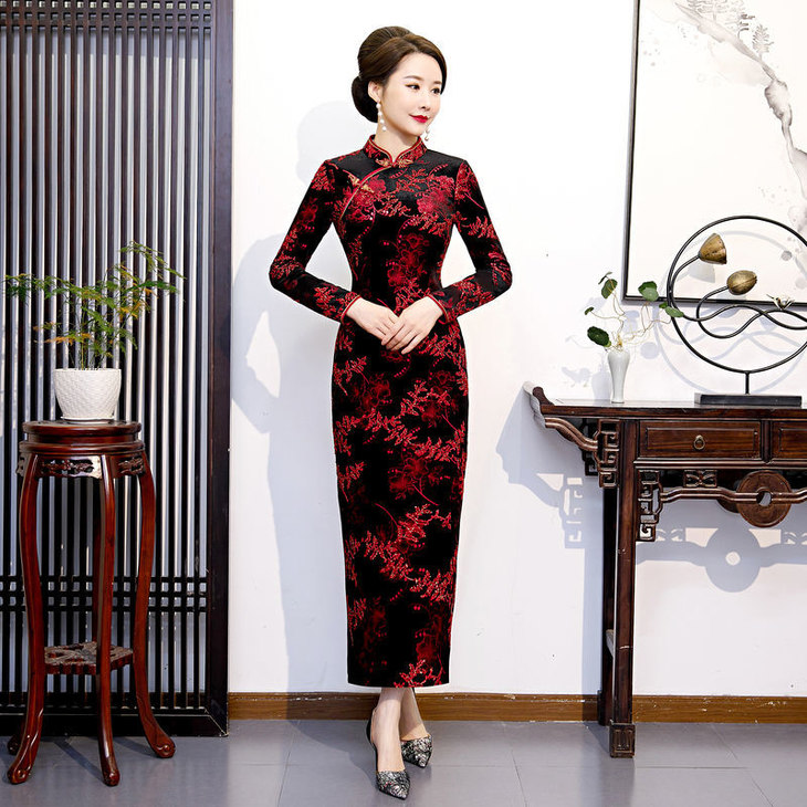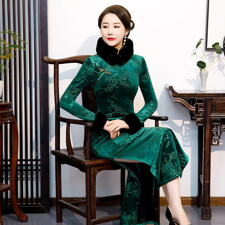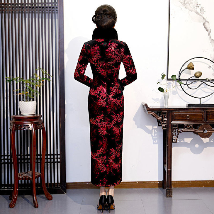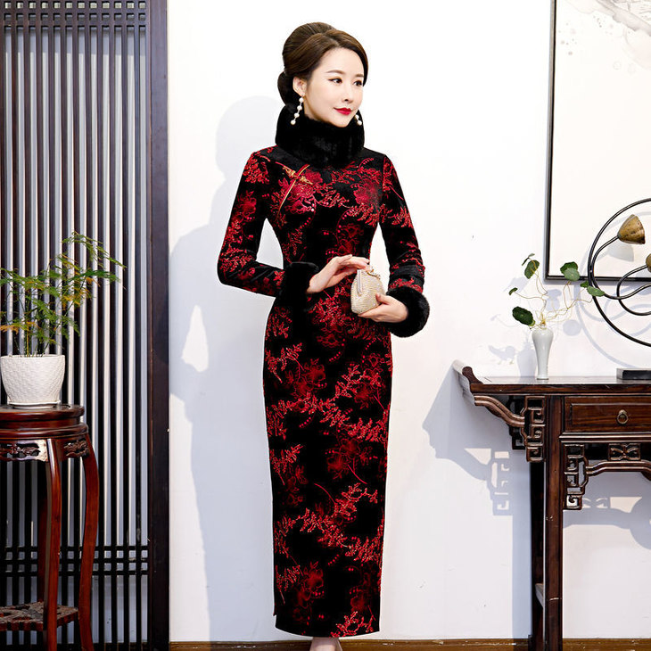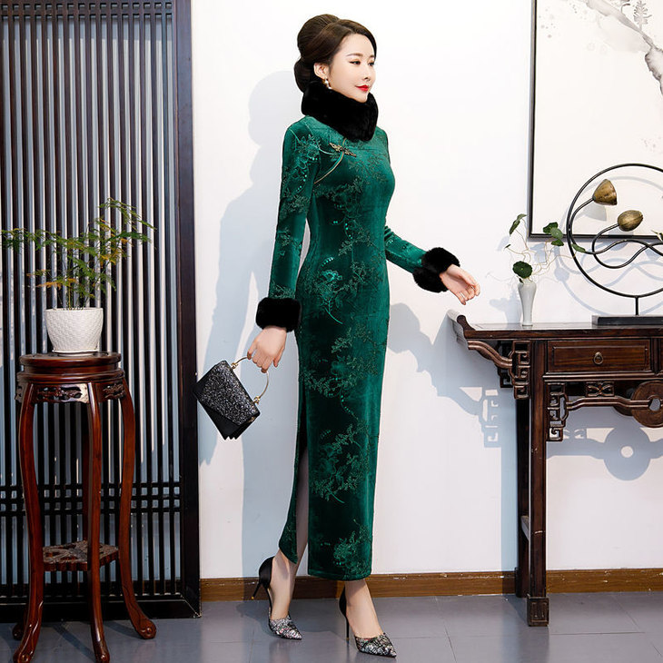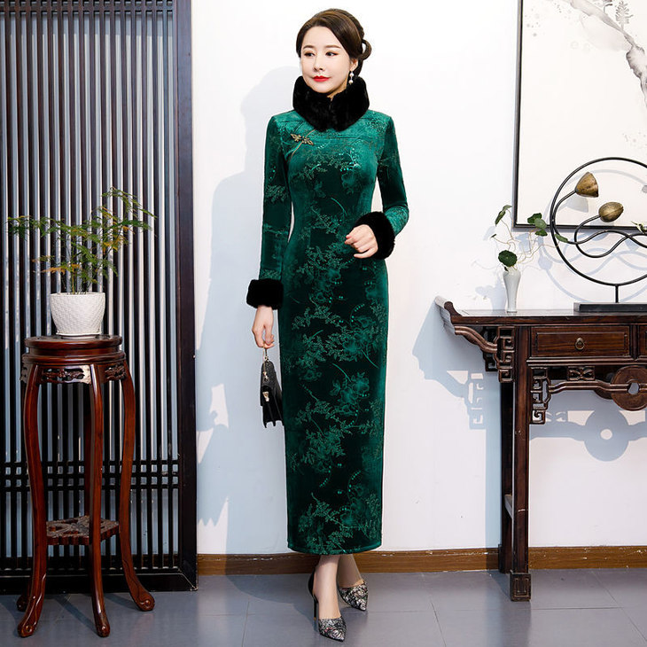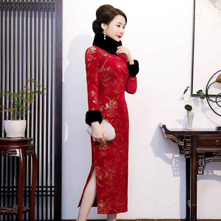 PDD-新款高档婚礼喜婆婆加绒加厚金丝绒长款连衣裙