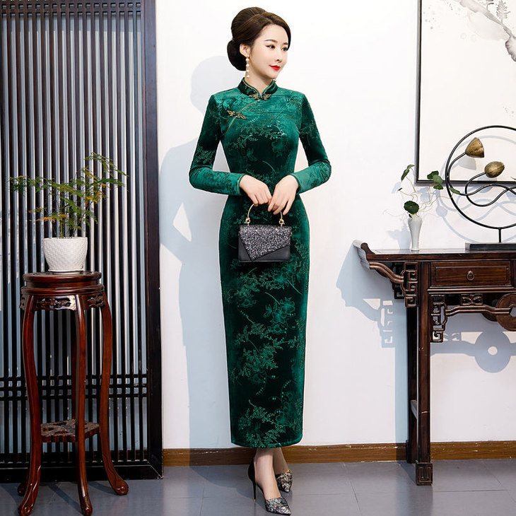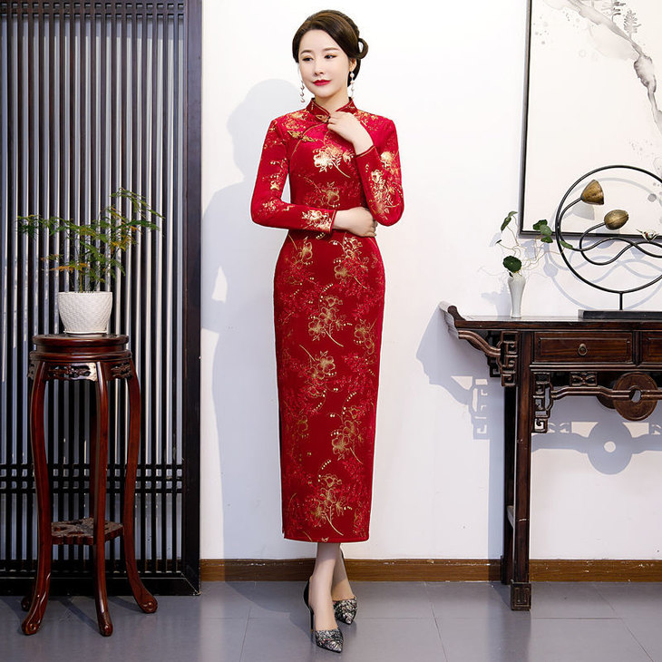 C9004春夏秋冬新款旗袍裙长款旗袍两件套表演礼服