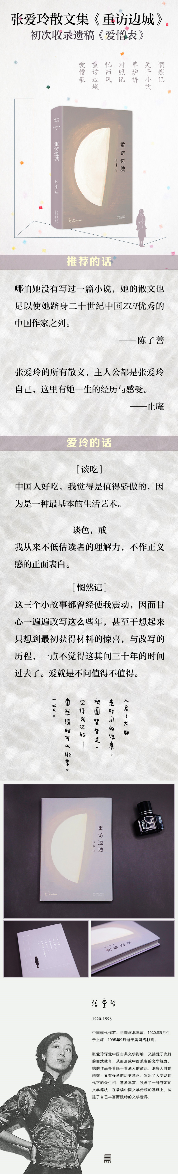·张爱玲的文学生涯是从创作散文起步的。哪怕她没有写过一篇小说,她的散文也足以使她跻身二十世纪ZUI YOU秀的中国作家之列。——陈子善(中国现代文学专家)