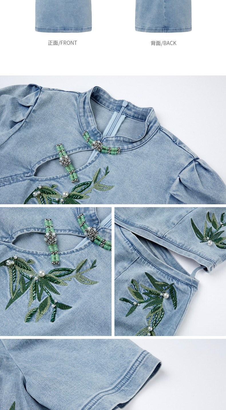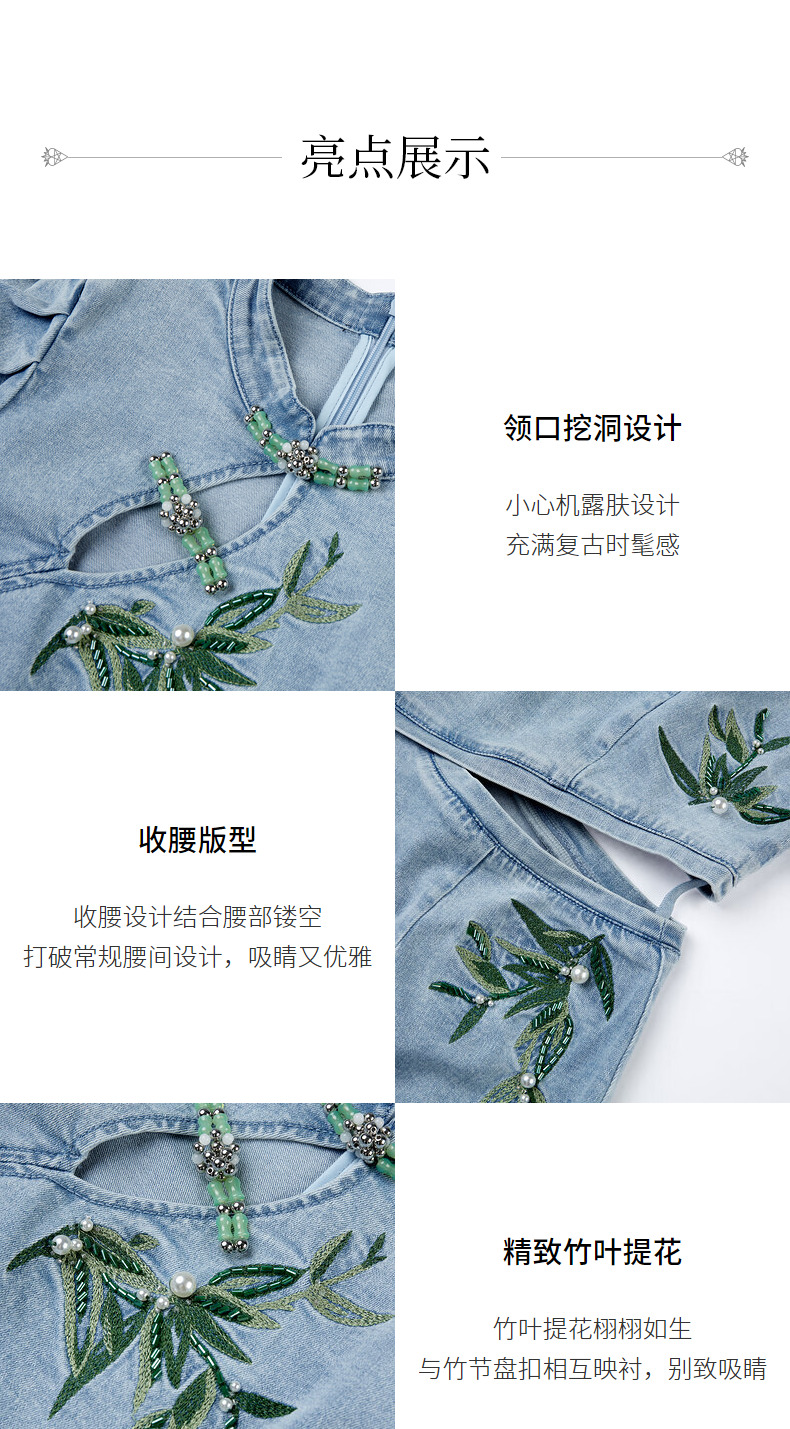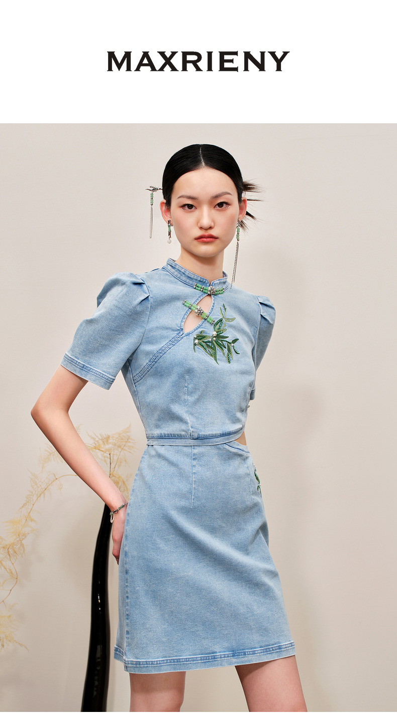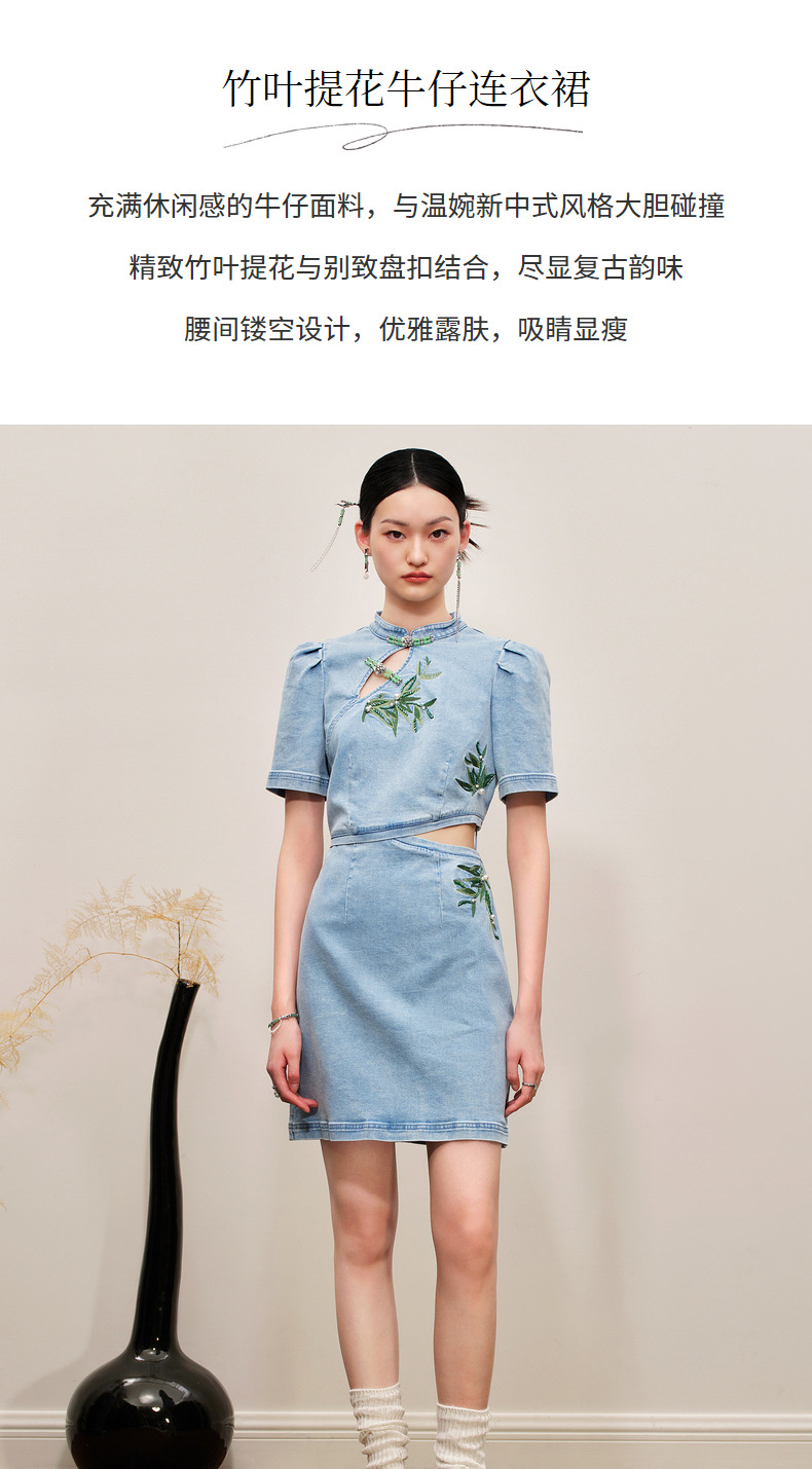 MAXRIENY新中式竹叶提花镂空牛仔连衣裙(货号:MC88DR504)