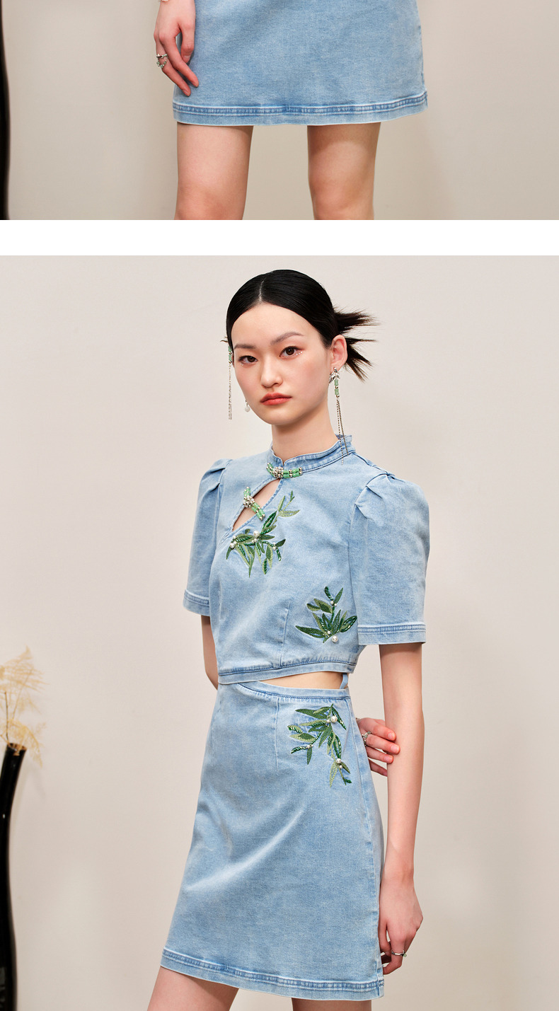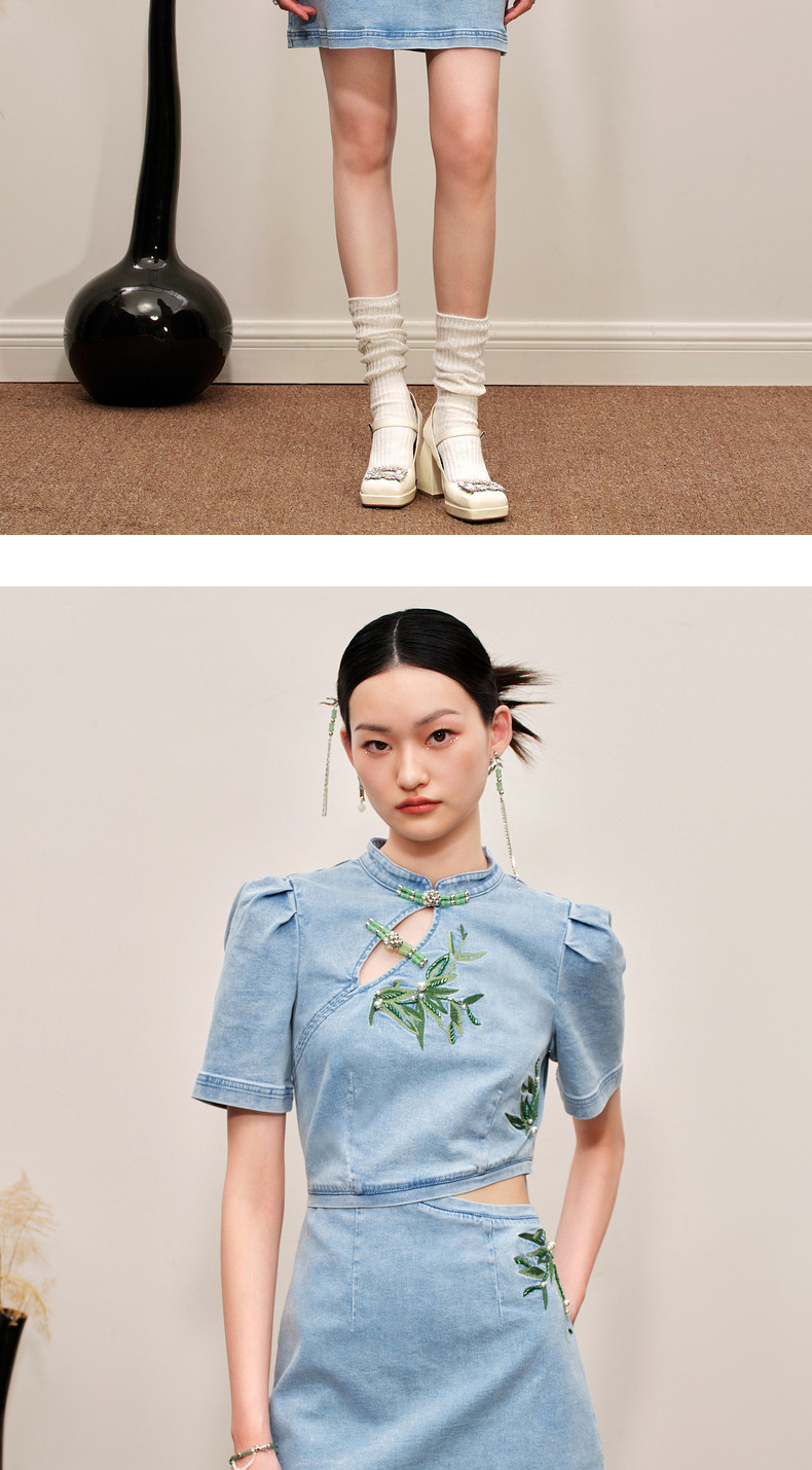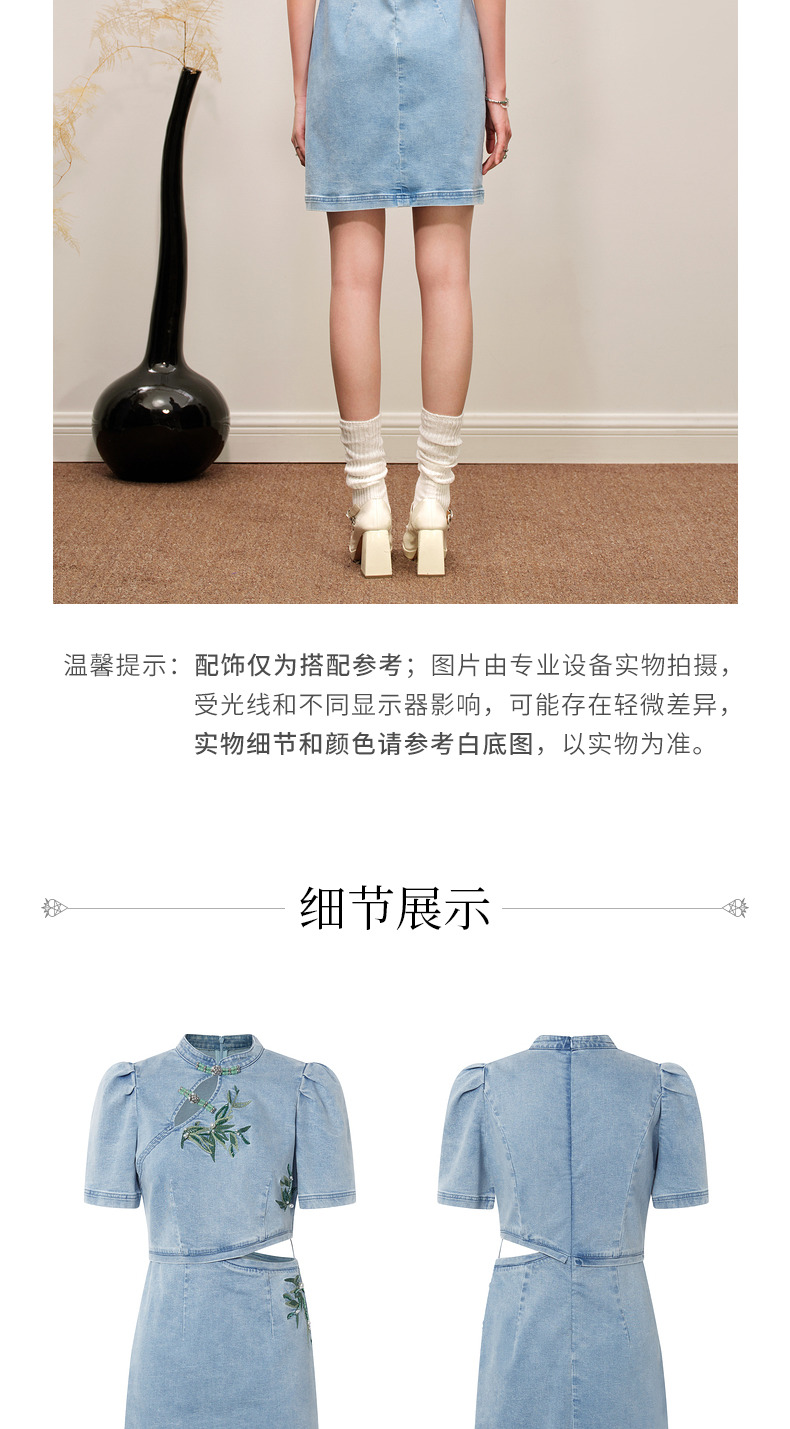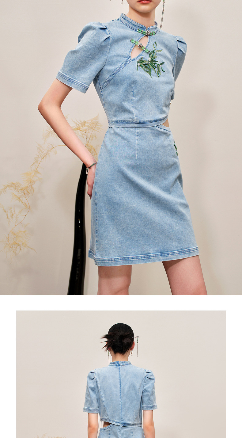 MAXRIENY新中式竹叶提花镂空牛仔连衣裙(货号:MC88DR504)