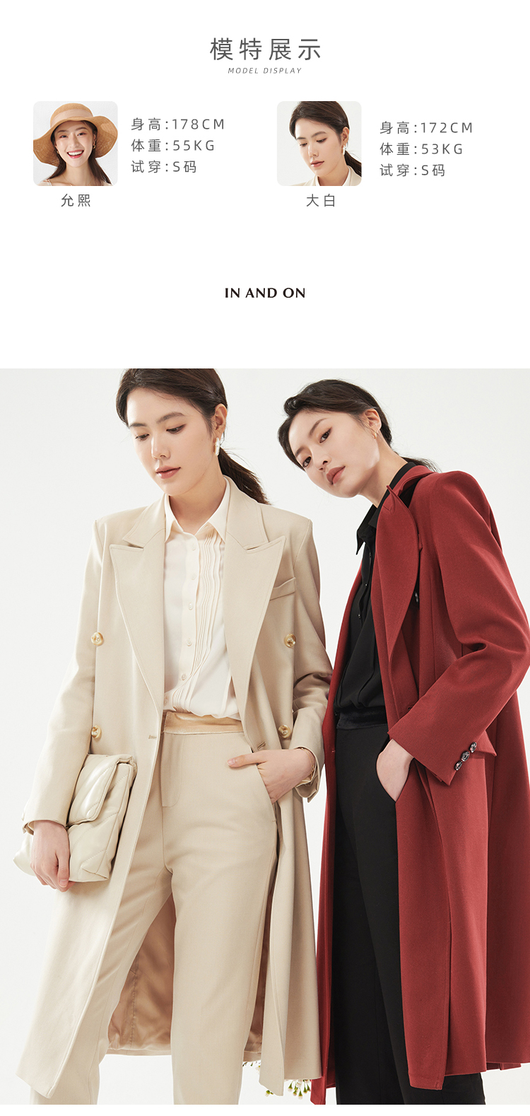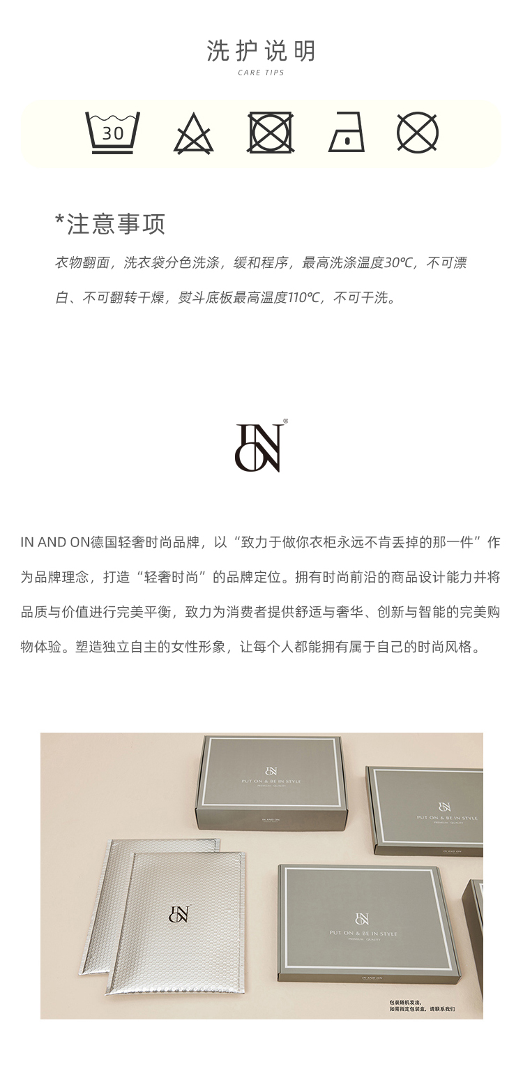 IN AND ON—轻奢时尚品牌,以“致力于做你衣柜永远不肯丢掉的那一件”作为品牌理念,打造“轻奢时尚”的品牌定位。拥有时尚前沿的商品设计能力并将品质与价值进行完美平衡,致力为消费者提供舒适与奢华、创新与智能的完美购物体验。塑造独立自主的女性形象,让每个人都能拥有属于自己的时尚风格。