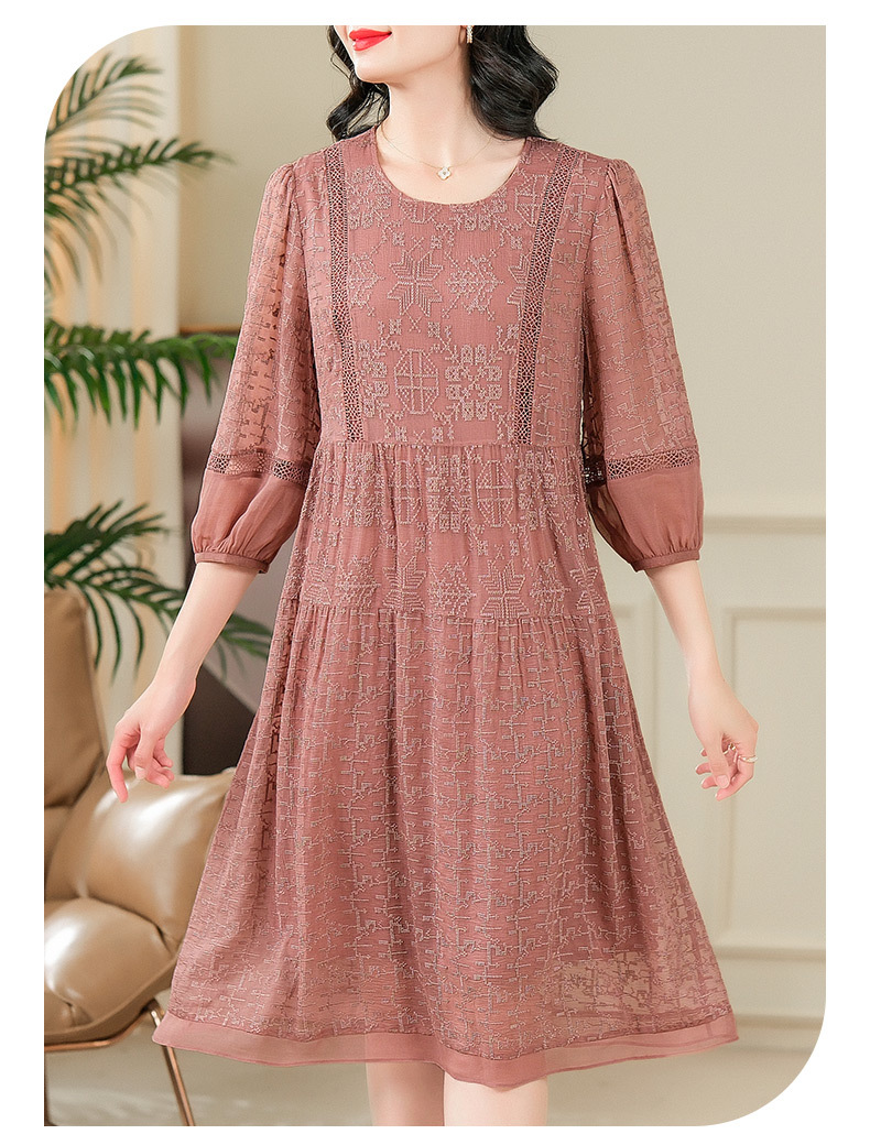 丁摩 夏季新款3D真丝刺绣桑蚕丝连衣裙宽松显瘦圆领气质真丝长裙5ZF-6560