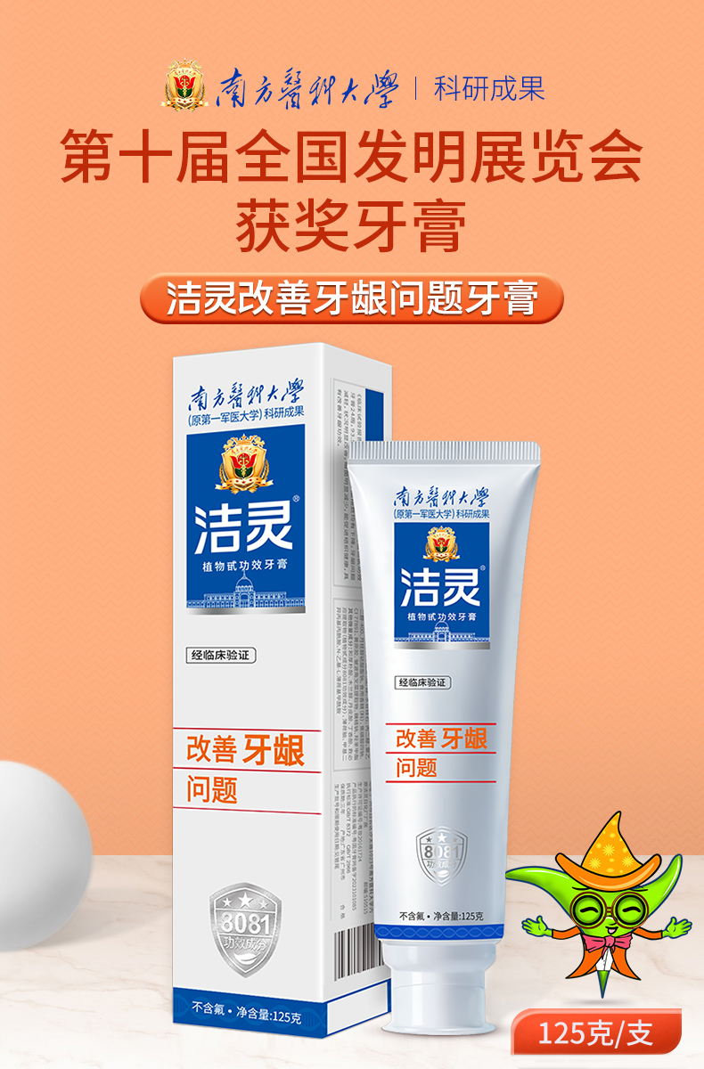 - 洁灵牙膏,由南方医科大学研制,牙膏的核心8081功效成分效果出众,在第十届全国发明展览会成为获奖牙膏。