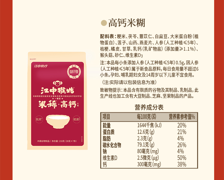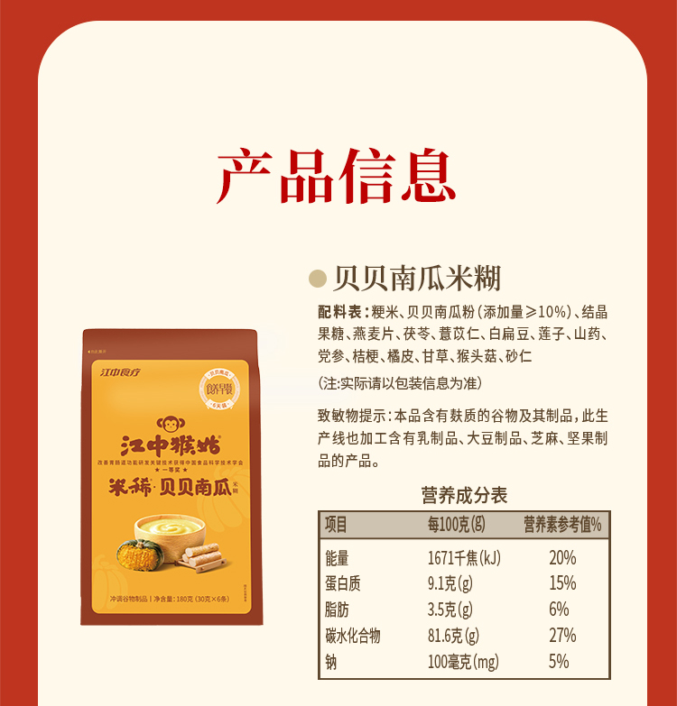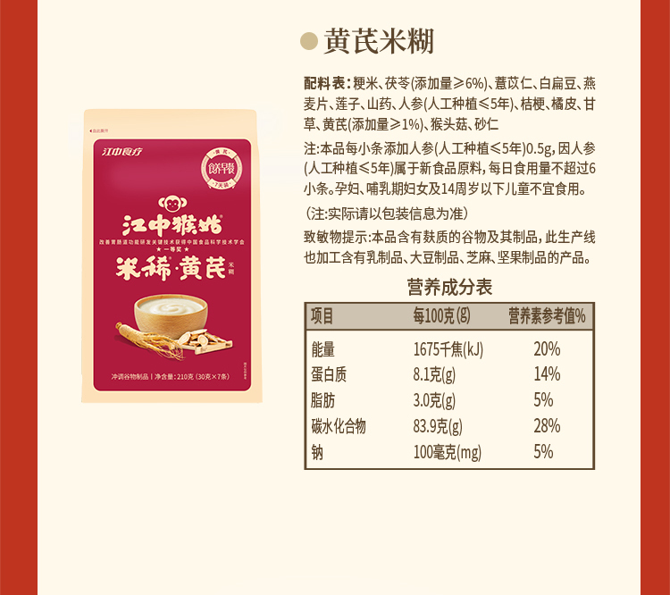 江中猴姑米稀小米红枣米糊 30天装 900g/30包/盒 2026年3月生产,保质期12个月;