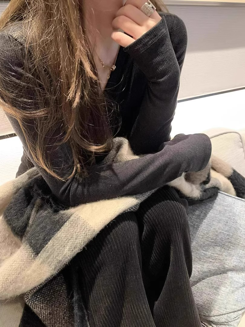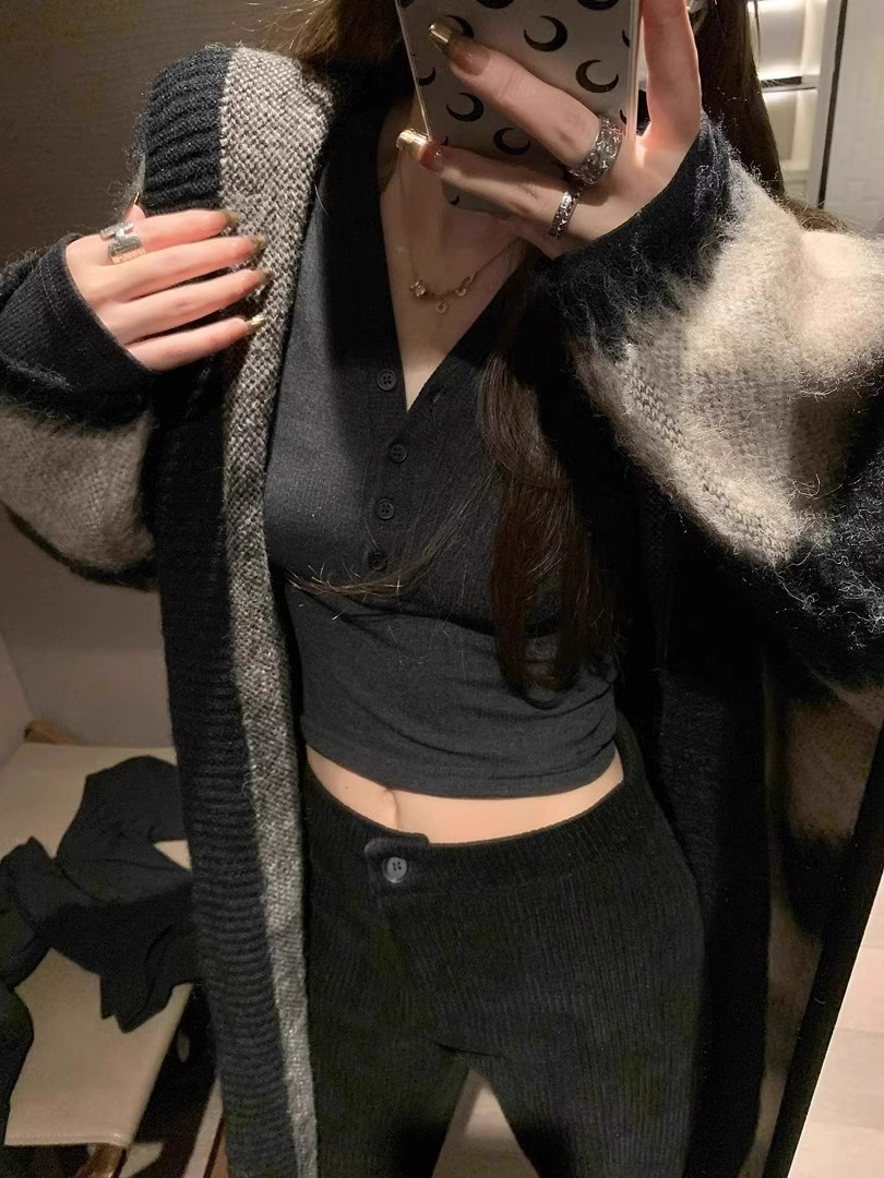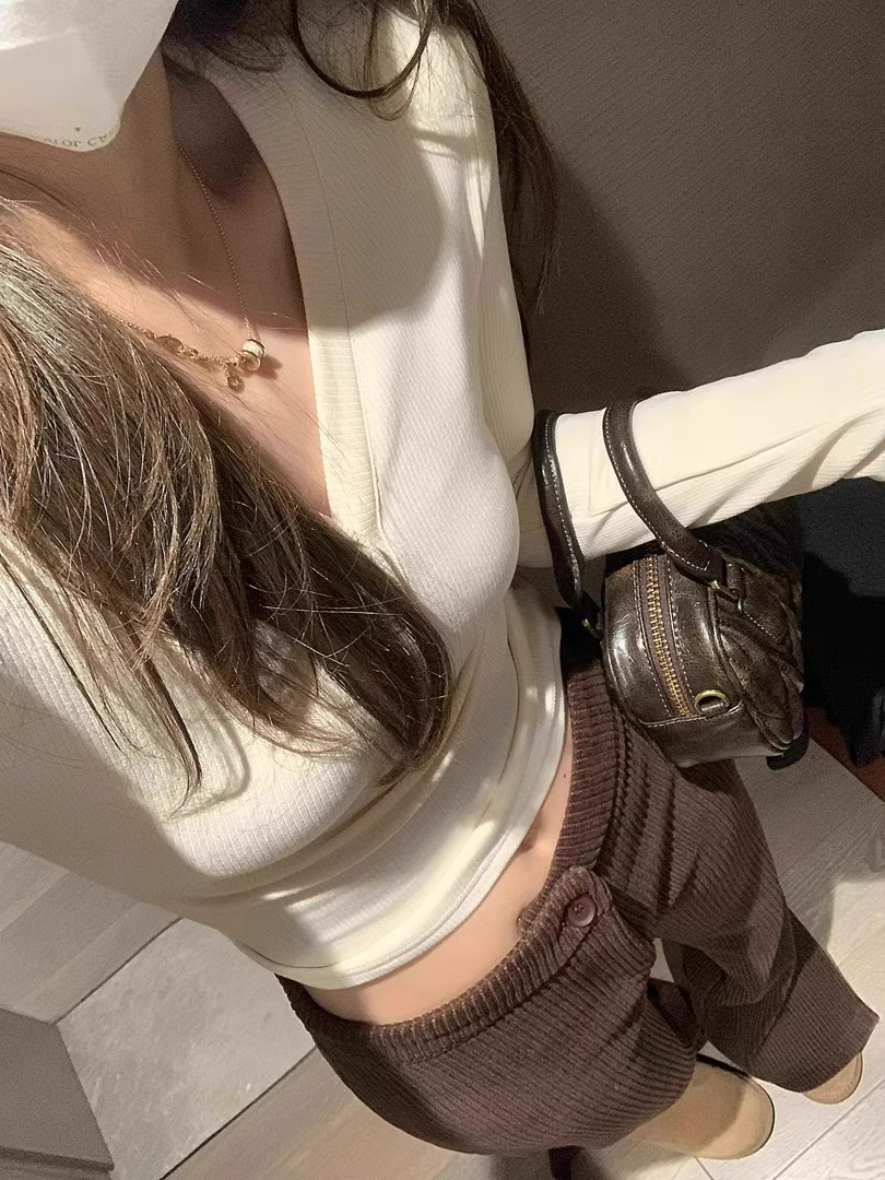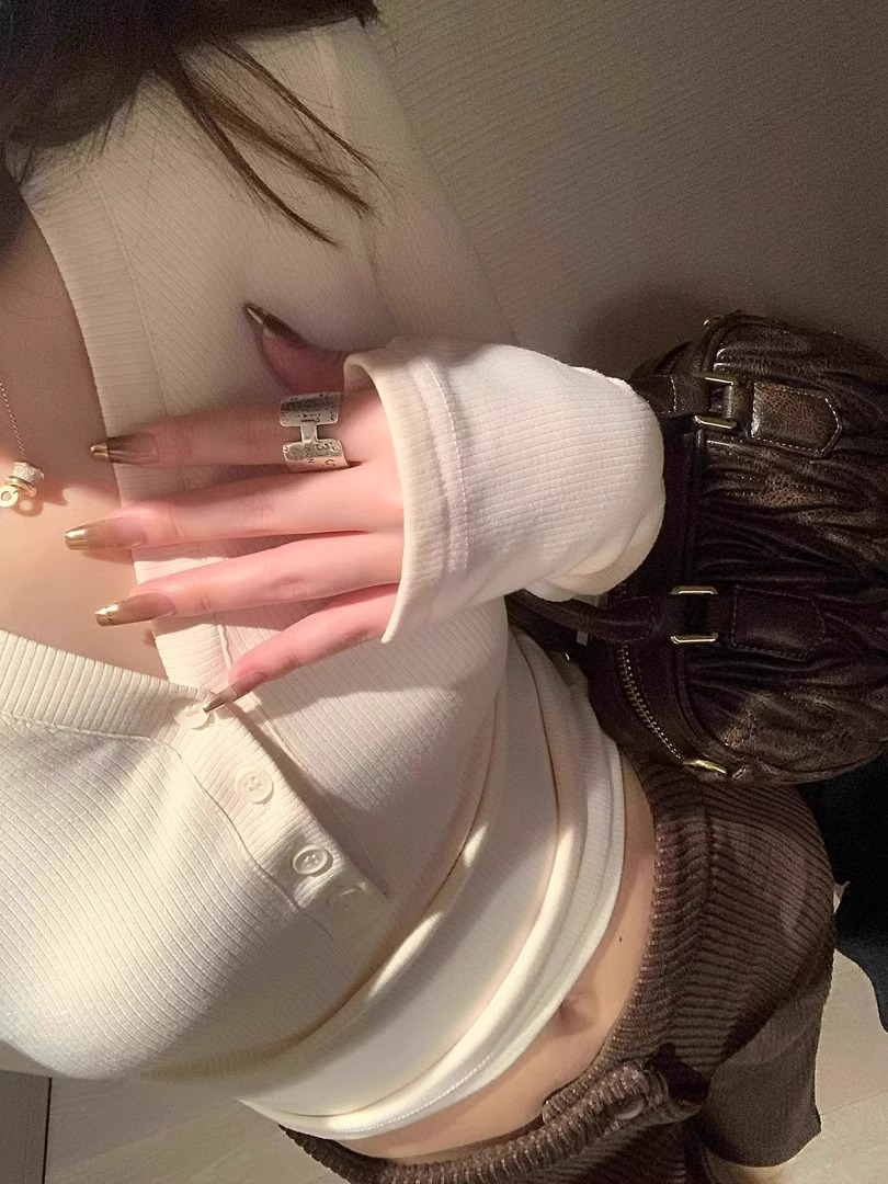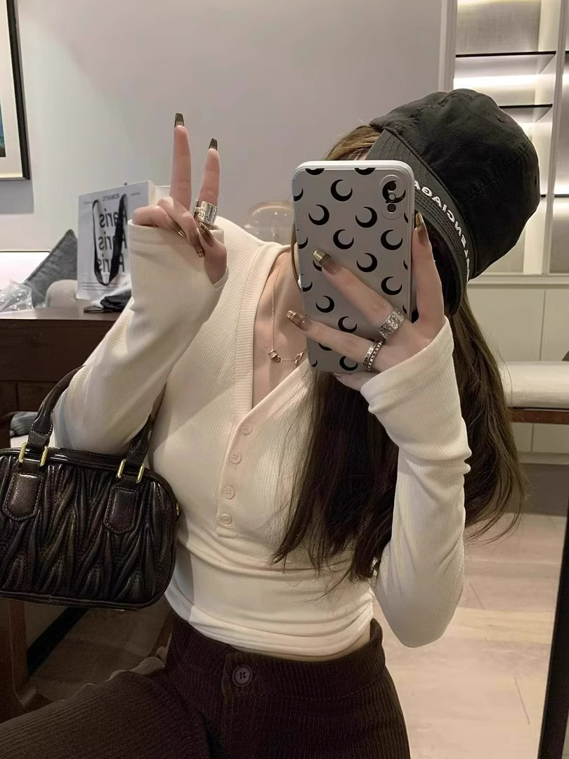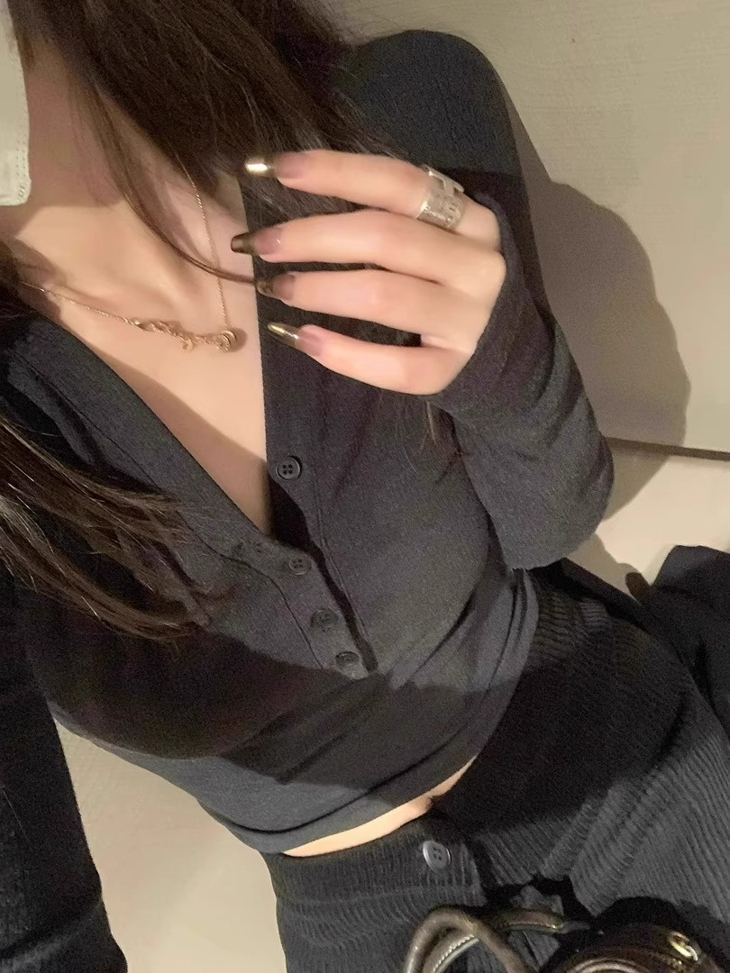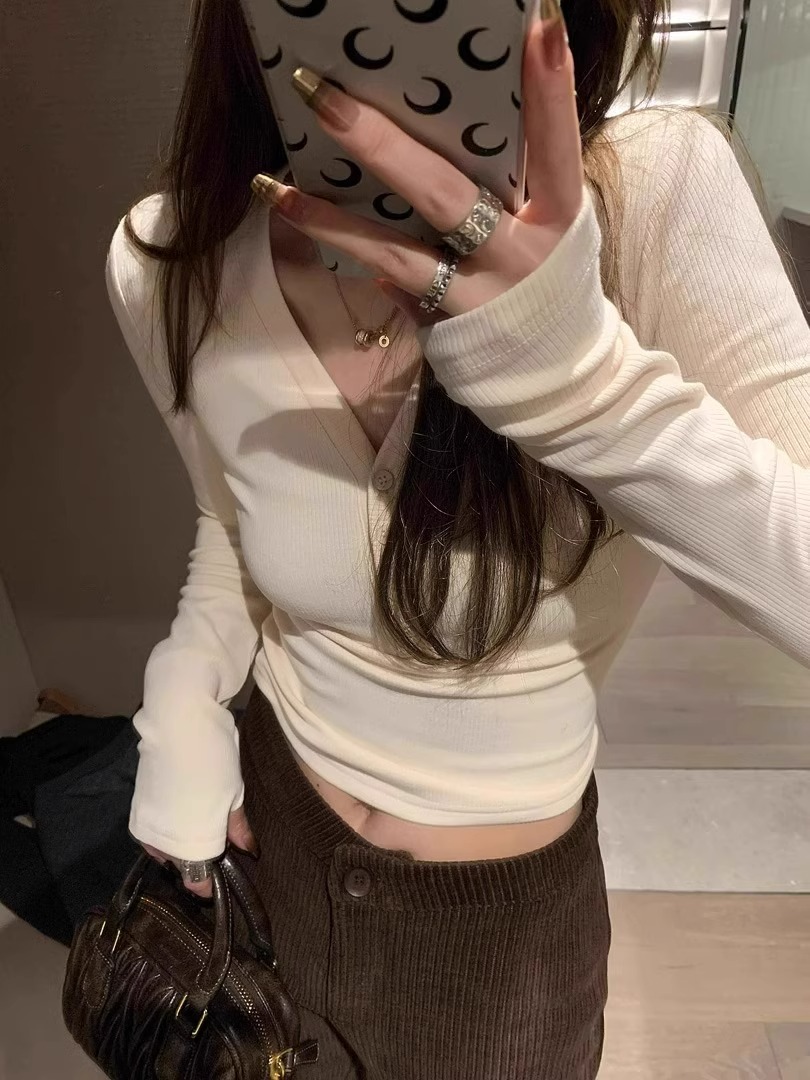 早春【流行漂亮纽扣 V领长袖打底衫】热辣妹 显瘦卡腰 灰色内搭T恤女