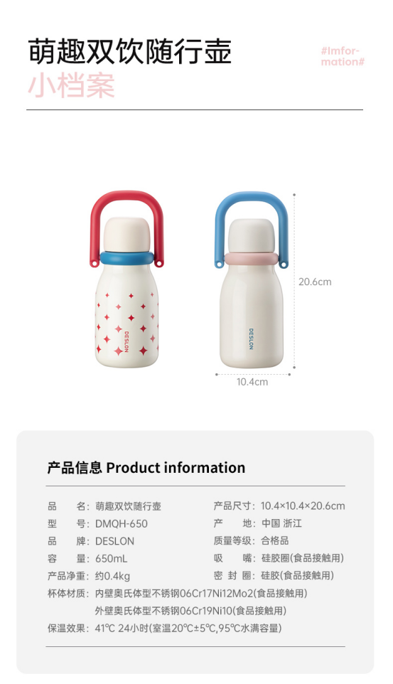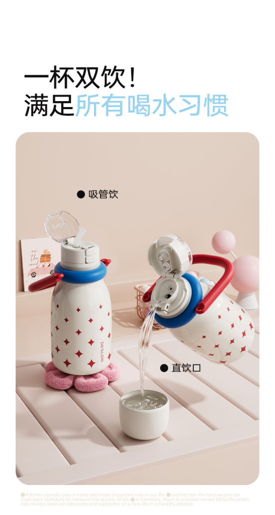 🔥秋冬必入!SUS不锈钢,高颜值双饮随行壶【德世朗DMQH-650萌趣双饮随行壶】💥650ML大容量!!🧀送朋友当礼物很不错✅舒适握感 UU 拎手,随提随走做你的移动补水库