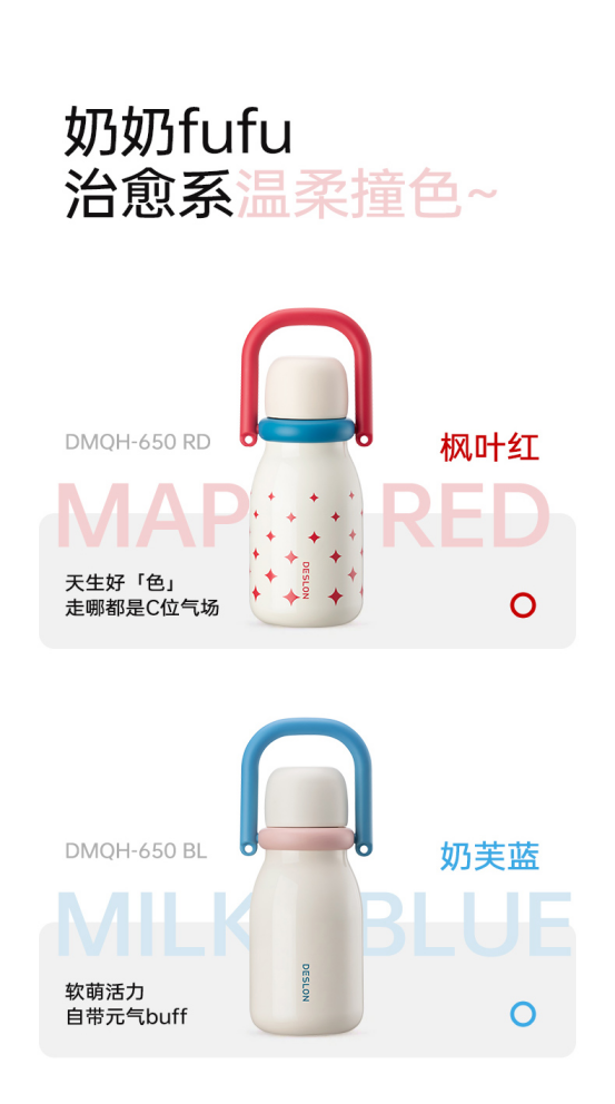 产品颜色:奶芙蓝(BL)、枫叶红(RD)