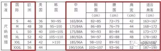 尺码对照图