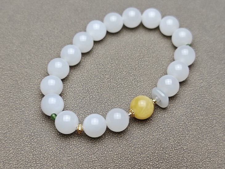 和田玉青海料冰底羊脂玉10mm招财转运手串,细腻油润,密度好,脂分足,肉质好,白度好,冰底料,颗颗完美,脂粉太好了,配天然的蜜蜡圆珠、白玉跑环还有精美碧玉珠子,雅致大气,非常漂亮,上手绝了