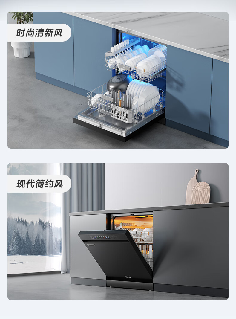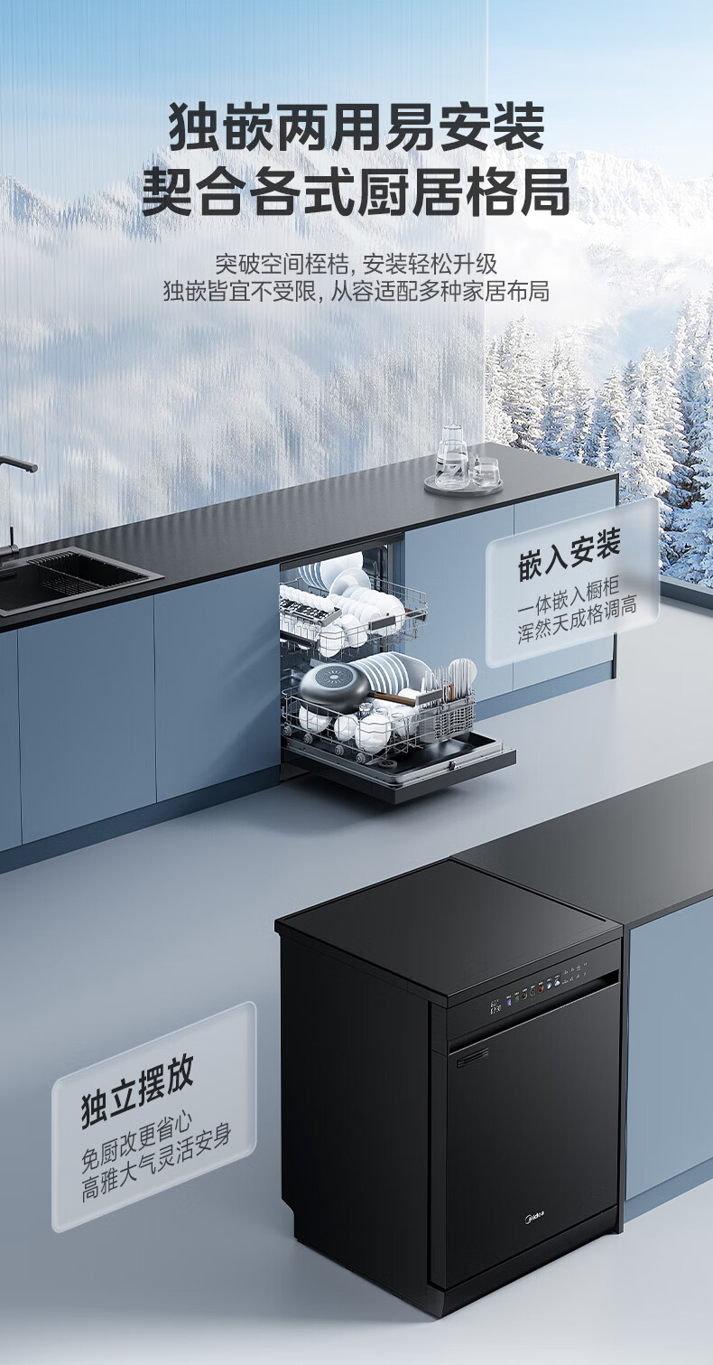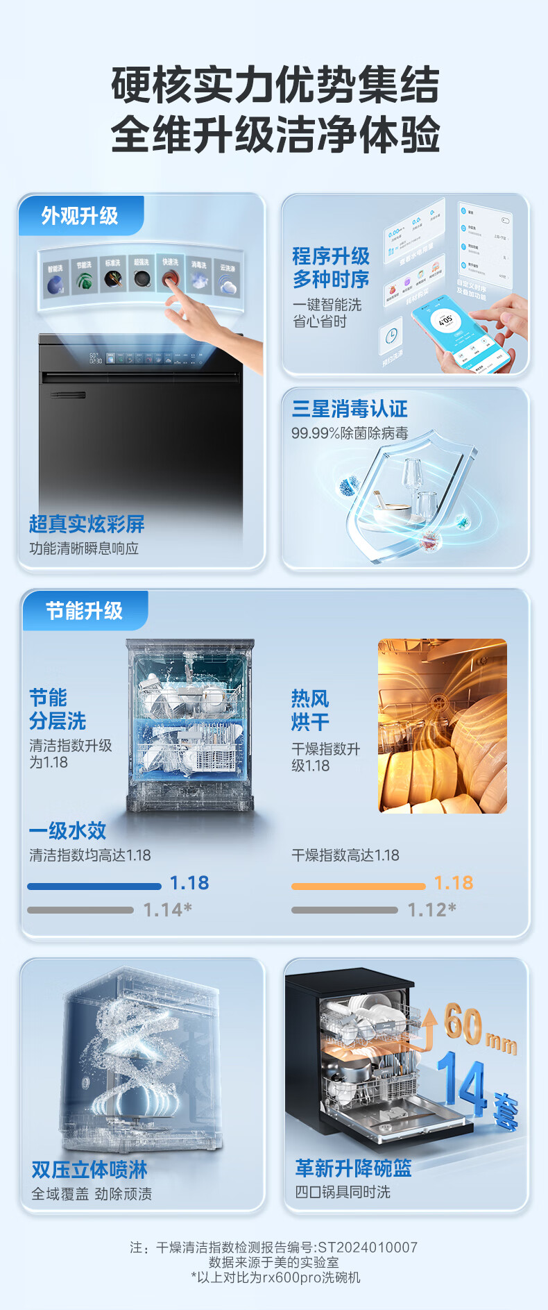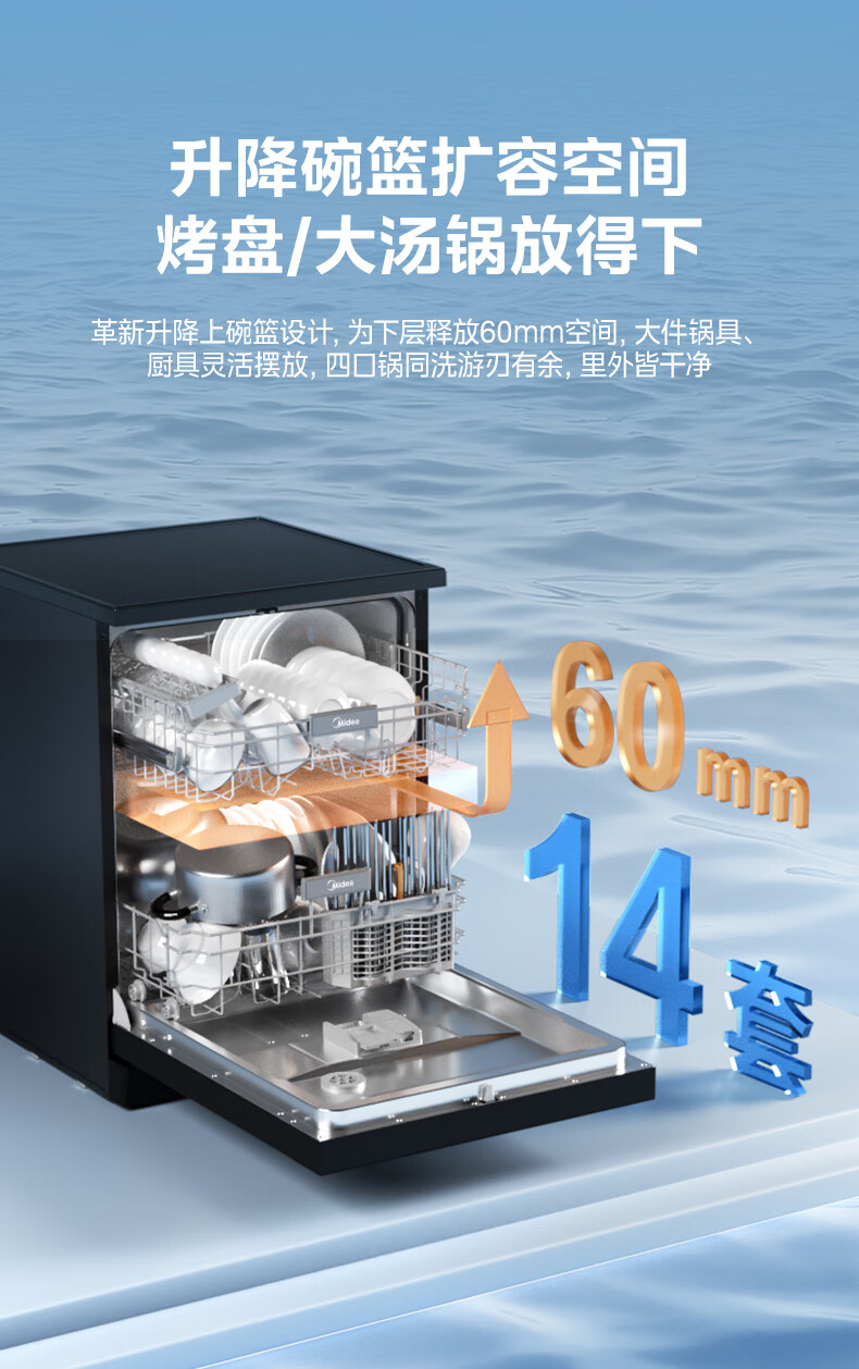 的(Midea)14套嵌入式洗碗机RX600Max 105℃热风烘干+升降碗篮 一级水效 三星消毒分层洗