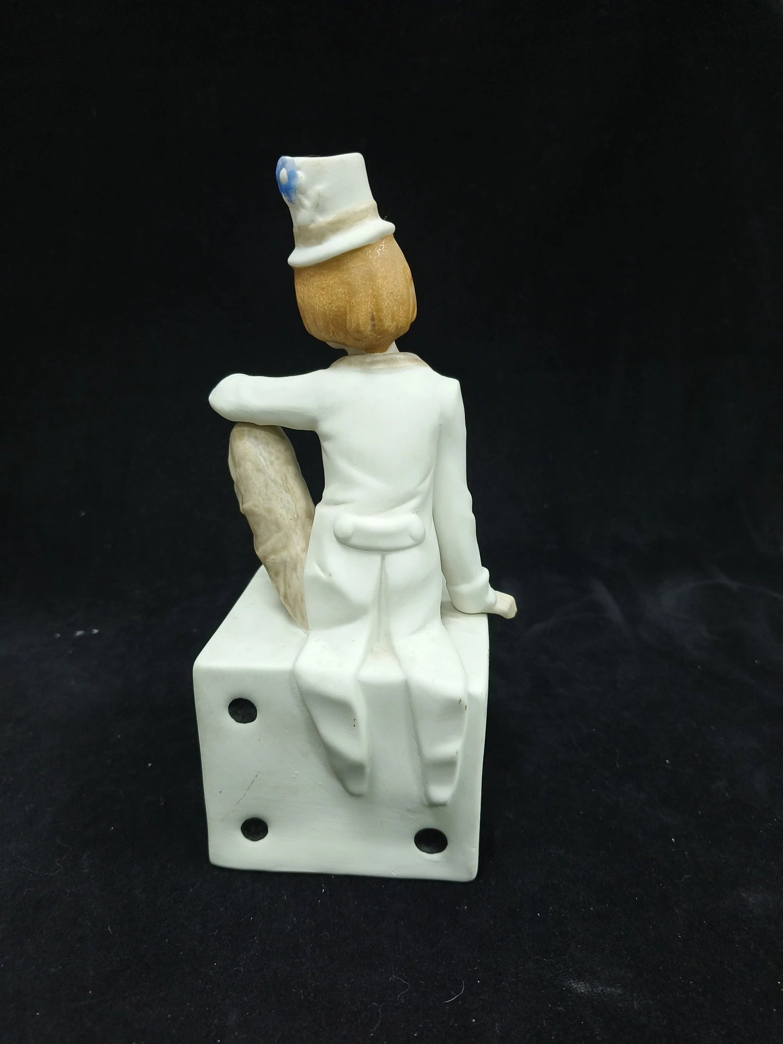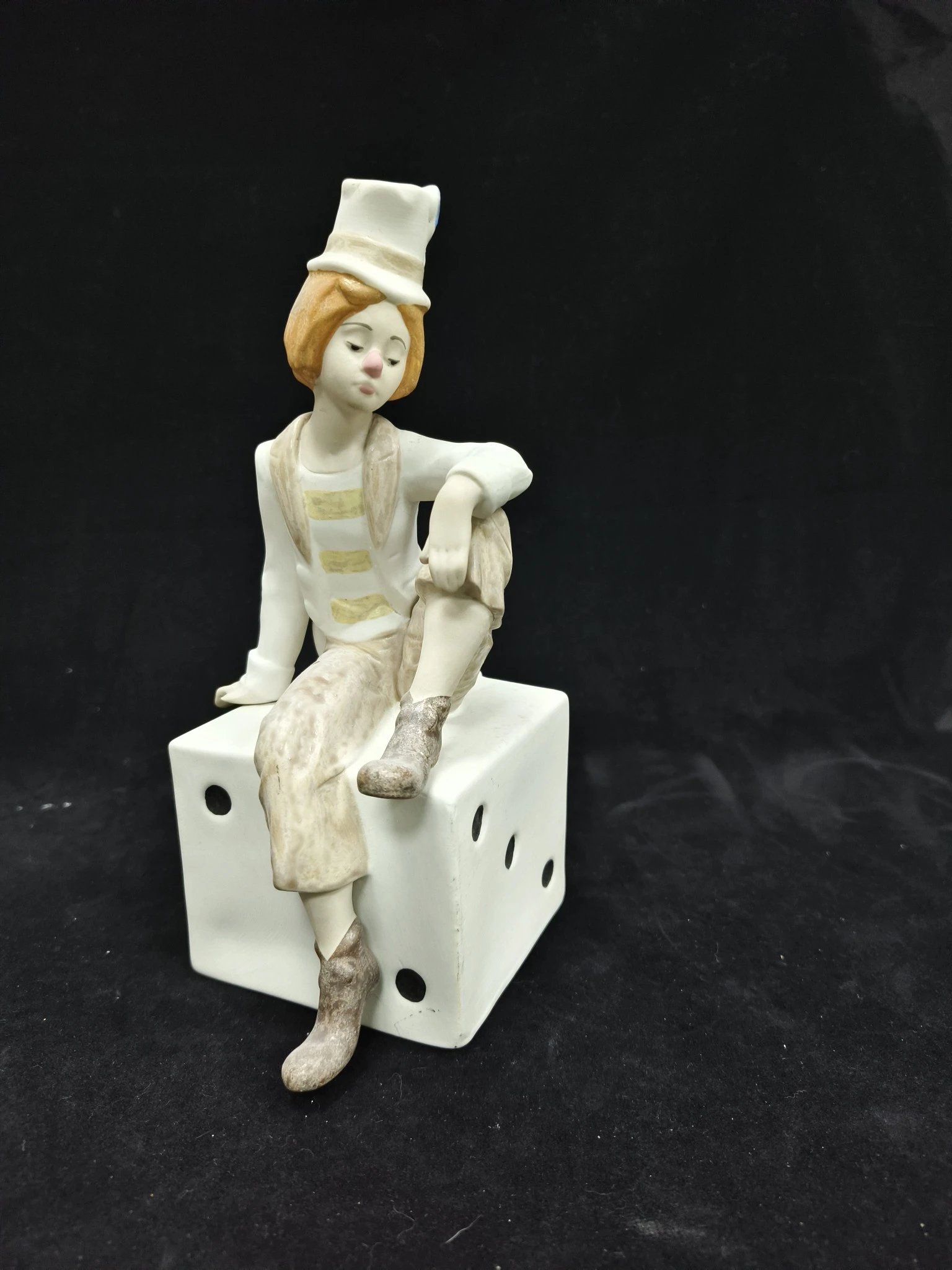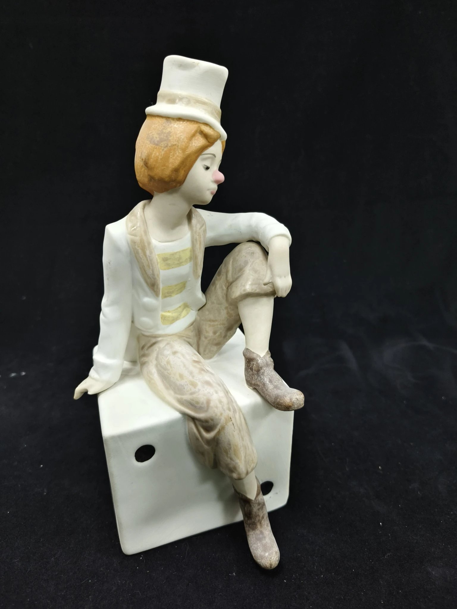 西班牙制作的素面瓷小丑瓷偶,年轻的小丑略带忧伤坐在高处,微微下垂眼眸望向别处,面容十分清秀,红红的鼻子也是蛮可爱。不是大品牌的作品,素面略带灰尘,但是尺寸很大。高度25,宽度10左右,特价199~