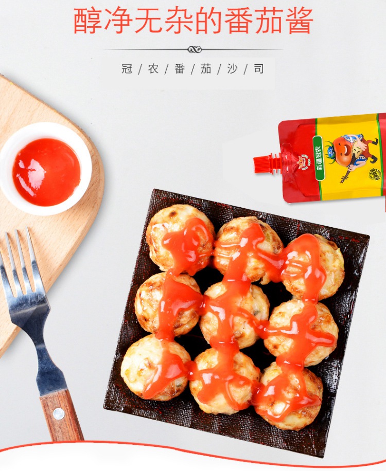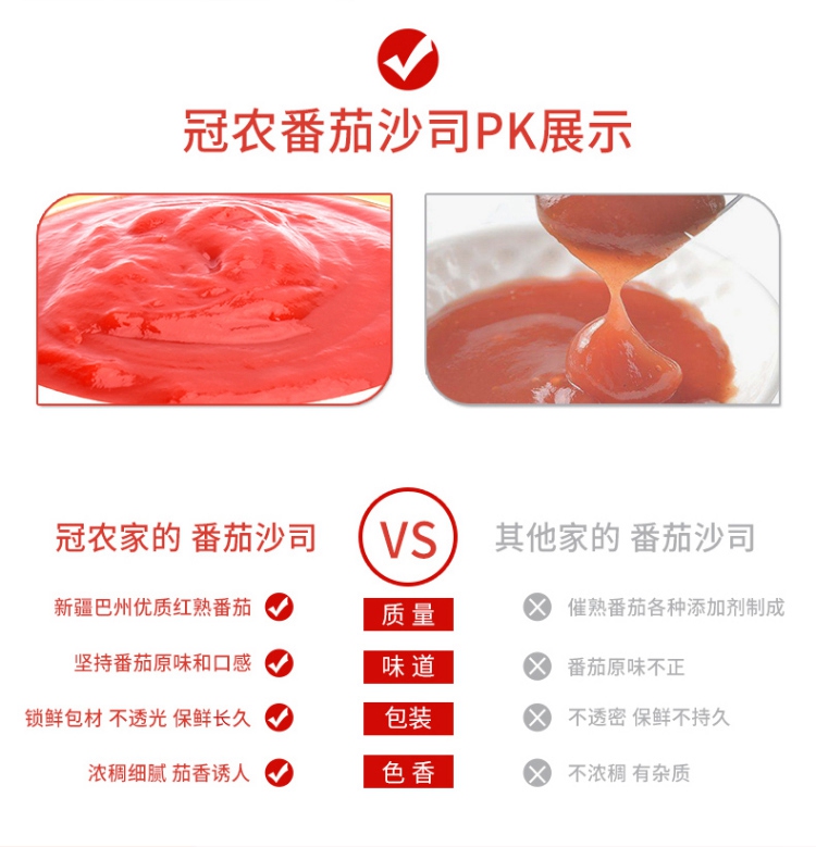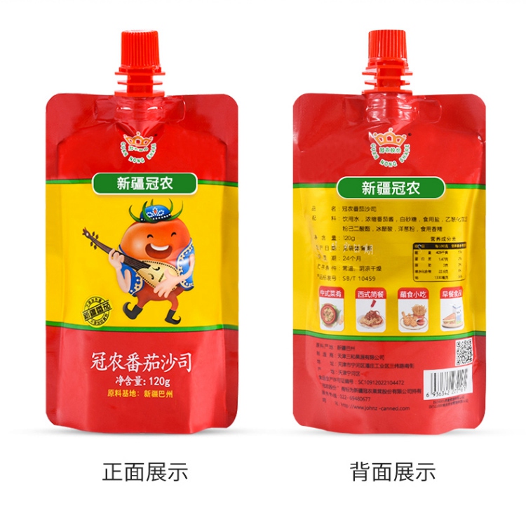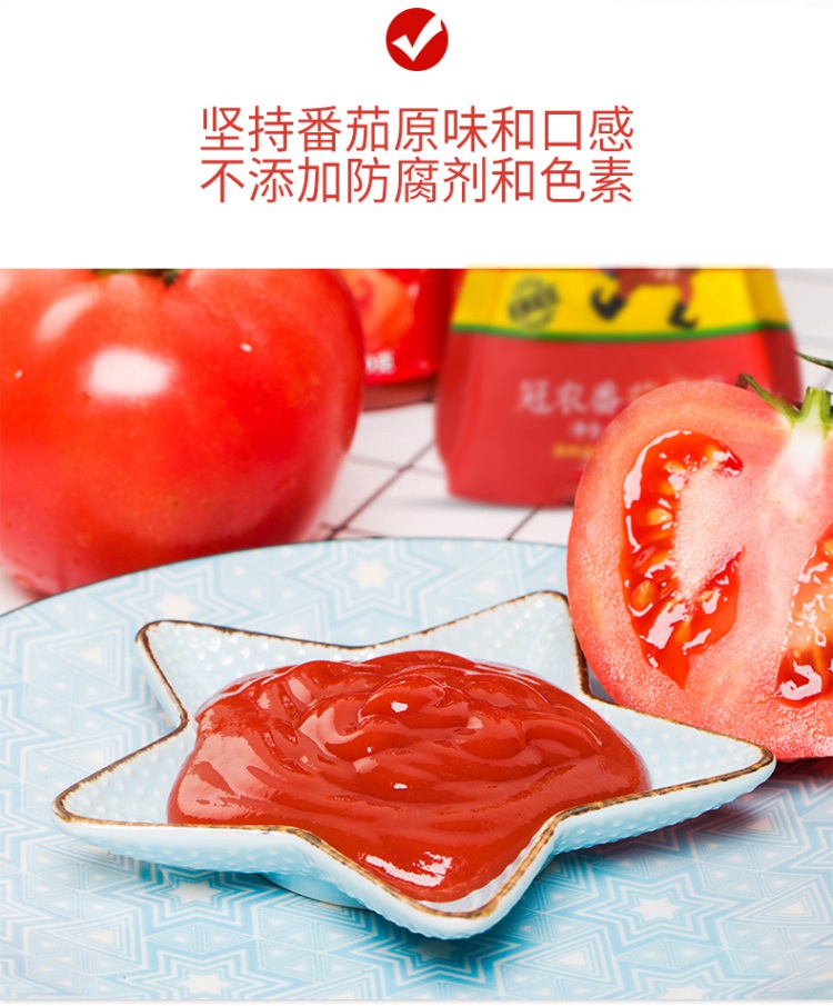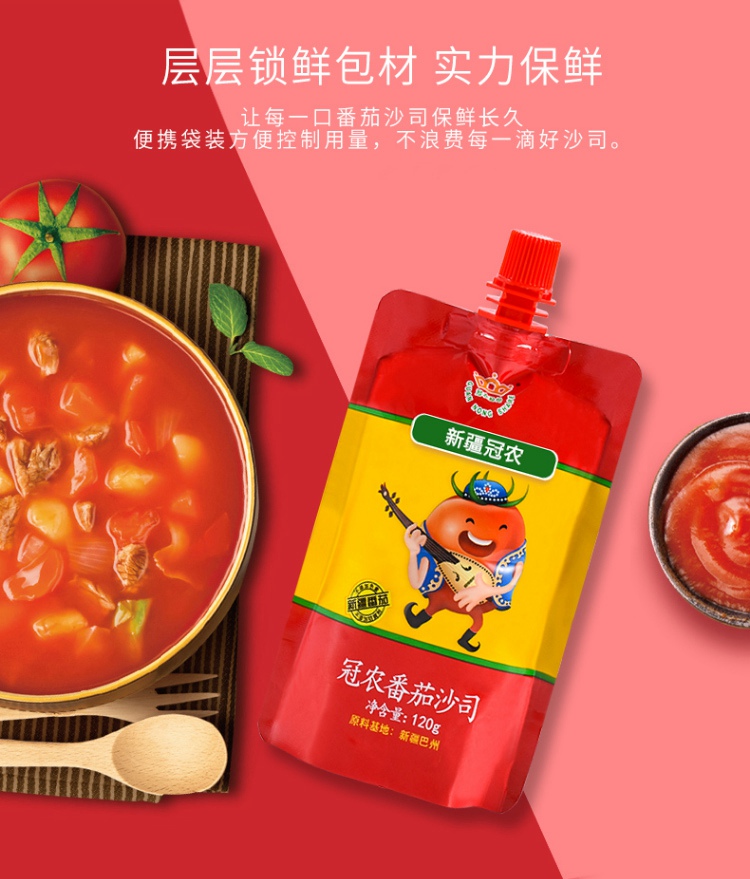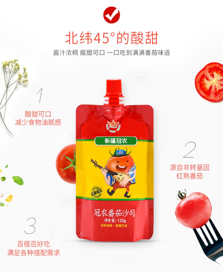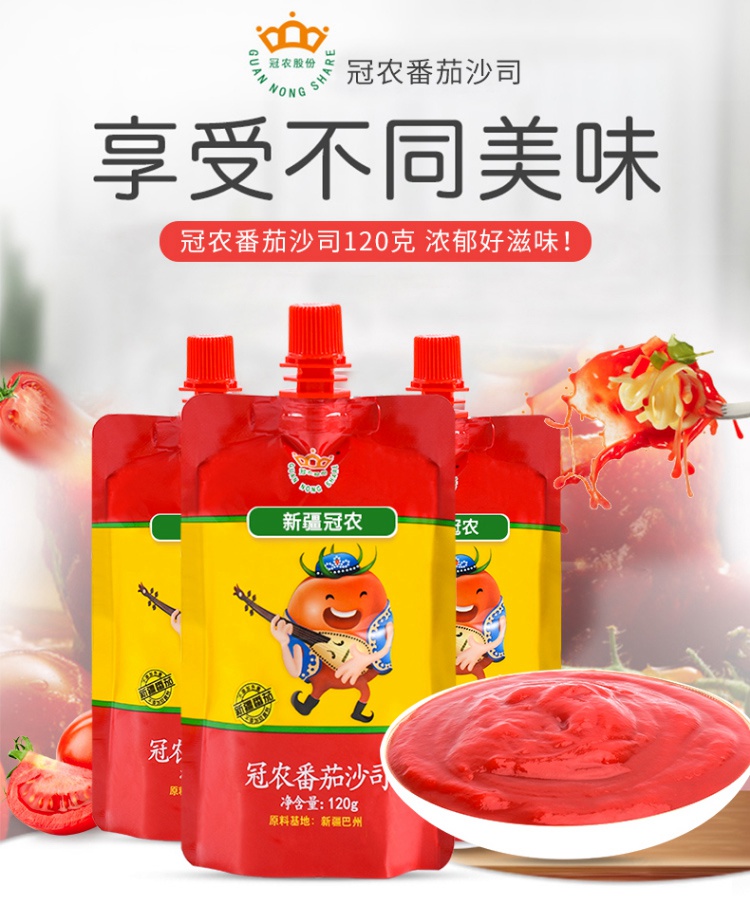【新疆冠农番茄沙司】120g*3*5袋,精选新疆巴州优质红熟番茄,坚持番茄原味和口感,不添加防腐剂和色素,一袋多用,百搭百好吃