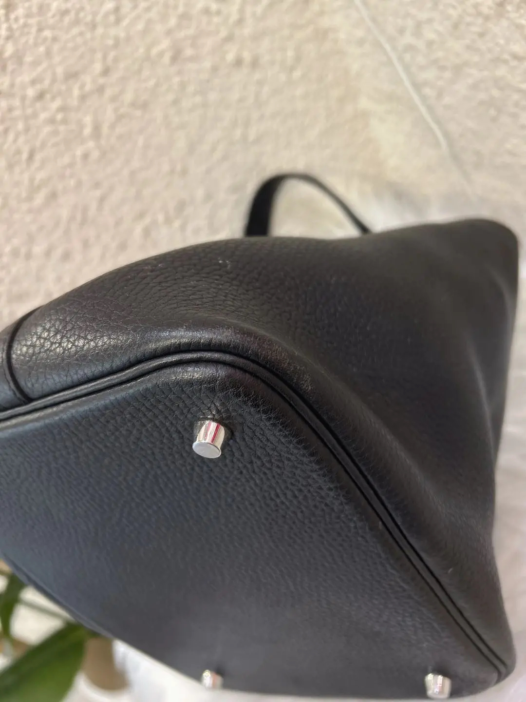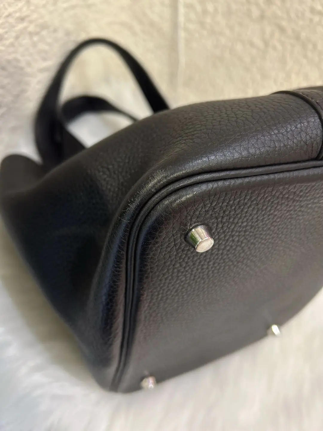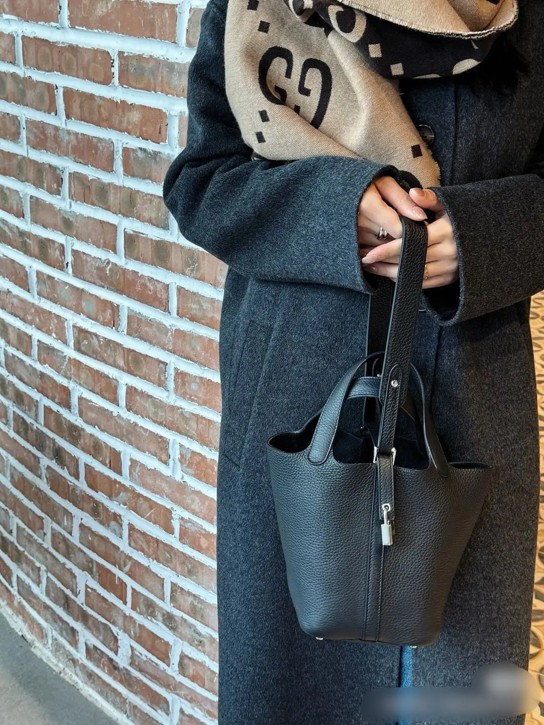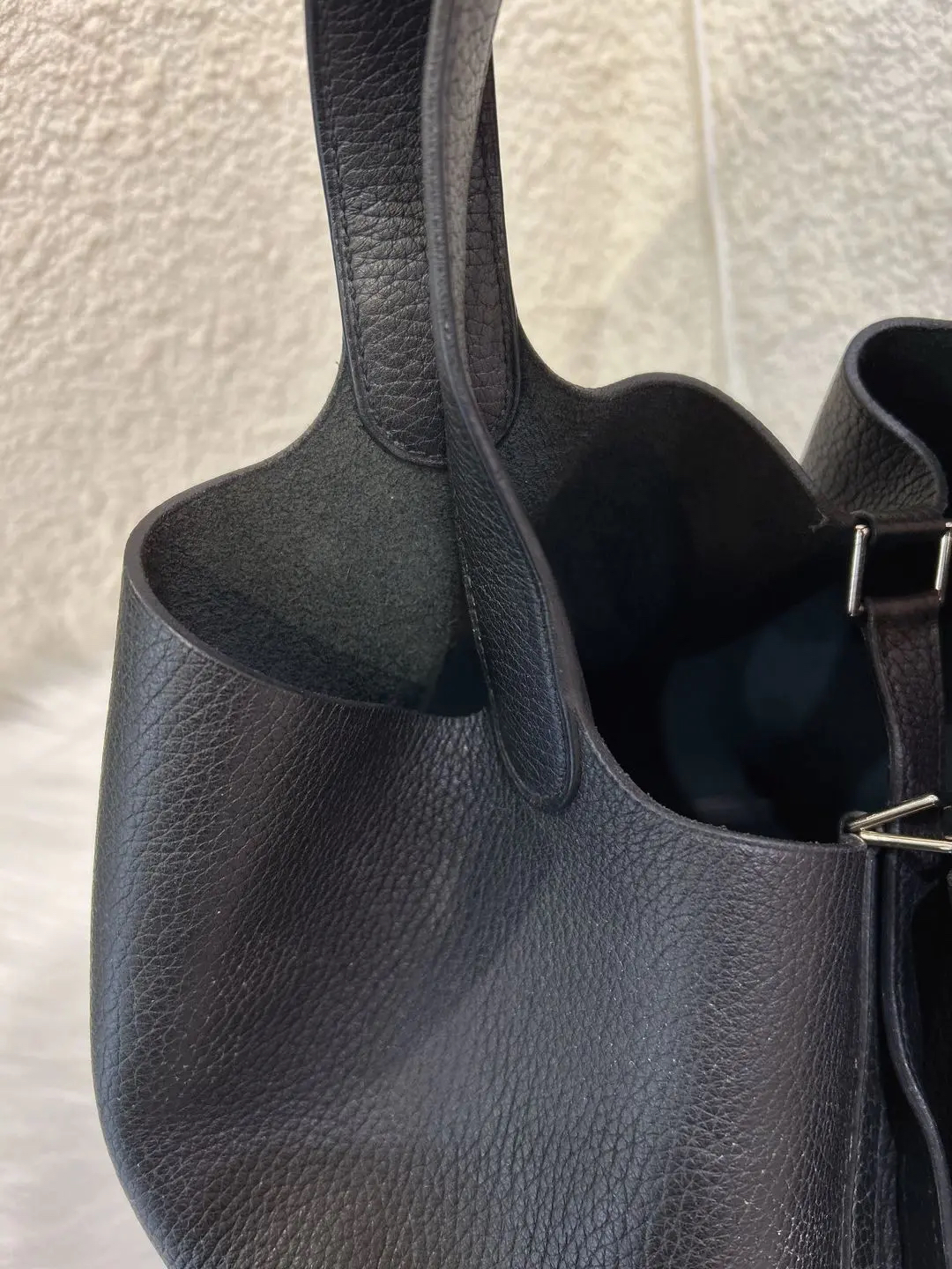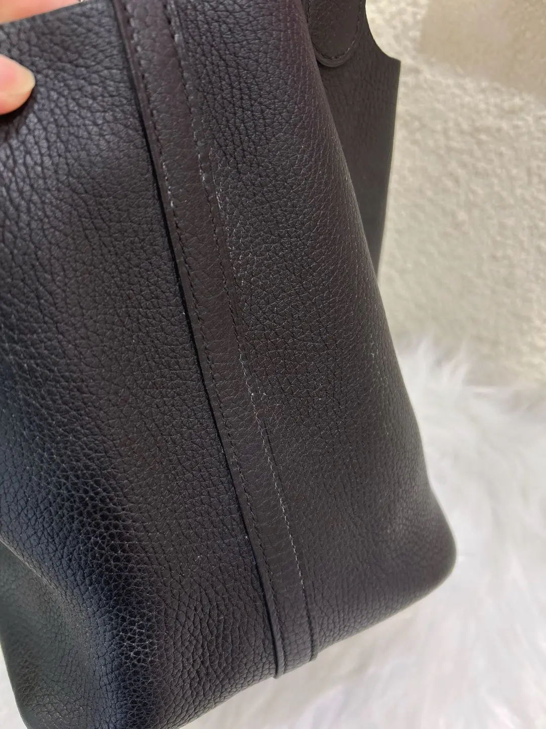 【商品详情】正品二手 爱马仕 菜篮子22 黑色 银扣 tc皮 手提包🚙 95新 22×22 C刻 配件:锁 。缺钥匙 边角和金属正常使用感。知性又显白