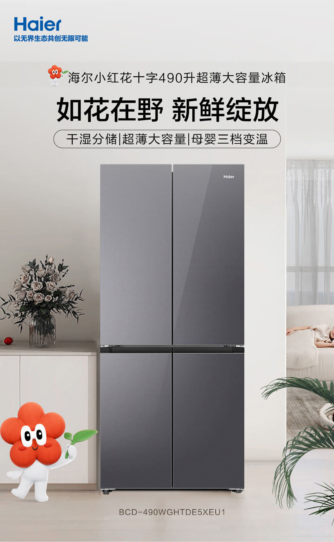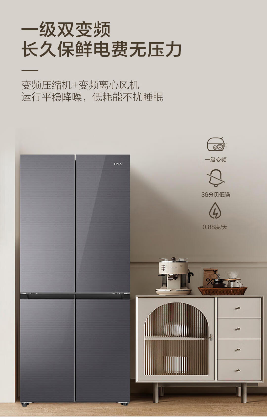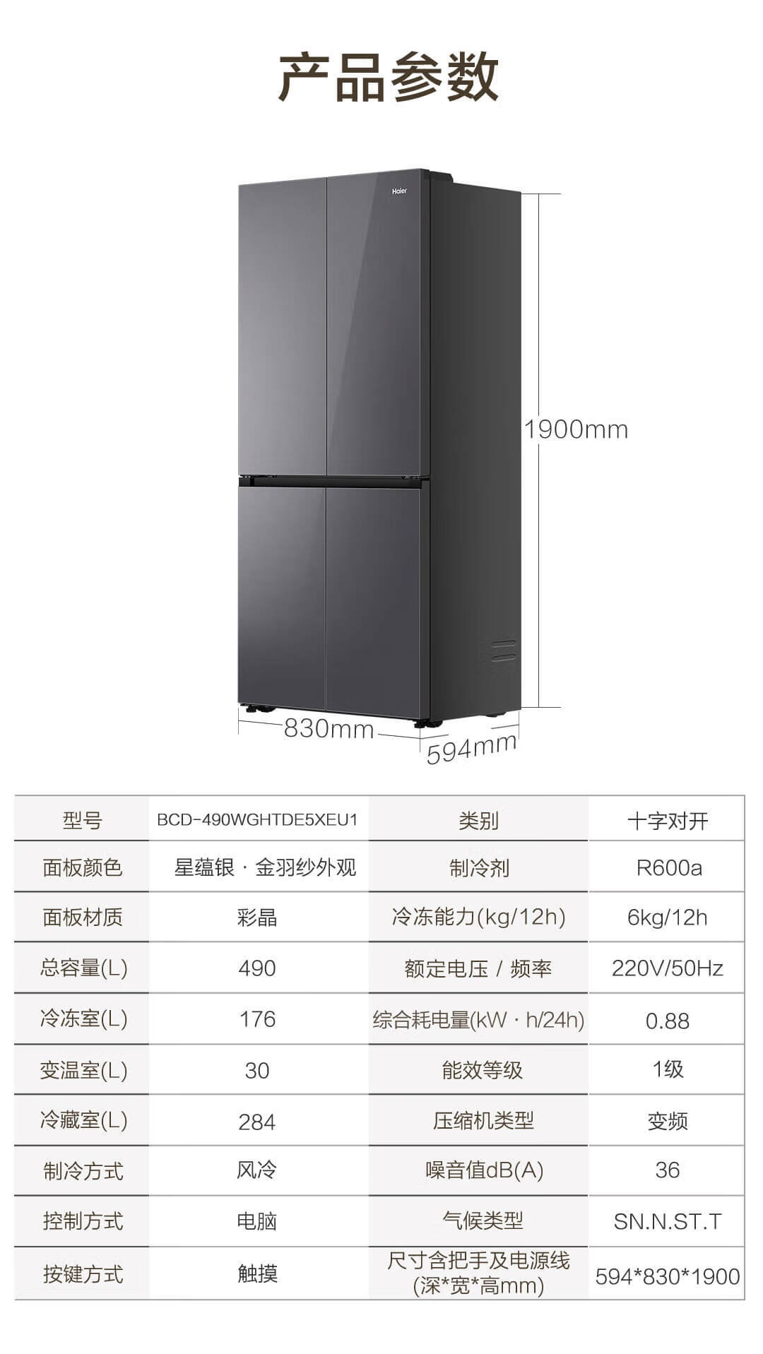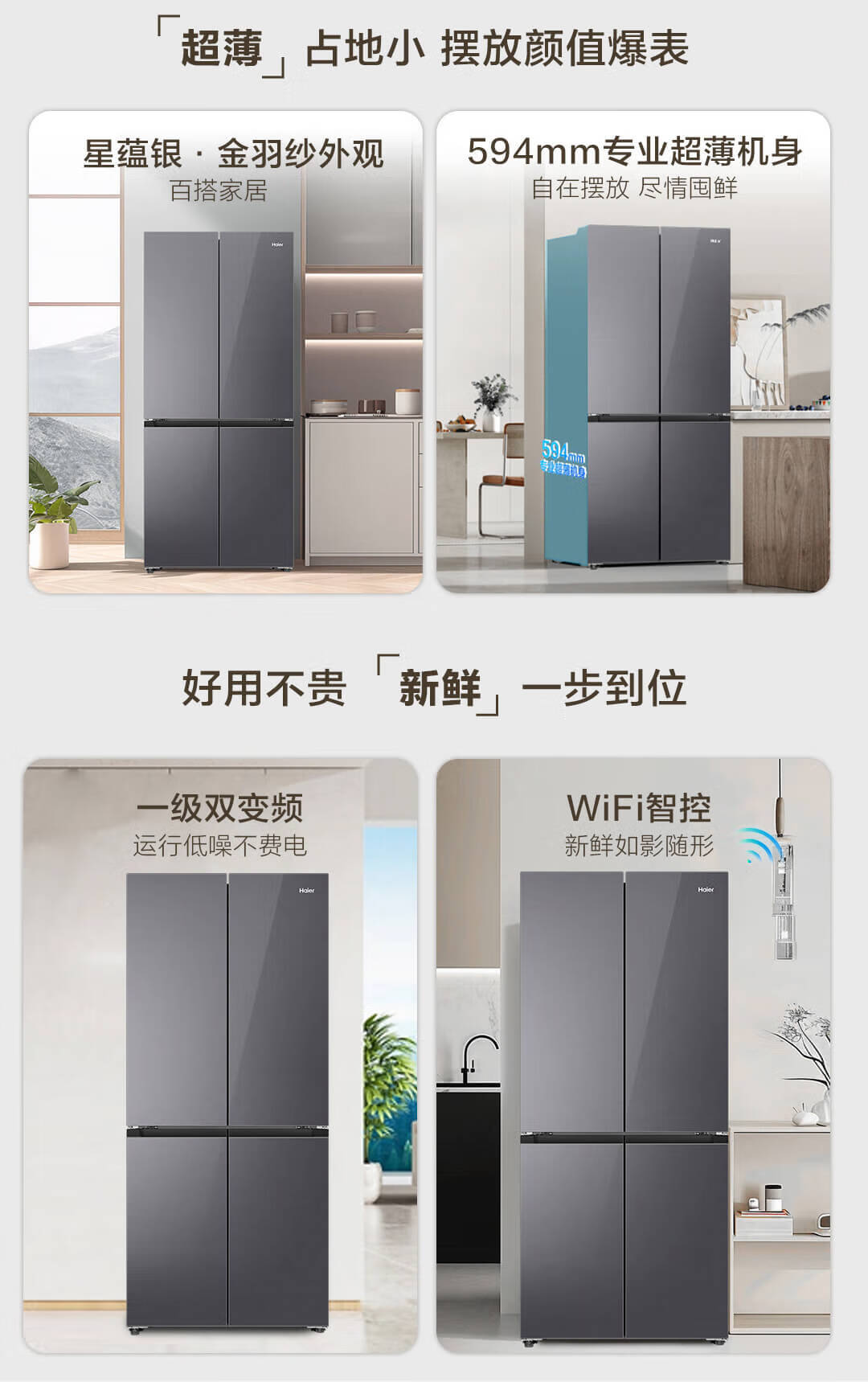 海尔(Haier)490升 十字对开电冰箱 干湿分储 三挡变温 黑金净化 双变频 一级能效 wifi智控 594mm超薄 BCD-490WGHTDE5XEU1