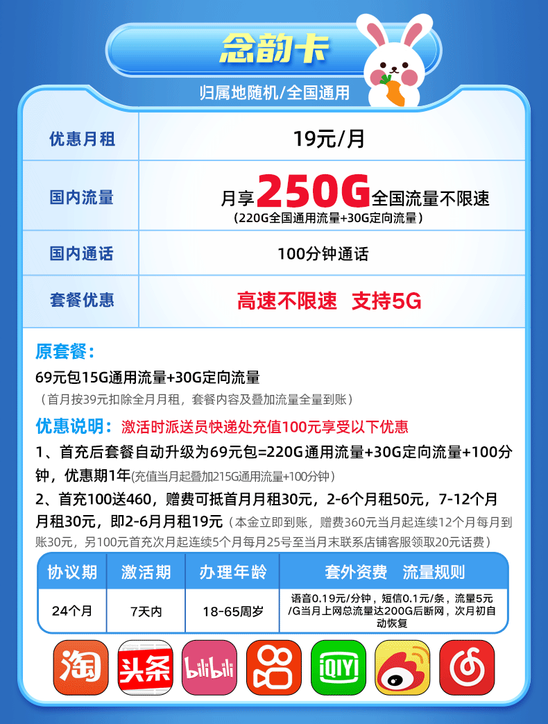 【支持5G高速】月月畅享195G不限速+100分钟!仅发广东东莞!念韵卡 商品图0