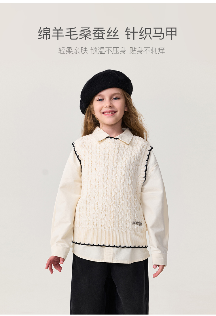 马克珍妮男女童撞色边绵羊毛针织马甲2025年秋冬新款551875