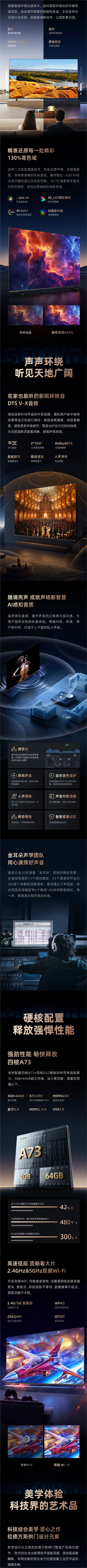 海信电视(912725)75A55N 4K MEMC U+超画质引擎 DTS V-X音效 远场语音 64GB大存储 130%色域 平板电视 75英寸