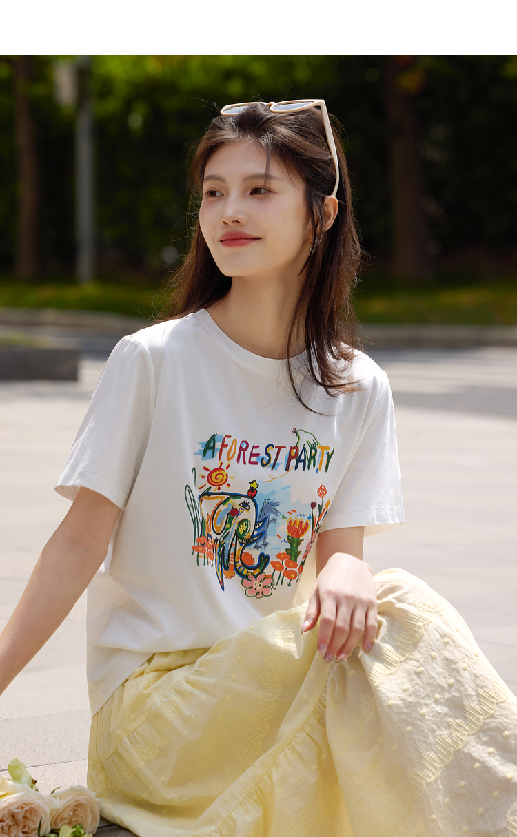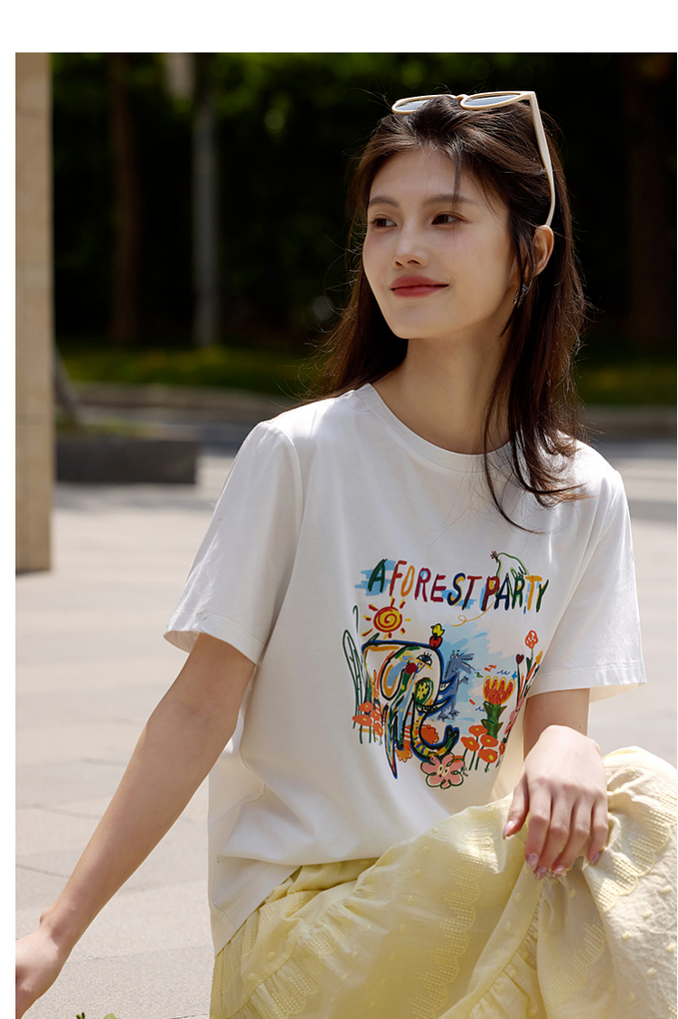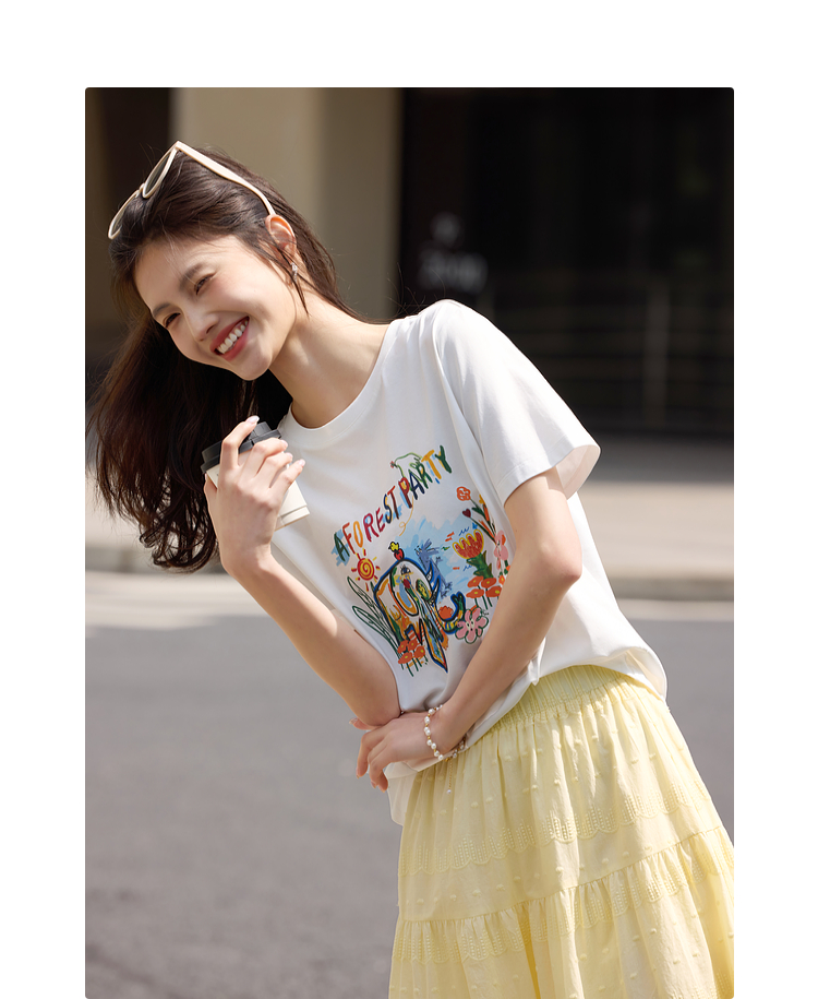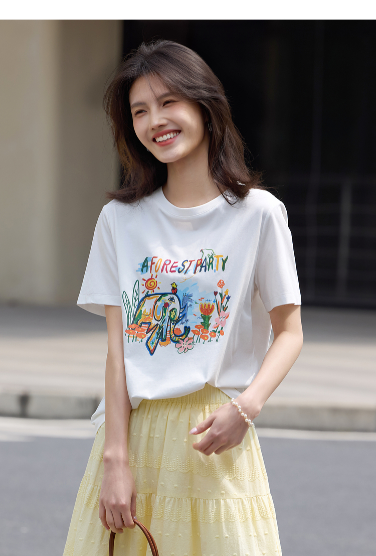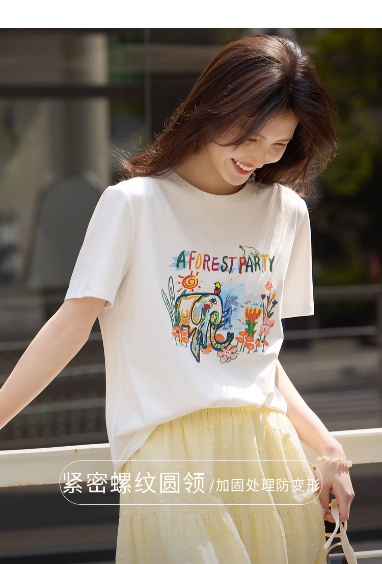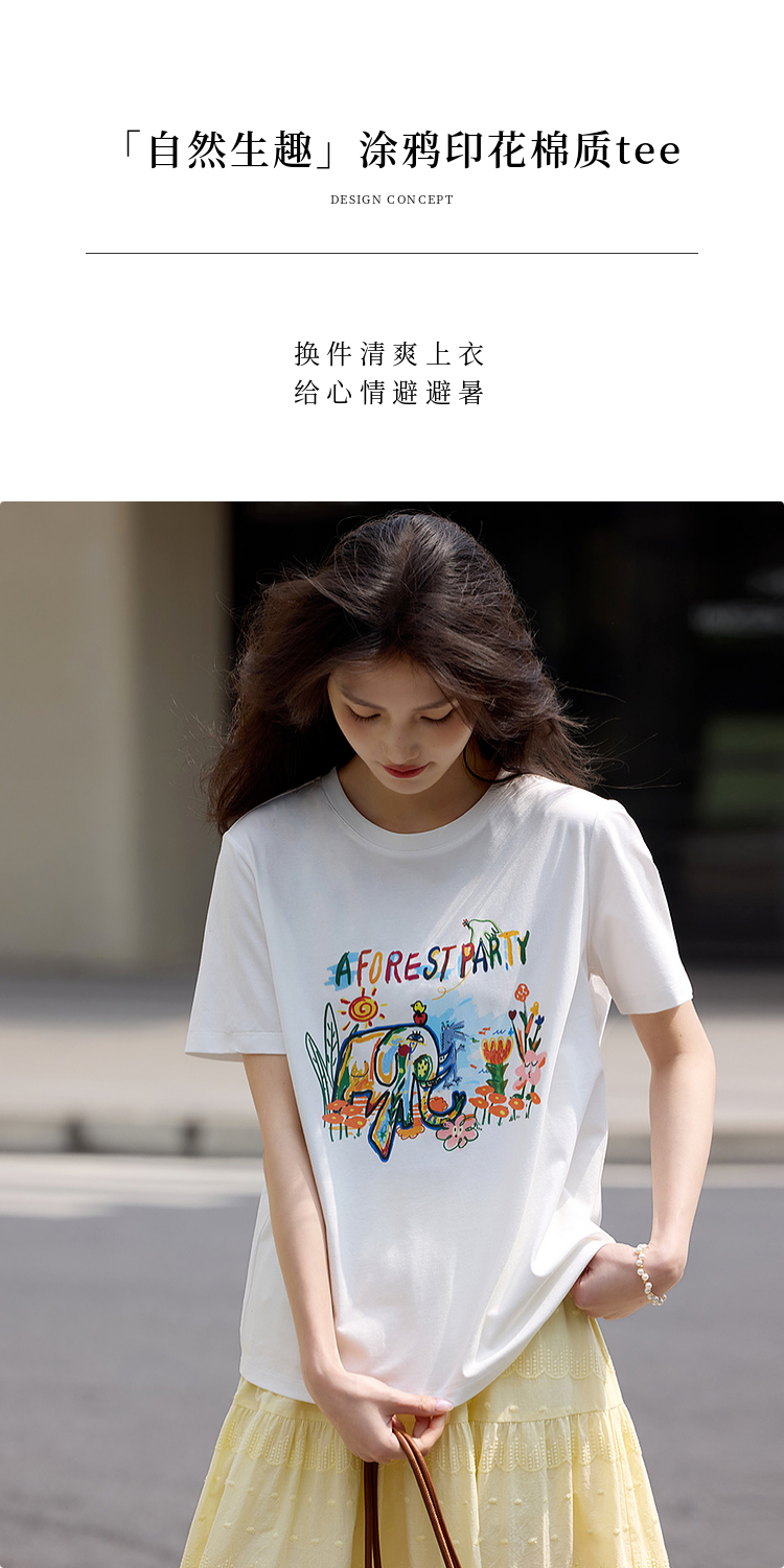 【专属特价】熙世界休闲涂鸦印花T恤女短袖宽松圆领正肩上衣ins潮2025夏日新款