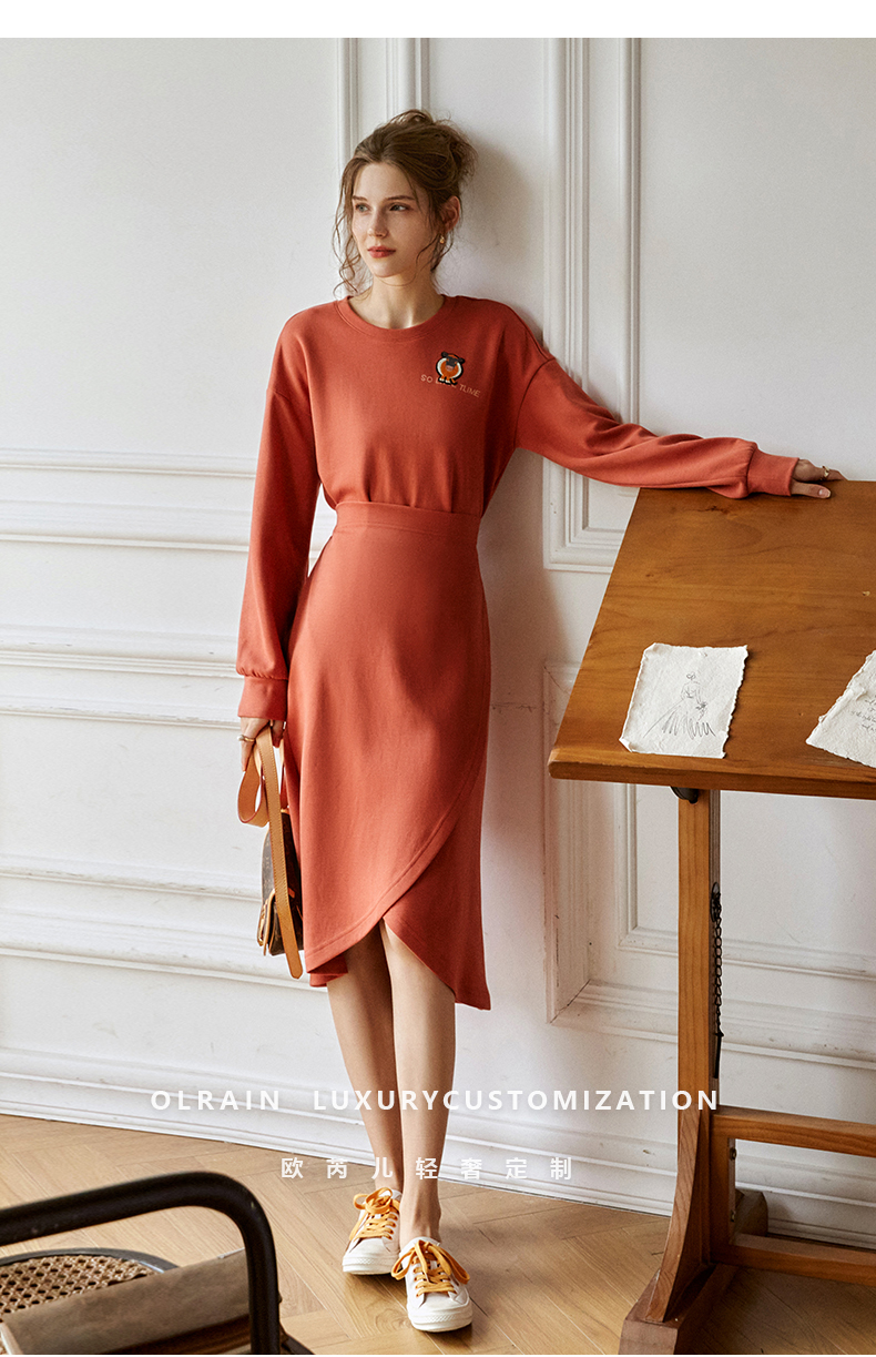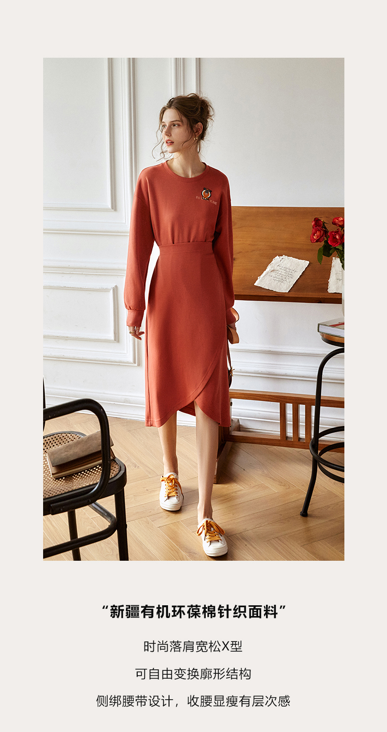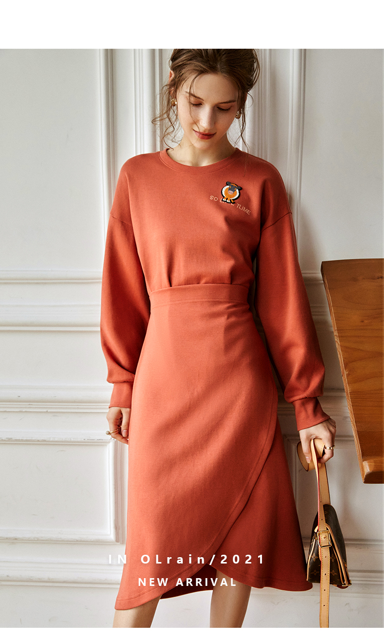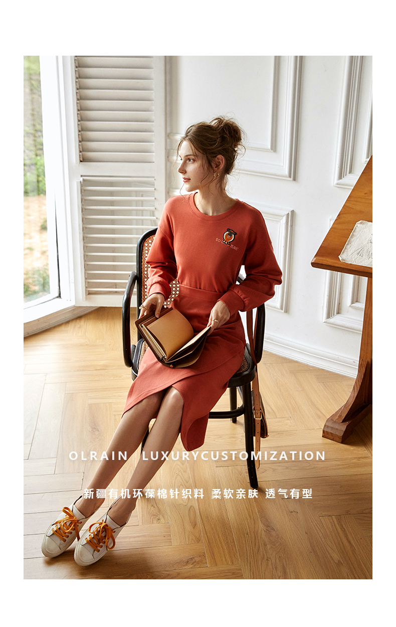 欧芮儿针织连衣裙女春秋2021新款高腰显瘦时尚不规则设计感卫衣裙