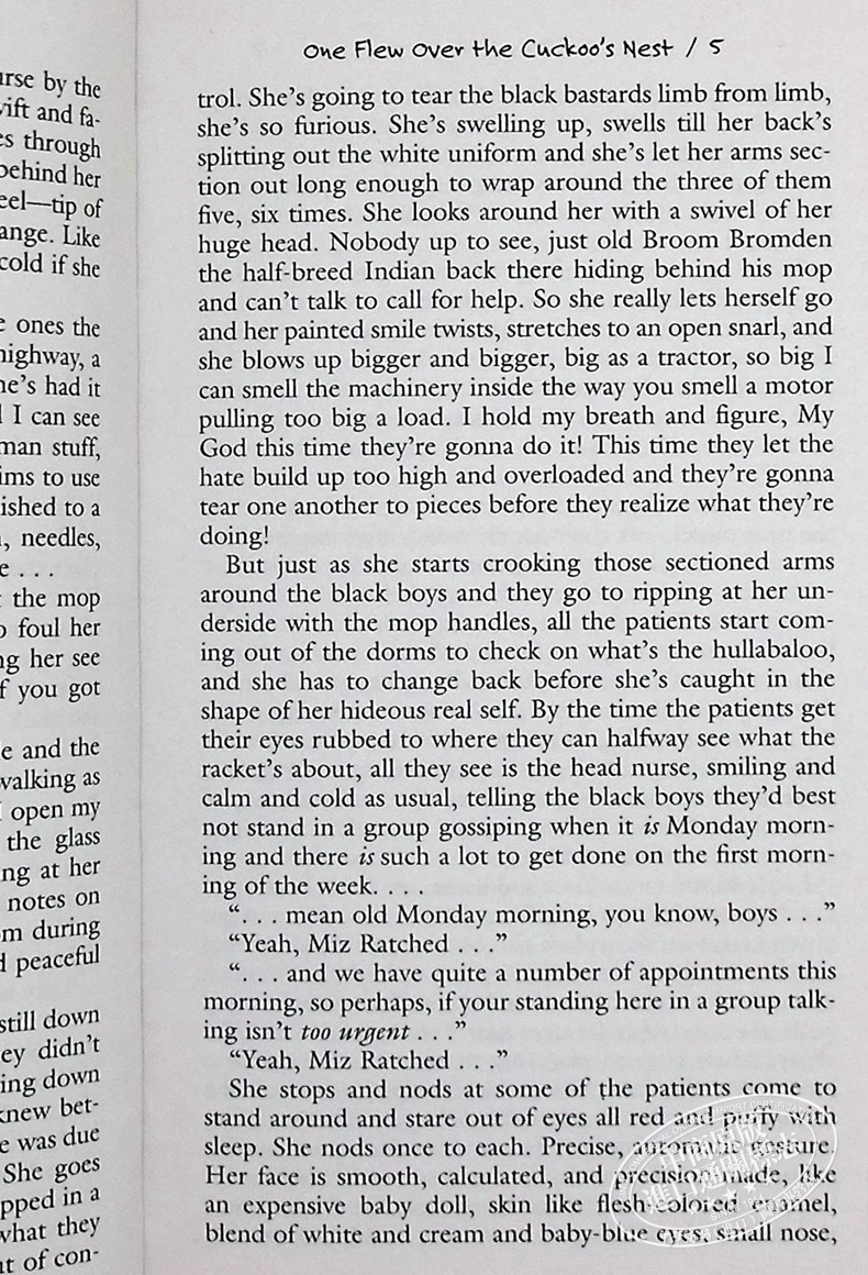 In this classic novel of the 1960's, Ken Kesey's hero is Randle Patrick McMurphy, a boisterous, brawling, fun-loving rebel who swaggers into the world of a mental hospital and takes over. A lusty, life-affirming fighter, McMurphy rallies the other patients around him by challenging the dictatorship of Big Nurse. He promotes gambling in the ward, smuggles in wine and women, and openly defies the rules at every turn. But this defiance, which starts as a sport, soon develops into a grim struggle, an all-out war between two relentless opponents: Big Nurse, backed by the full power of authority...McMurphy, who has only his own indomitable will. What happens when Big Nurse uses her ultimate weapon against McMurphy provides the story's shocking climax.